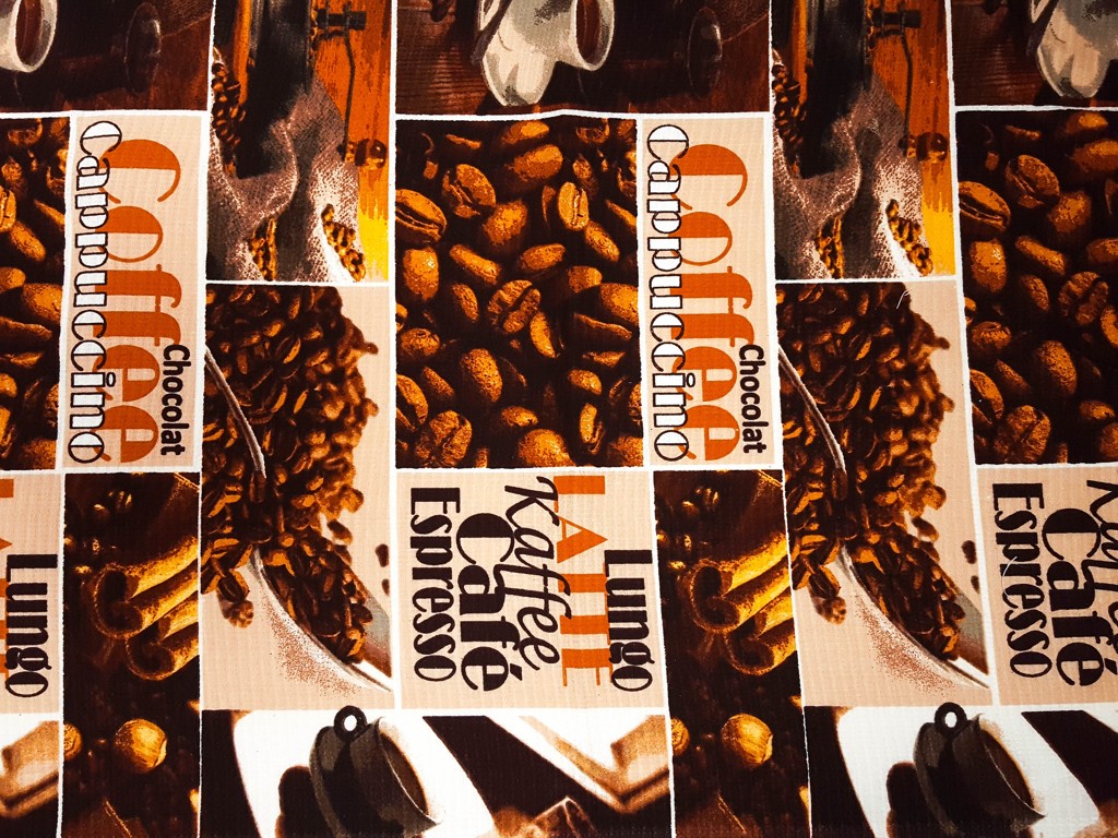 Bavlnené piké vynikne vďaka motívom latte machiatto, kávy  hlavne v kuchyni. Môžete z neho ušiť utierky, prestierania alebo behúň.