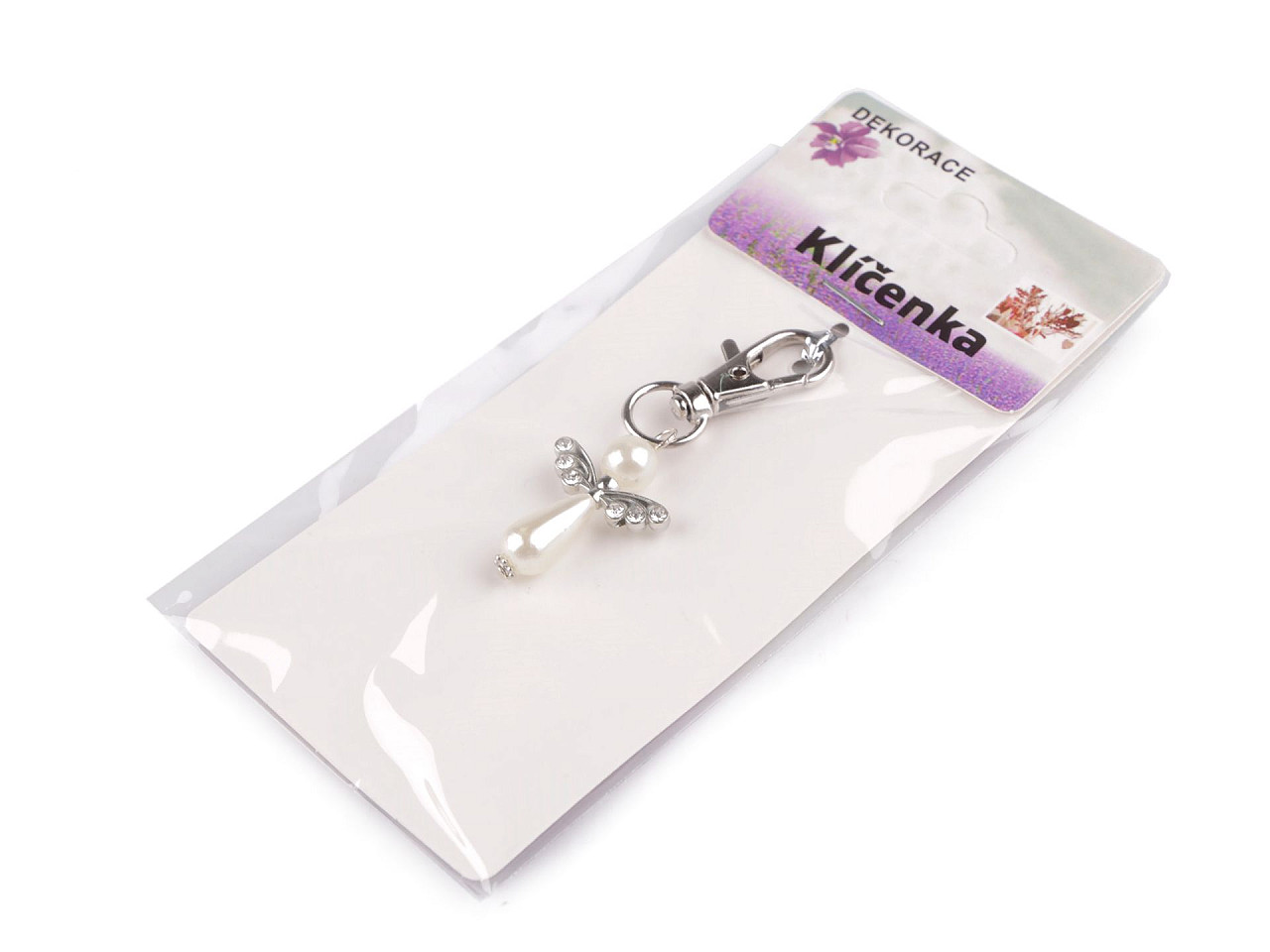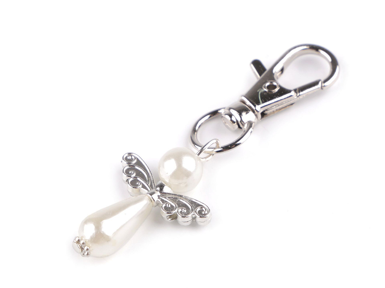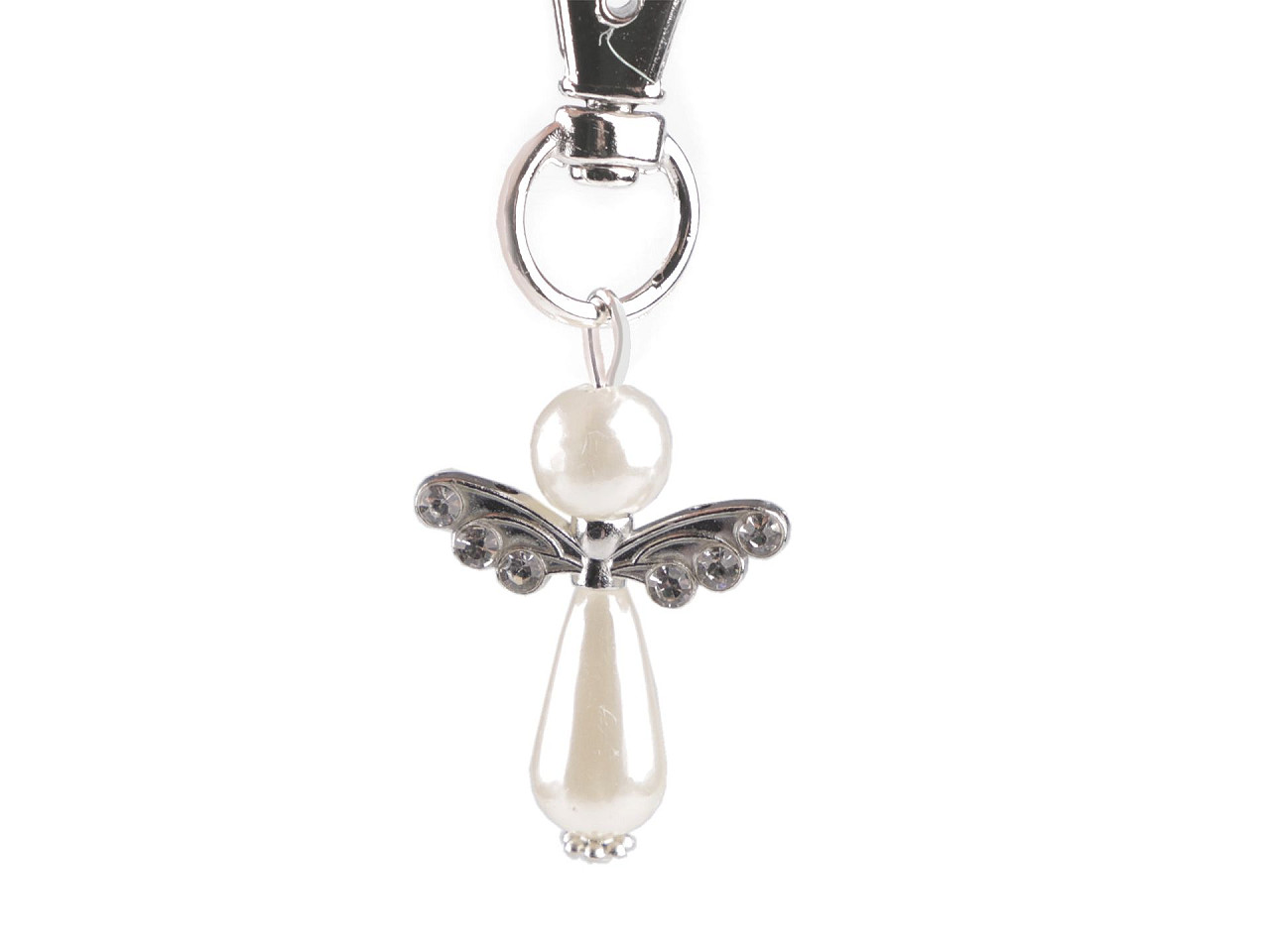 Anjelský prívesok z perlových korálikov je darčekom pre šťastie, ktorý sa dá využiť na akúkoľvek príležitosť. Je zavesený na otočnej karabíne , bude krásnou ozdobou kľúčov, kabelky a pod. Samotná karabína je dlhá 3 cm. Celková dĺžka prívesku je 6,4 cm. Anjelik má rozmery 2 x 2,7 cm. Prívesok je zabalený na karte v sáčku, karta má otvor na zavesenie na predajný stojan.