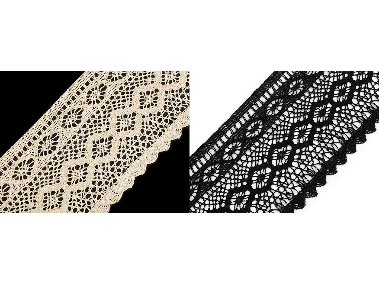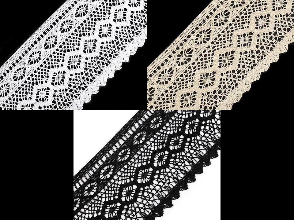 Široká paličkovaná čipka vdýchne vašim výrobkom nádych vintage štýlu. Jednu stranu má rovnú, druhú zdobia oblúčiky.