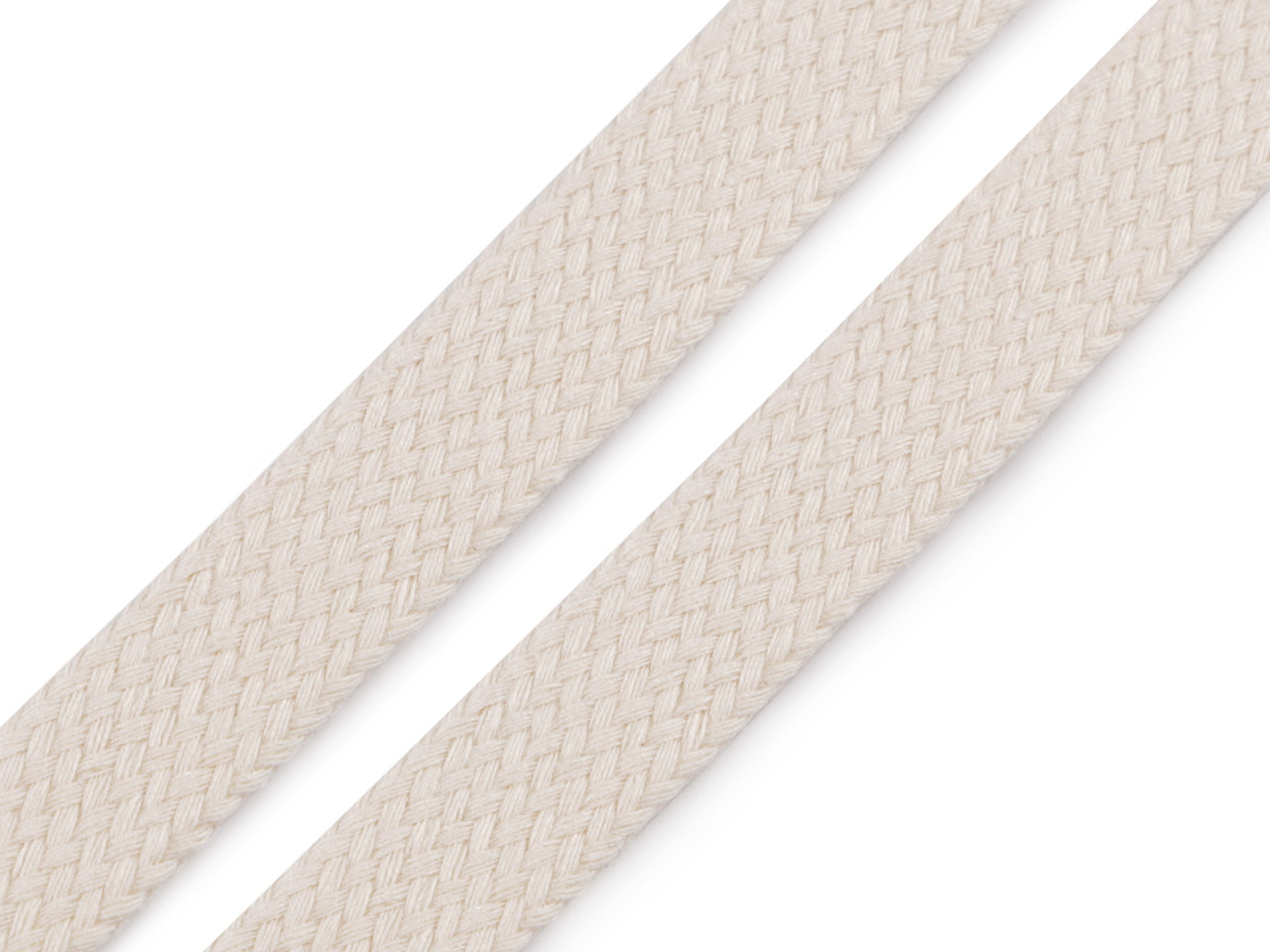 Prírodná plochá šnúra zo 100% bavlny je vhodná na výrobu konfekcie. Má tvar plochej dutinky, je pevná a odolná . Použijete ju napríklad do tunela mikín a teplákov. Môže byť tiež využitá na výrobu tašiek, batohov či dekoratívnych predmetov do domácnosti. Je ideálna pre projekty vyžadujúce prírodný vzhľad a ekologický materiál. Upozorňujeme zákazníkov, že vzhľadom na technológiu výroby sa šírka šnúry môže líšiť od 18 do 20 mm.