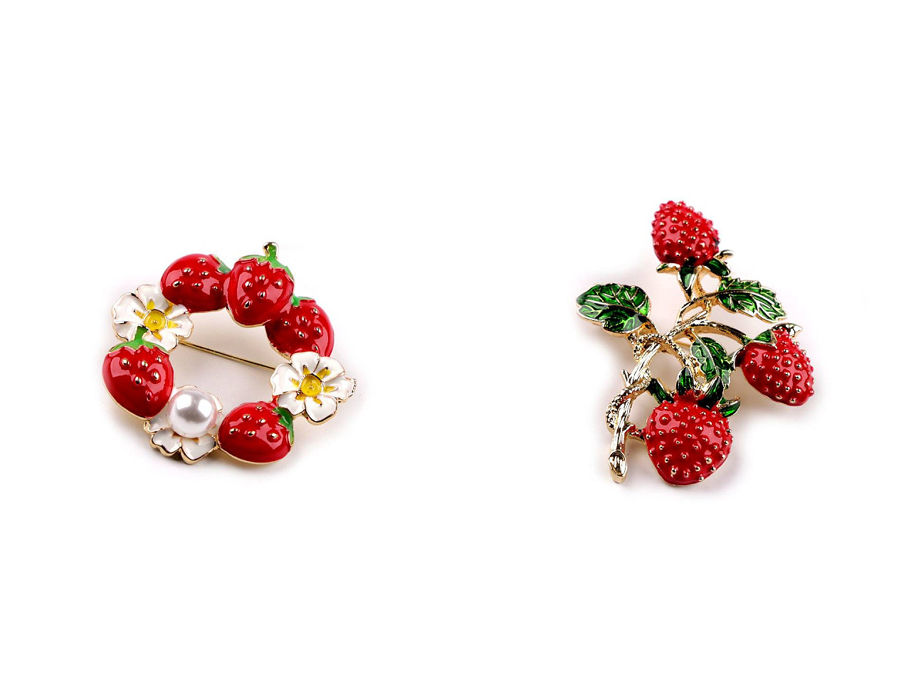 Kovová brošňa s jahodami si vás získa svojim sviežim dizajnom . Je ozdobená farebným smaltom, hravo skrášli odevy aj doplnky ako sú kabelky, klobúky, šatky a pod. Zapína sa pomocou brošňového špendlíka. Brošňa je na plastovej karte, ktorá sa dá zavesiť na predajné stojany.
