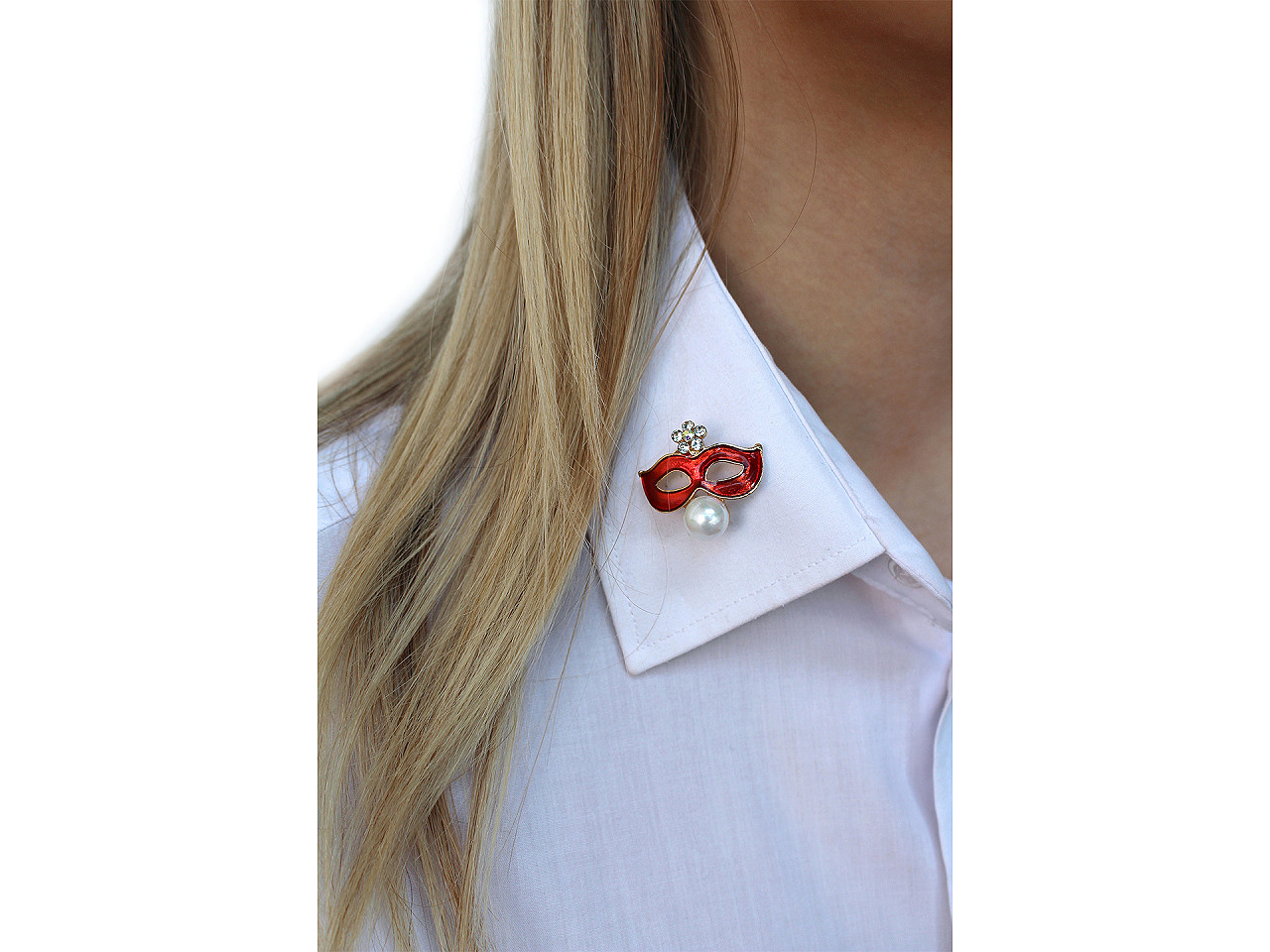 Kovová brošňa s elegantnou maskou je originálnym módnym doplnkom. Je ozdobená perlou a kvetinou z brúsených korálikov. Tento nápaditý šperk môžete nosiť k rôznym outfitom, či už ide o večerné šaty alebo ležérne denné oblečenie. Môžete ju nosiť aj na klobúkoch, taškách či s ňou môžete zopnúť šatku. Vzadu má brošňový špendlík. Brošňa je na plastovej karte, ktorá sa dá zavesiť na predajné stojany.