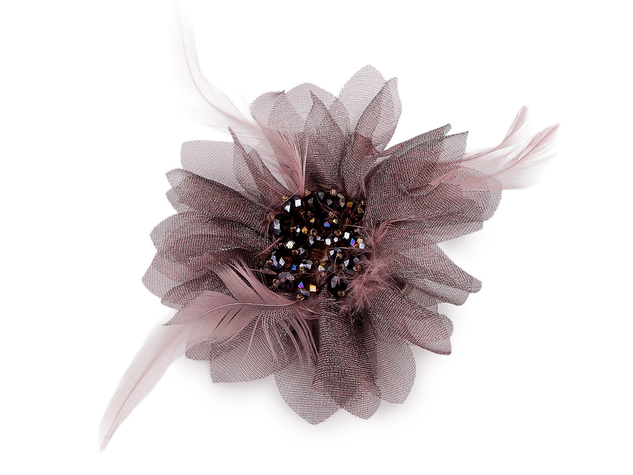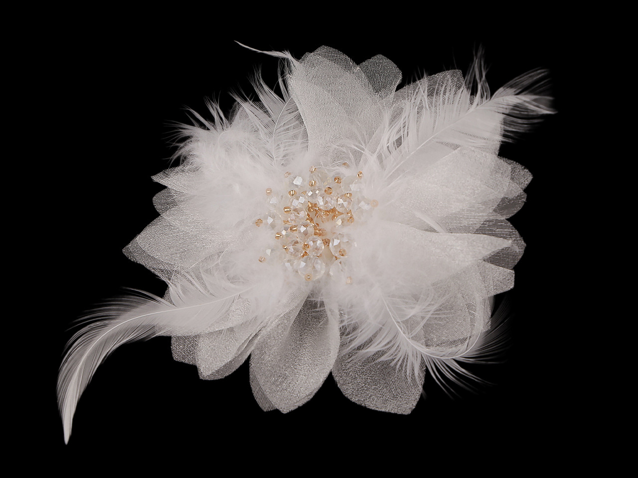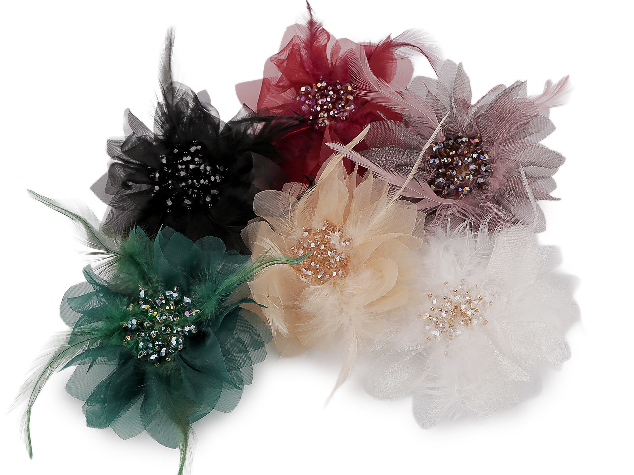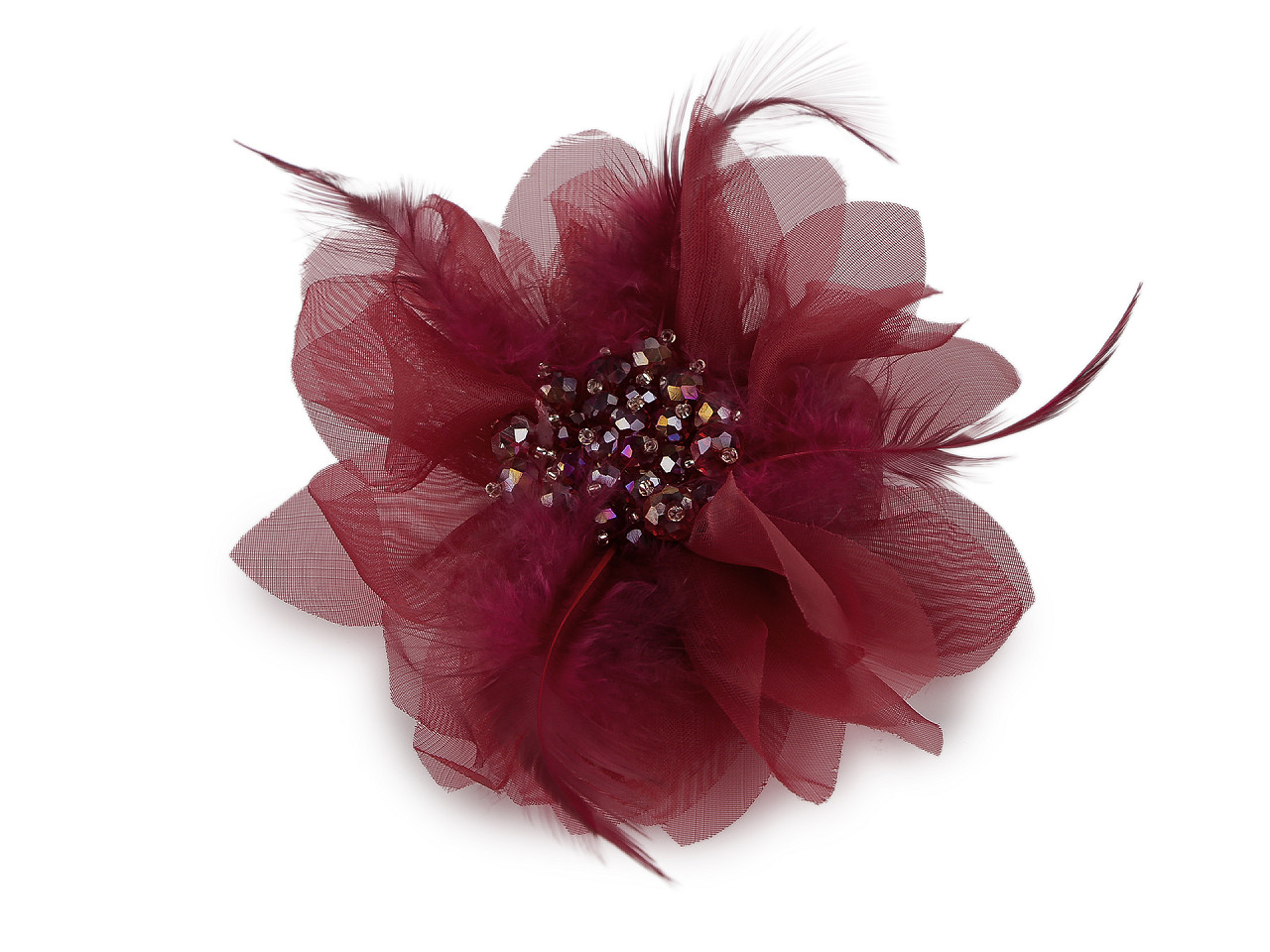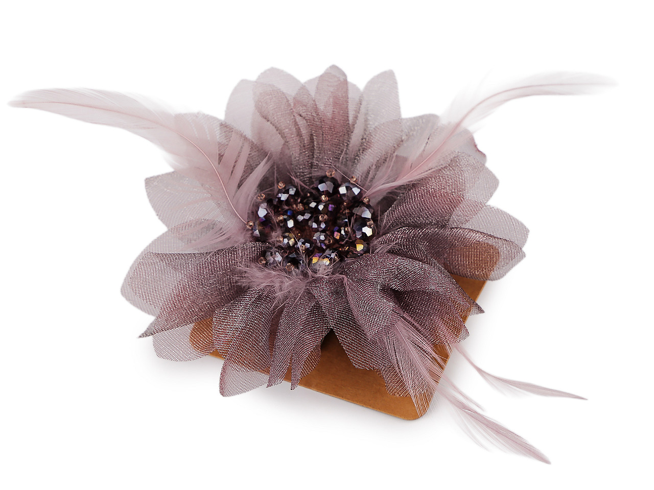 Veľká elegantná brošňa je vyrobená z jemného šifónu, ktorý pripomína kvetinu, a jej stred je zdobený perím a trblietavými brúsenými korálikmi , ktoré jej dodávajú luxusný vzhľad. V spodnej časti má spínací špendlík a klips , takže ju môžete pripevniť ako na odev, tak do vlasov. Brošňou môžete ozdobiť šaty, blúzku, sako, kabát, klobúk aj kabelku. Vo vlasoch bude pôsobiť romanticky.