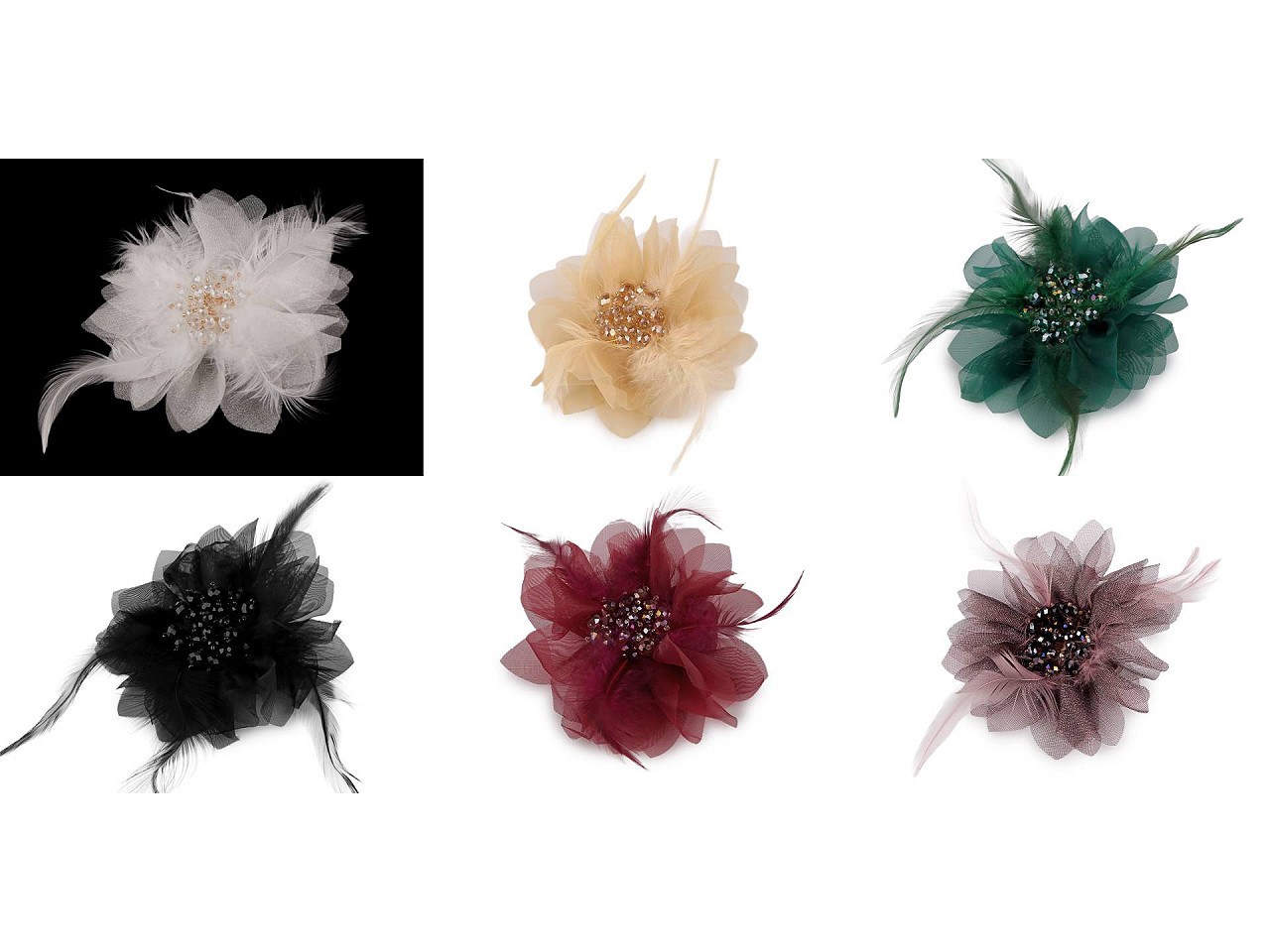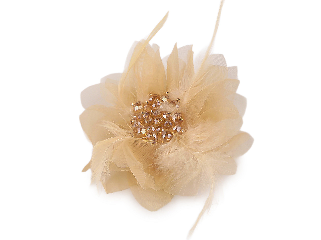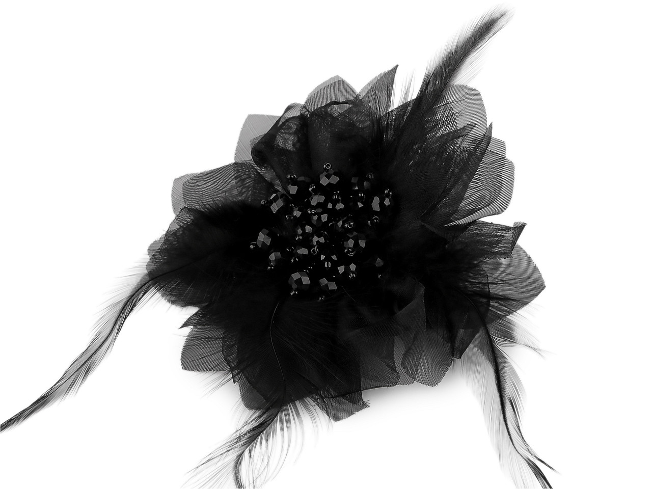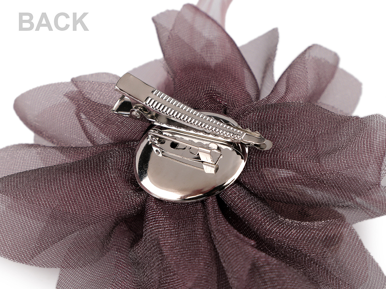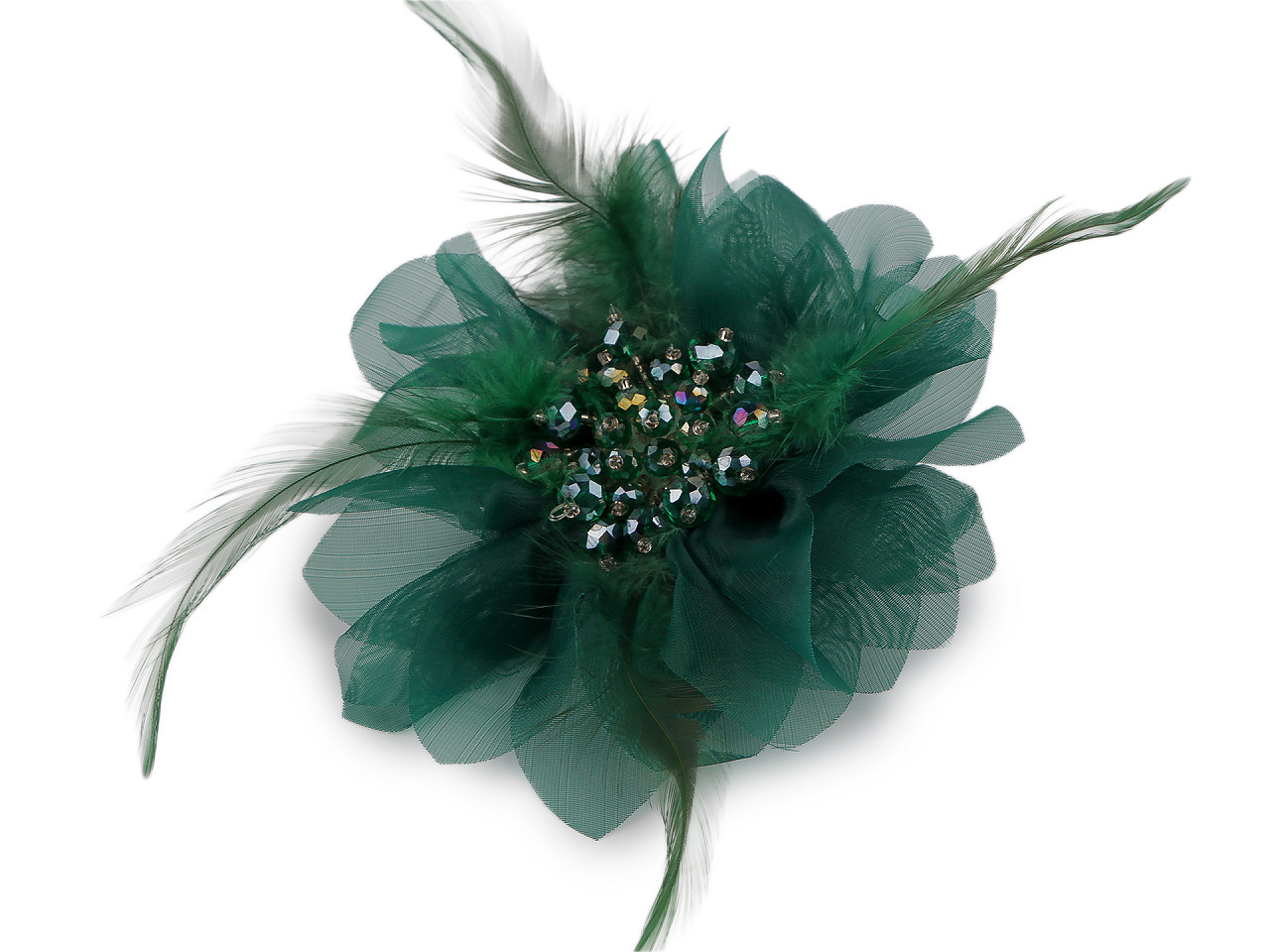 Veľká elegantná brošňa je vyrobená z jemného šifónu, ktorý pripomína kvetinu, a jej stred je zdobený perím a trblietavými brúsenými korálikmi , ktoré jej dodávajú luxusný vzhľad. V spodnej časti má spínací špendlík a klips , takže ju môžete pripevniť ako na odev, tak do vlasov. Brošňou môžete ozdobiť šaty, blúzku, sako, kabát, klobúk aj kabelku. Vo vlasoch bude pôsobiť romanticky.