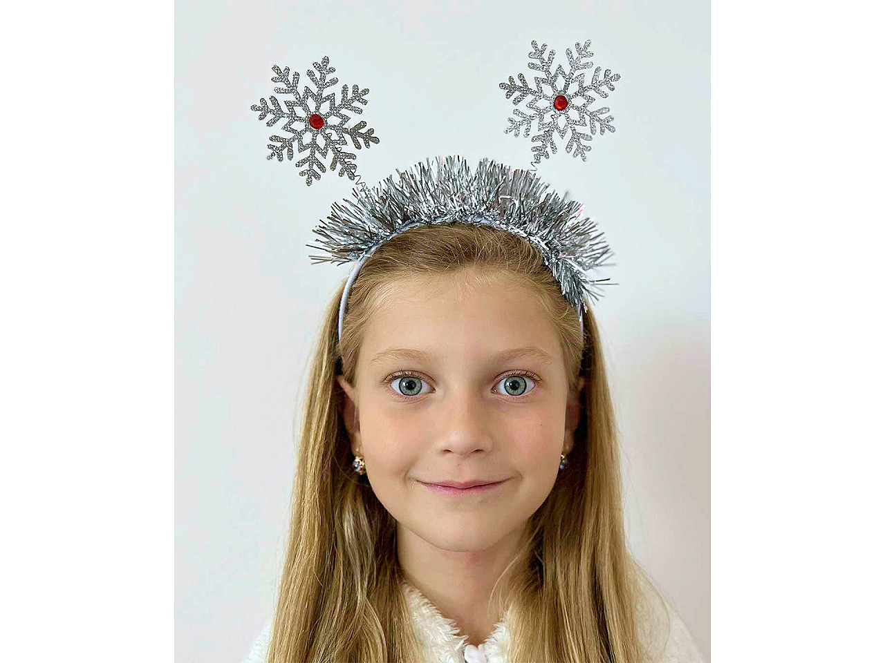 Čelenka s trblietavými vločkami je pôsobivým doplnkom na vianočné večierky, zábavu, karneval, rodinné stretnutia, školské predstavenia alebo na Silvestra. Skvele sa hodí aj do fotokútika. Vločky sú na pružinke a z prednej strany majú glitre . Ďalej čelenku zdobia lesklé lamety . Výška vločiek pri variante č. 1 je 7 cm. Výška vločiek pri variante č. 2 je 11 cm.