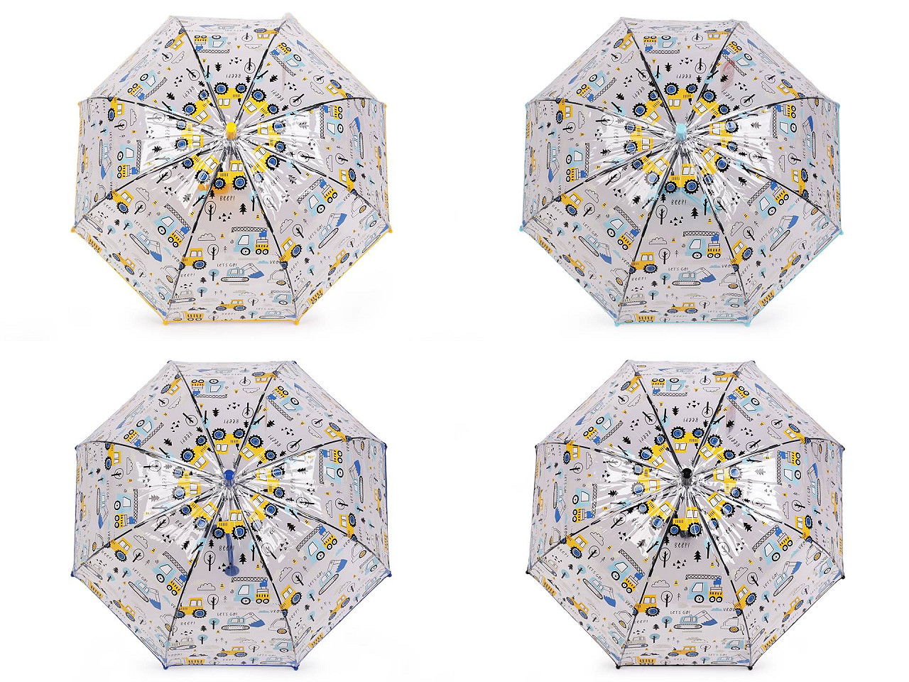 Detský vystreľovací dáždnik s farebnou potlačou autíčok chlapcov nadchne, pretože vďaka priehľadnému poťahu uvidia von. Navyše je dosť hlboký, budú mať pocit, že sú celí schovaní. Dáždnik je vystreľovací , má klasickú tyč zakončenú pevnou rukoväťou. Konštrukcia dáždnika je z pružných lamiel a tvorí osem polí. Konce lamiel sú zakončené plastovými guličkami - zmenšujú riziko poranenia. Dáždnik má klasické zapínanie na patentku. Hĺbka dáždnika je 30 cm.