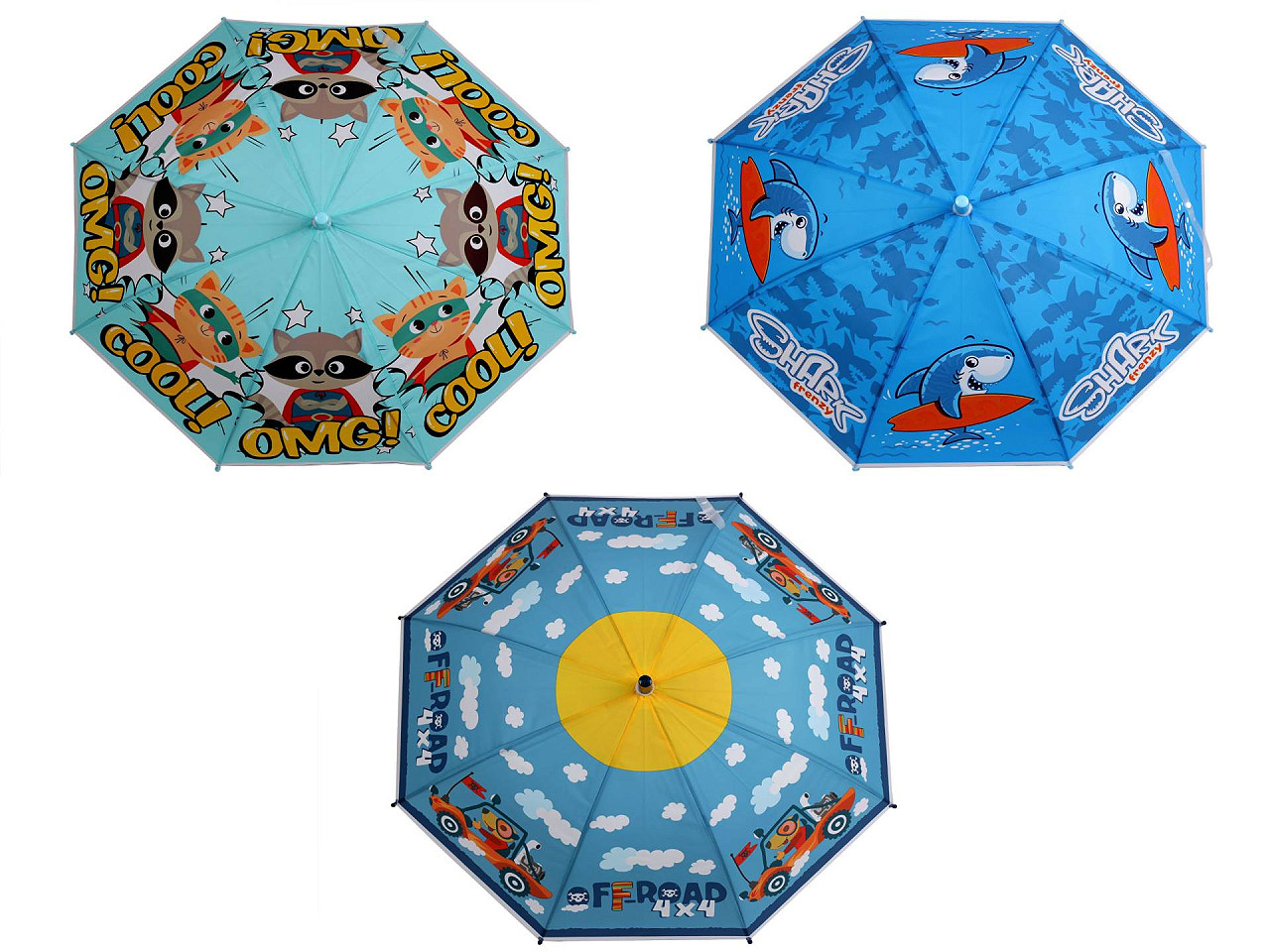 Chlapčenský vystreľovací dáždnik s pestrofarebnou potlačou. Dáždnik má klasickú tyč zakončenú pevnou rukoväťou. Rukoväť je vhodná pre detskú ruku. Konštrukcia dáždnika je z pružných lamiel a tvorí osem polí. Drôty sú zakončené plastovými koncovkami - zmenšujú riziko poranenia. Dáždnik má klasické zapínanie na patentku. Hĺbka dáždnika je 22 cm.
