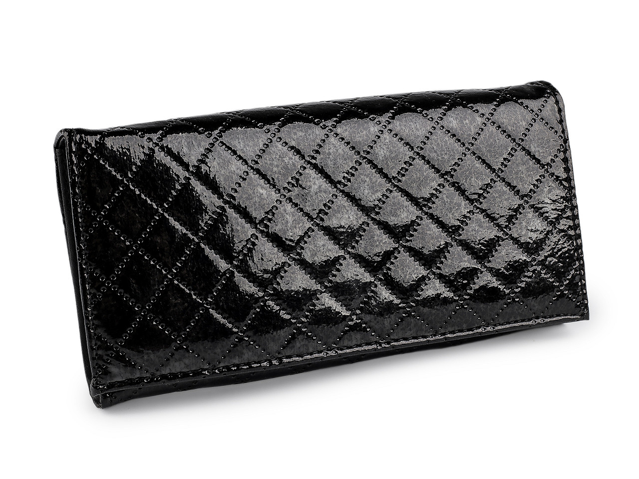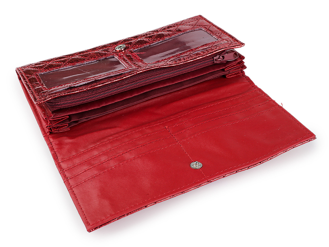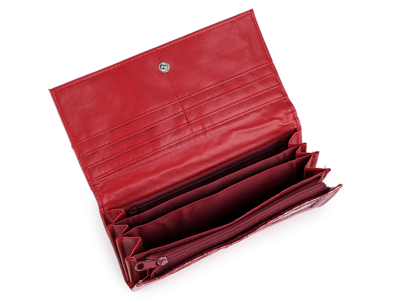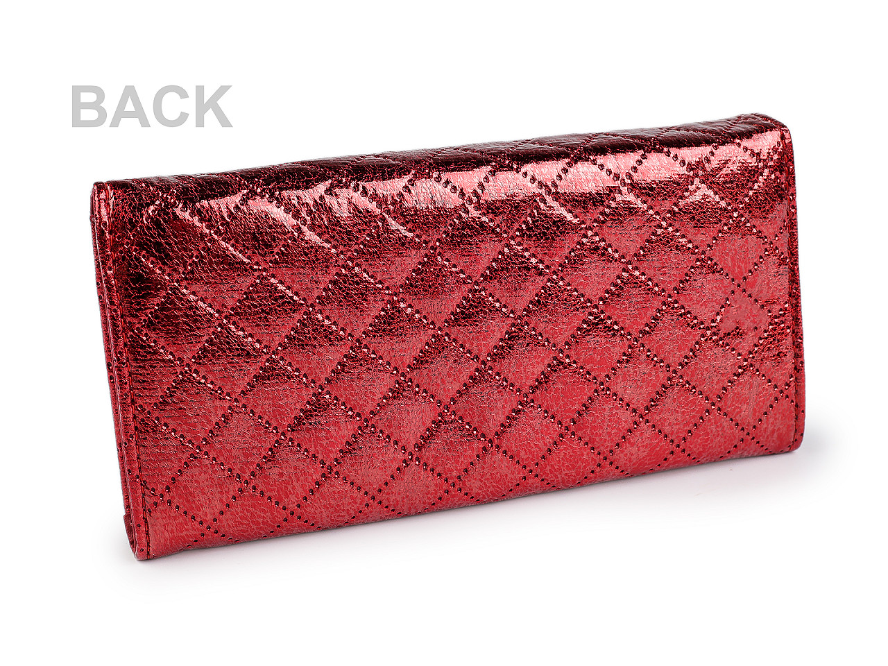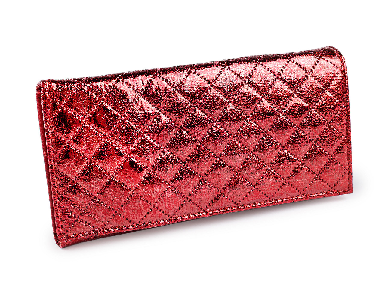 Metalická peňaženka ponúka praktické usporiadanie priestoru pre bankovky, mince a platobné karty. Jej povrch je ozvláštnený tepelnou perforáciou. Prednú stranu má na klopu so zapínaním na patent. Po otvorení sa objaví 8 priehradiek na kreditné karty, 2 sú priehľadné. Za priehradkami po pravej strane je dlhá priehradka. Po roztvorení nájdete 3 veľké vrecká rozdelené separáciou a 1 vrecko na zips. Ďalšie vrecko na zips slúži ako mincovník. Peňaženka č. 4 - čierna - je lesklá, bez metalického povrchu.