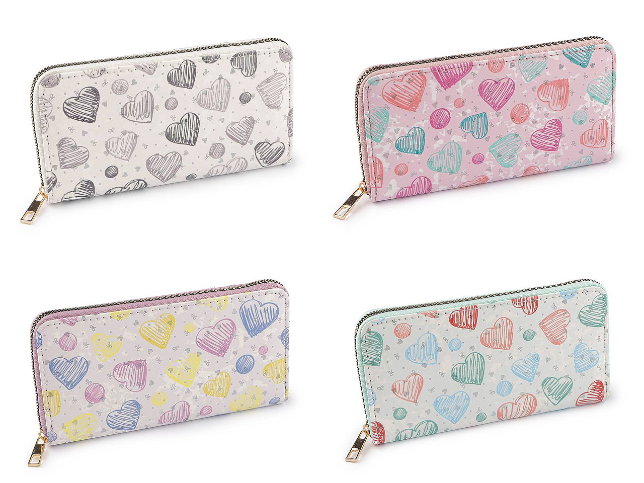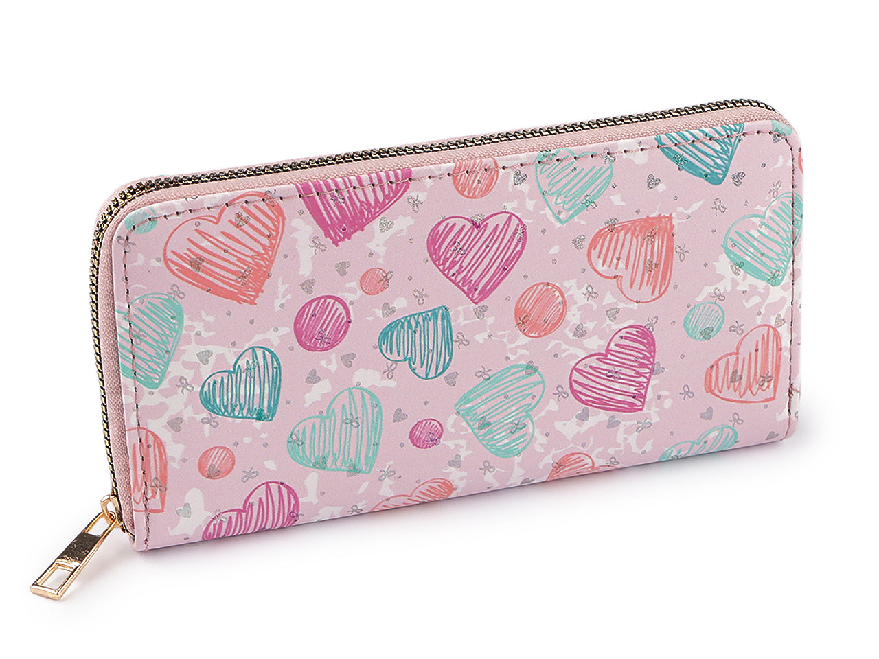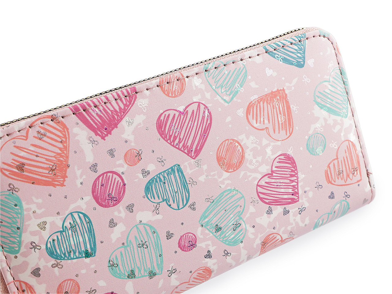 Peňaženka s potlačou srdiečok je elegantným a štýlovým doplnkom. Upúta pozornosť aj vďaka svojmu ligotu, ktorý spôsobujú malé metalické srdiečka a mašličky v potlači . Peňaženka obsahuje jedno hlavné vrecko, ktoré sa zapína na kovový zips. Vnútri je peňaženka členená do troch veľkých priehradiek na papierové bankovky a jedného uzatvárateľného vrecka na zips , vhodného na ukladanie mincí a rôznych drobností. Po vnútorných stranách peňaženky sú priehradky na karty a dve väčšie na doklady, účtenky a pod.