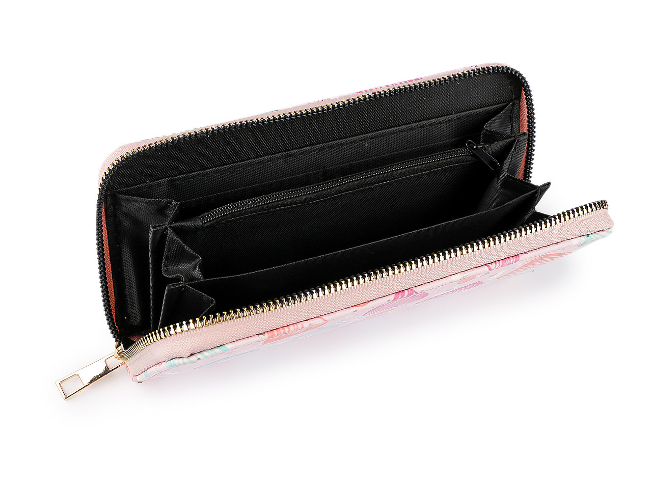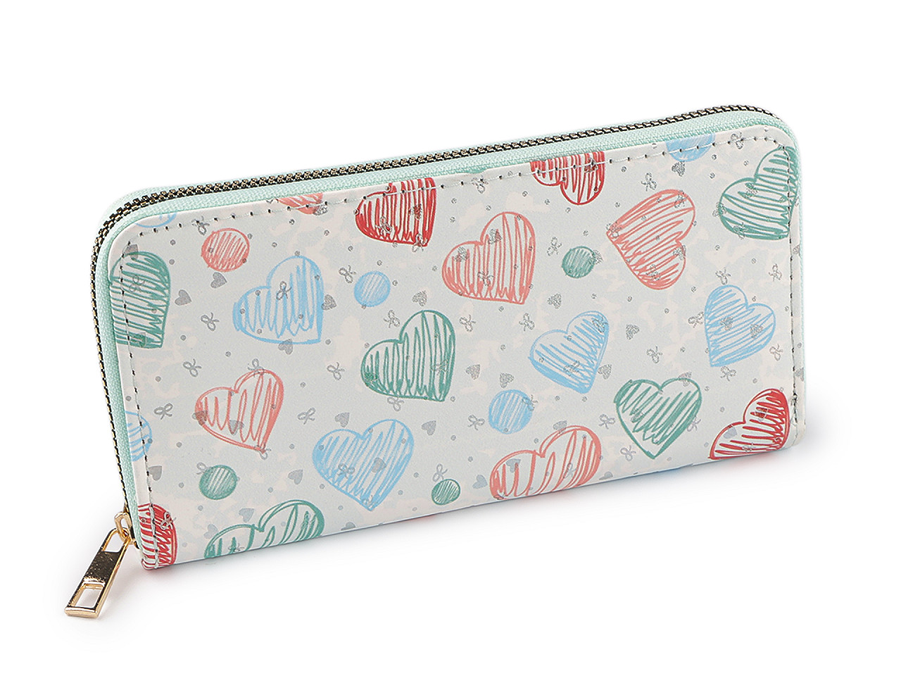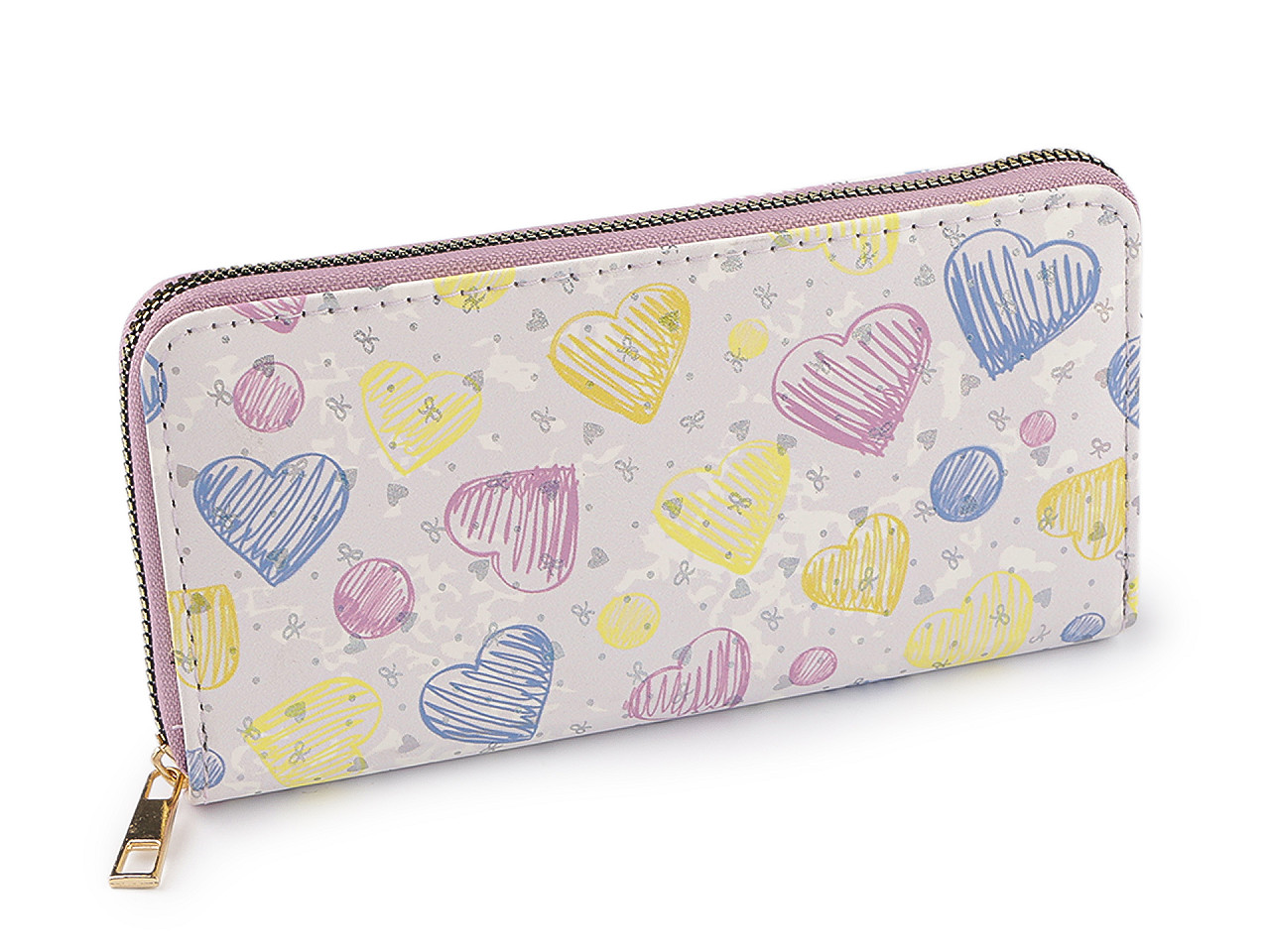 Peňaženka s potlačou srdiečok je elegantným a štýlovým doplnkom. Upúta pozornosť aj vďaka svojmu ligotu, ktorý spôsobujú malé metalické srdiečka a mašličky v potlači . Peňaženka obsahuje jedno hlavné vrecko, ktoré sa zapína na kovový zips. Vnútri je peňaženka členená do troch veľkých priehradiek na papierové bankovky a jedného uzatvárateľného vrecka na zips , vhodného na ukladanie mincí a rôznych drobností. Po vnútorných stranách peňaženky sú priehradky na karty a dve väčšie na doklady, účtenky a pod.
