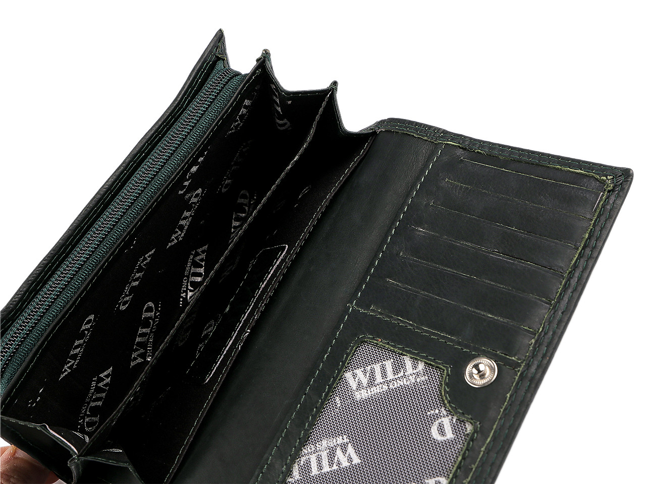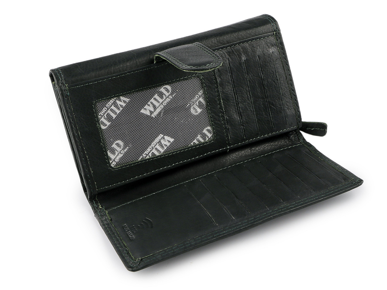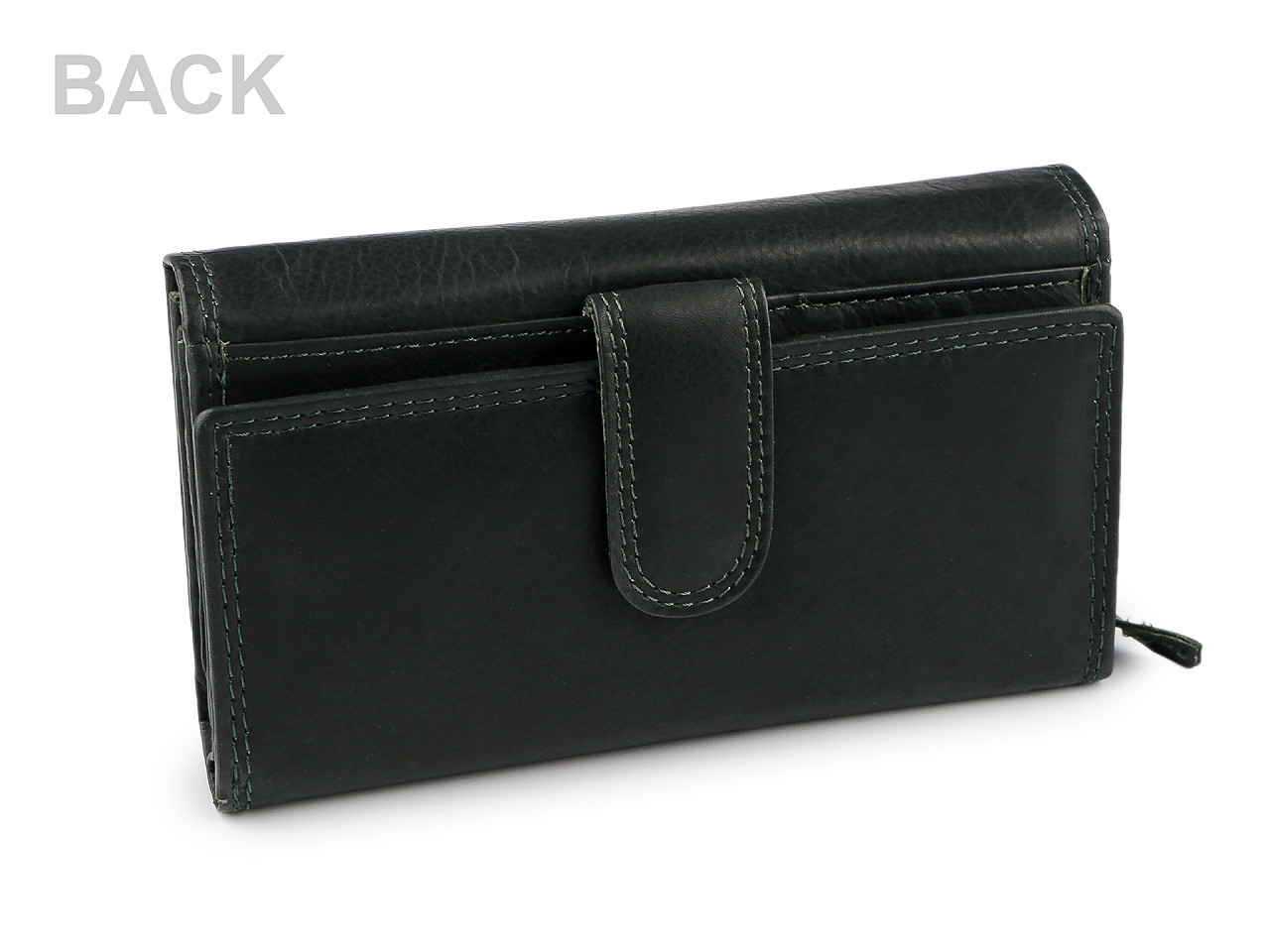 Dámska kožená peňaženka má veľmi kvalitné prevedenie a šikovný dizajn . Je veľmi príjemná na dotyk , disponuje RFID ochranou , ktorá zabráni nežiaducemu skopírovaniu dát z vašej karty. Peňaženka má prednú stranu na klopu na 2 patenty. Po otvorení sa objaví 7 priehradiek na kreditné karty, 1 je priehľadná. Uprostred peňaženky sú 2 dlhé priehradky a veľký rozkladací mincovník rozdelený separáciou na 2 vrecká, ktorý sa uzatvára na zips. Na zadnej strane sa peňaženka uzatvára zápinkou s patentom. Po otvorení je veľa priehradiek na kreditné karty, 1 je priehľadná a 2 dlhé ploché vrecká.