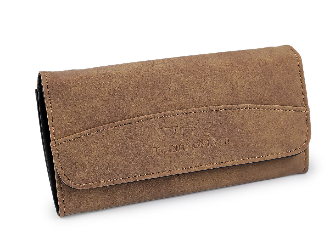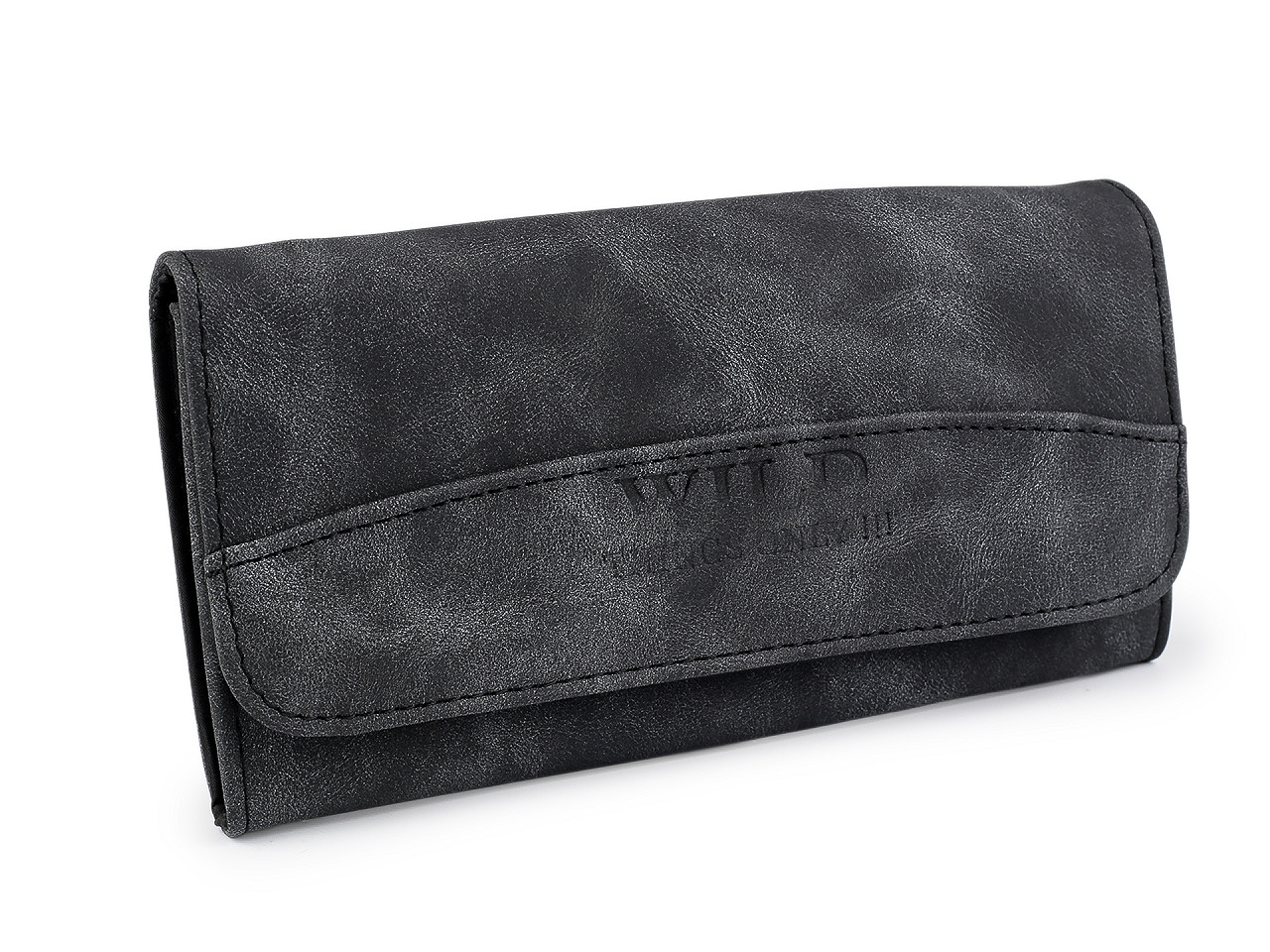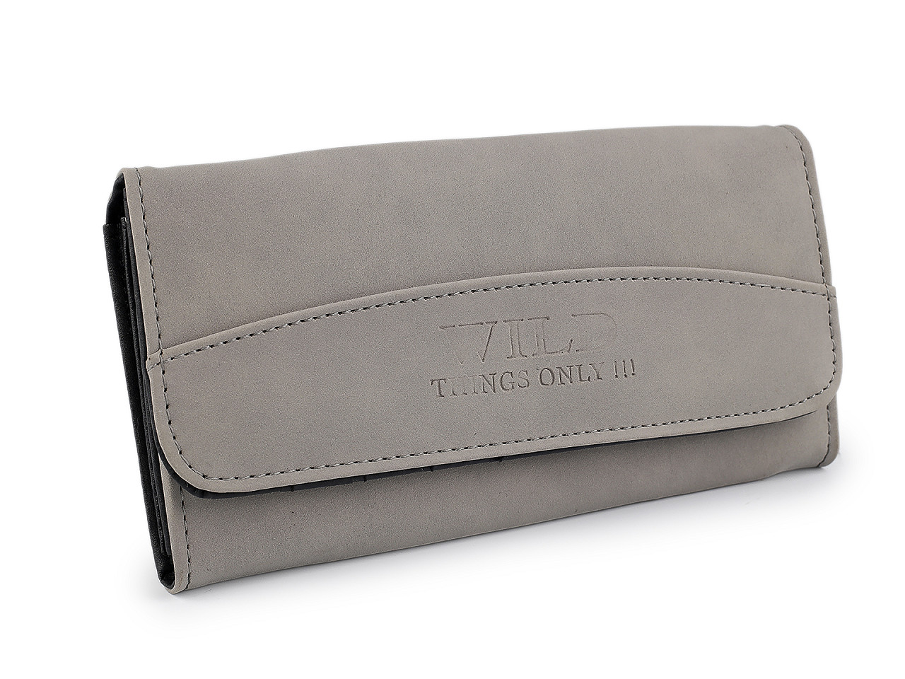 Dámska peňaženka z brúsenej eko kože má elegantný nadčasový dizajn. Stane sa vašou obľúbenou spoločníčkou, ľahko ju zladíte s akýmkoľvek štýlom oblečenia. Zatvára sa na klopu a patent. Peňaženka má celkom 4 priehradky na karty, z ktorých jedna je priehľadná. Za ňou sú umiestnené 2 dlhé priehradky, jedna z nich je na zips. Uprostred peňaženky sa nachádzajú 3 vrecká na bankovky, oddelené prepážkami. Vľavo je rozkladací mincovník rozdelený prepážkou na dva oddiely. Uzatvára sa na zips.