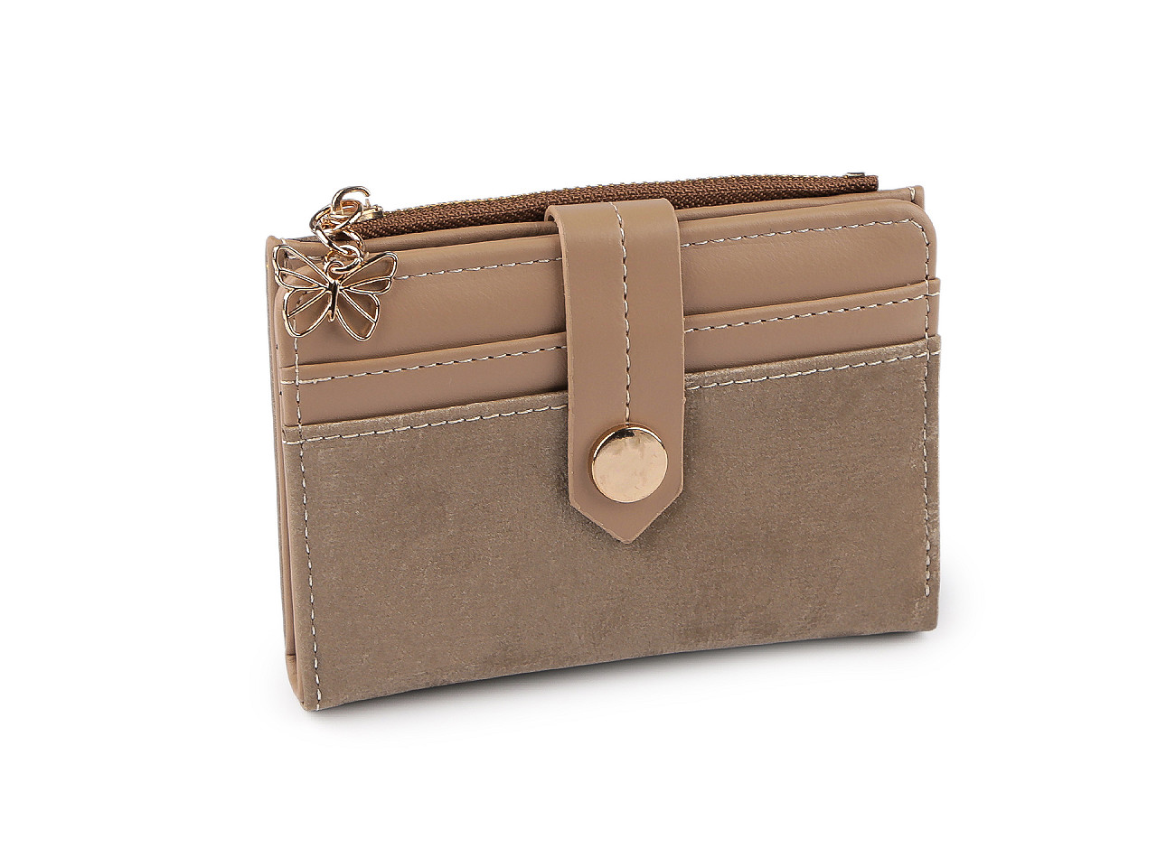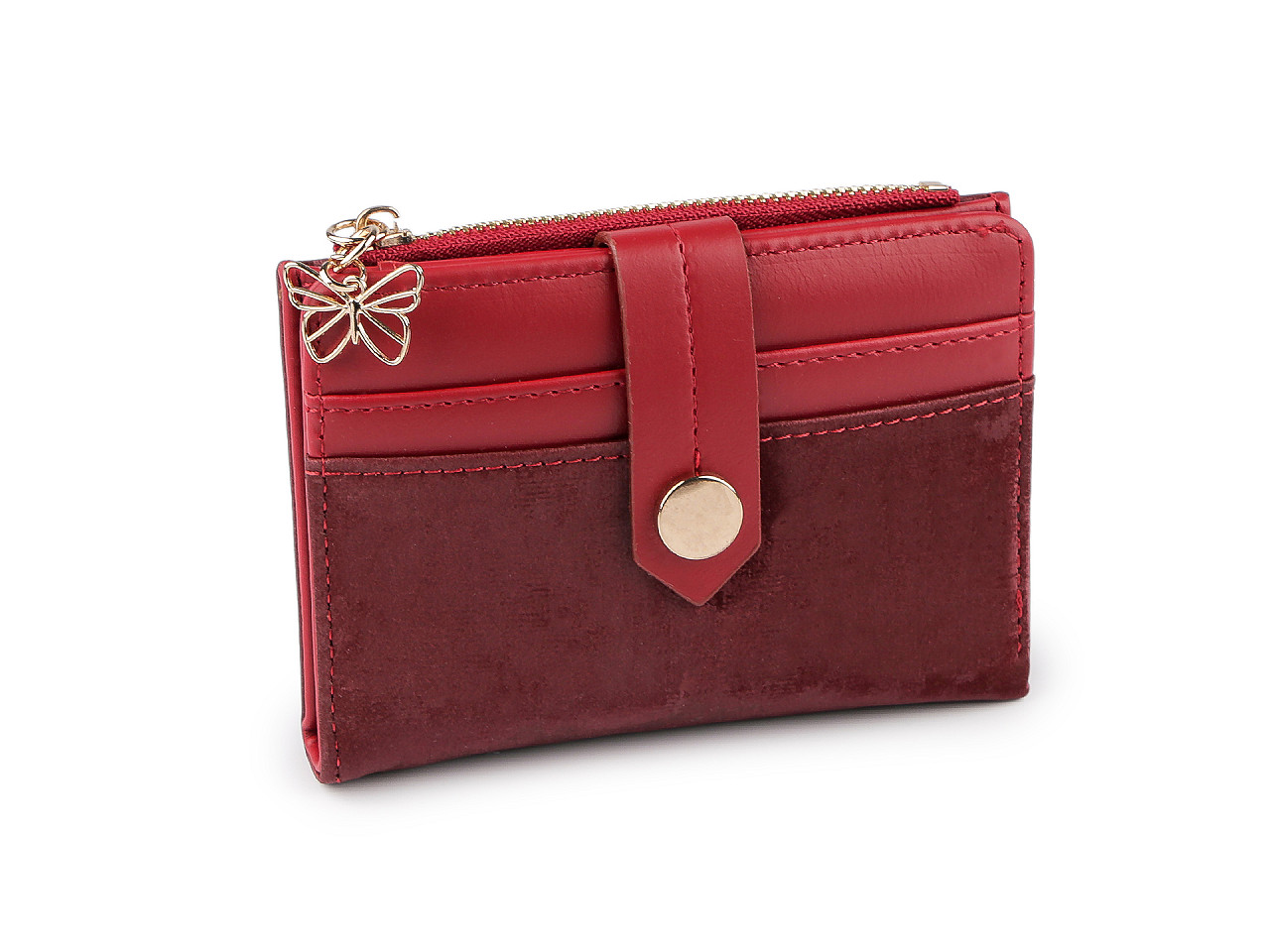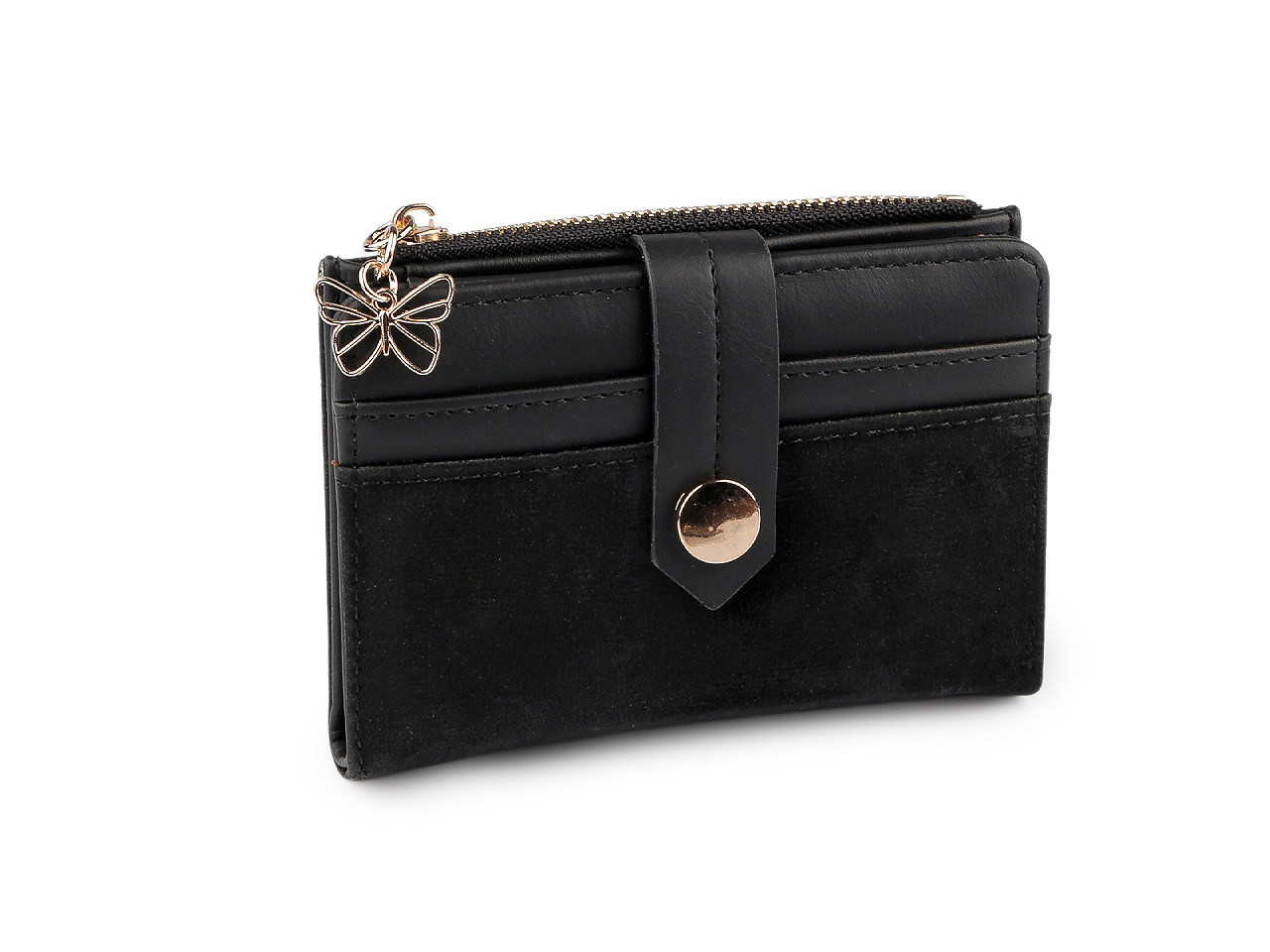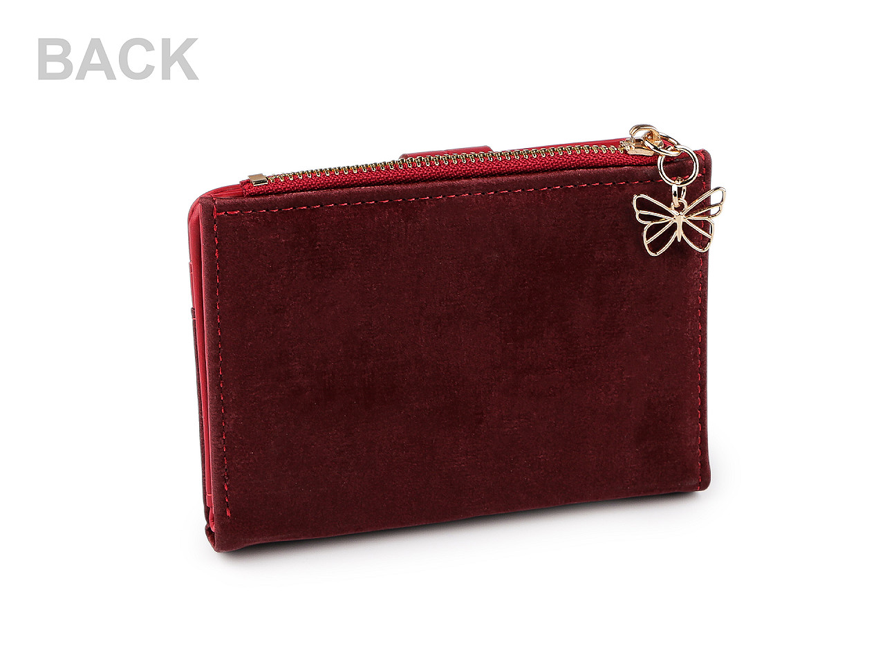 Šikovná malá peňaženka má kompaktný tvar, zmestí sa do každej kabelky. Z časti je potiahnutá elegantnou imitáciou zamatu , ktorá peňaženke pridáva luxusný vzhľad. Predná strana peňaženky sa zapína na zápinku s patentom. Vnútri nájdete 6 priehradiek na kreditné karty, z toho je jedna priehľadná a priehradku na bankovky. Vrecko na mince sa zapína na zips, je ozdobené príveskom kovového motýľa .