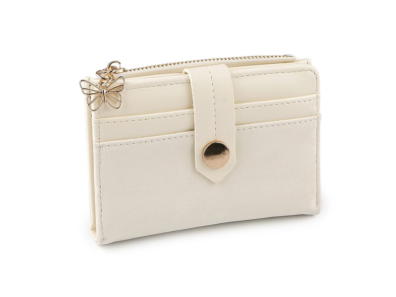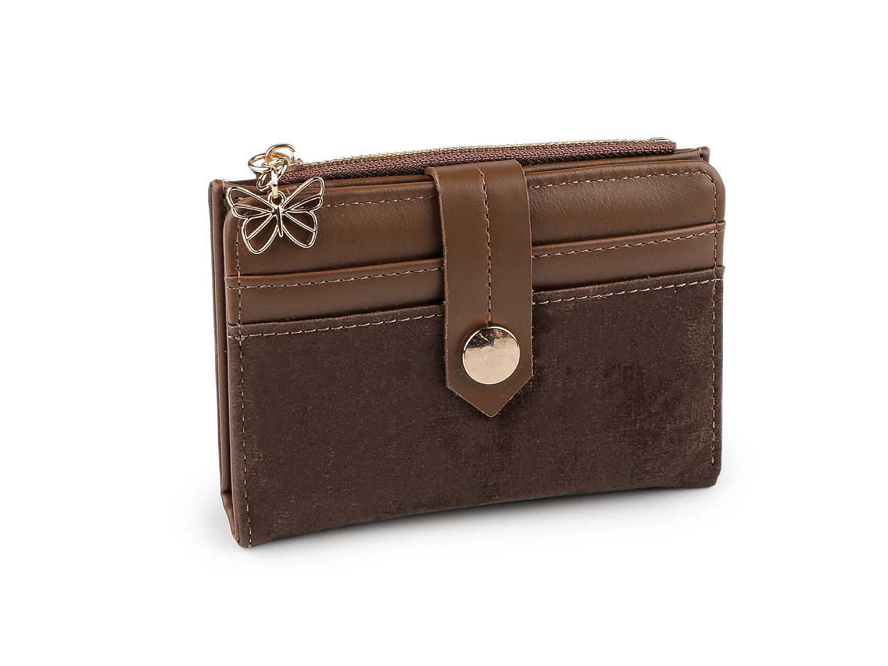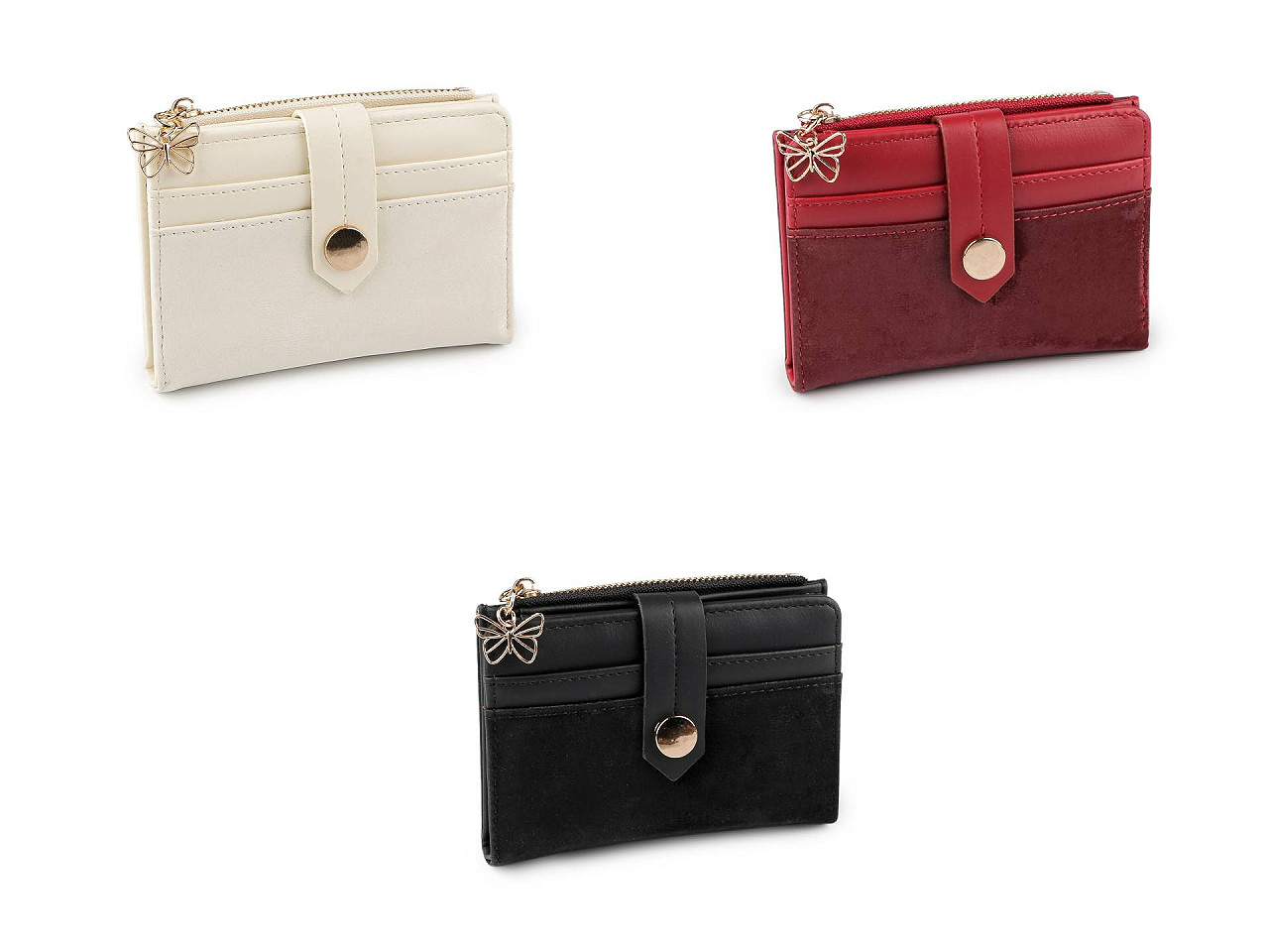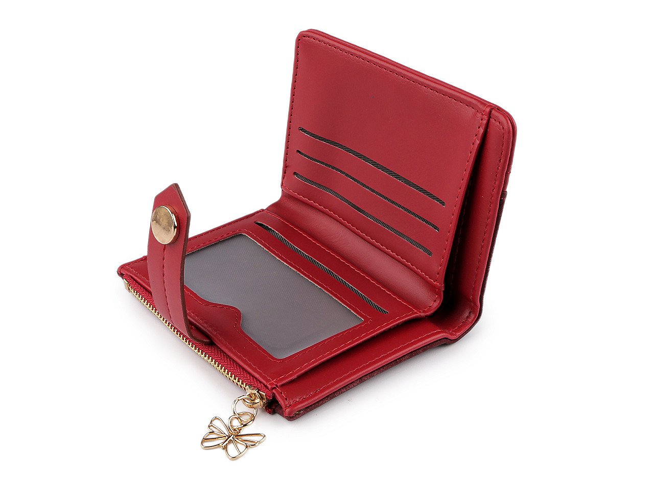 Šikovná malá peňaženka má kompaktný tvar, zmestí sa do každej kabelky. Z časti je potiahnutá elegantnou imitáciou zamatu , ktorá peňaženke pridáva luxusný vzhľad. Predná strana peňaženky sa zapína na zápinku s patentom. Vnútri nájdete 6 priehradiek na kreditné karty, z toho je jedna priehľadná a priehradku na bankovky. Vrecko na mince sa zapína na zips, je ozdobené príveskom kovového motýľa .