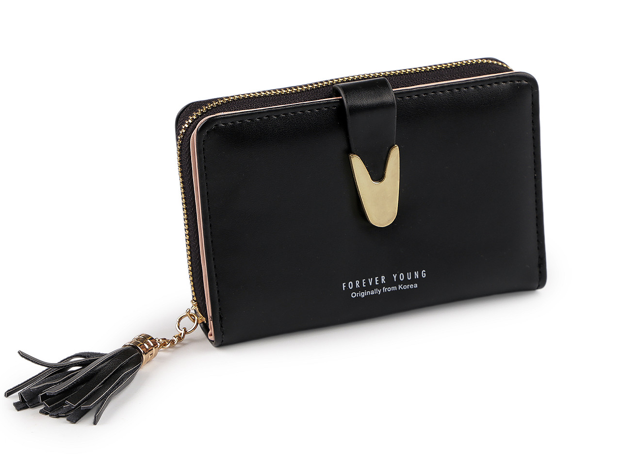 Dámska peňaženka s kovovou sponou je veľmi elegantná. Zips v zadnej časti má ozdobený strapcom. Predná časť peňaženky sa uzatvára na zápinku s kovovým patentom. Vnútri sú priehradky na kreditné karty , 1 priehľadná priehradka na doklady a dlhá priehradka na bankovky. Mincovník v zadnej časti peňaženky sa zapína na zips, vo vnútri je prepážkou rozdelený na 2 vrecká. V prepážke je malé vrecko na zips.