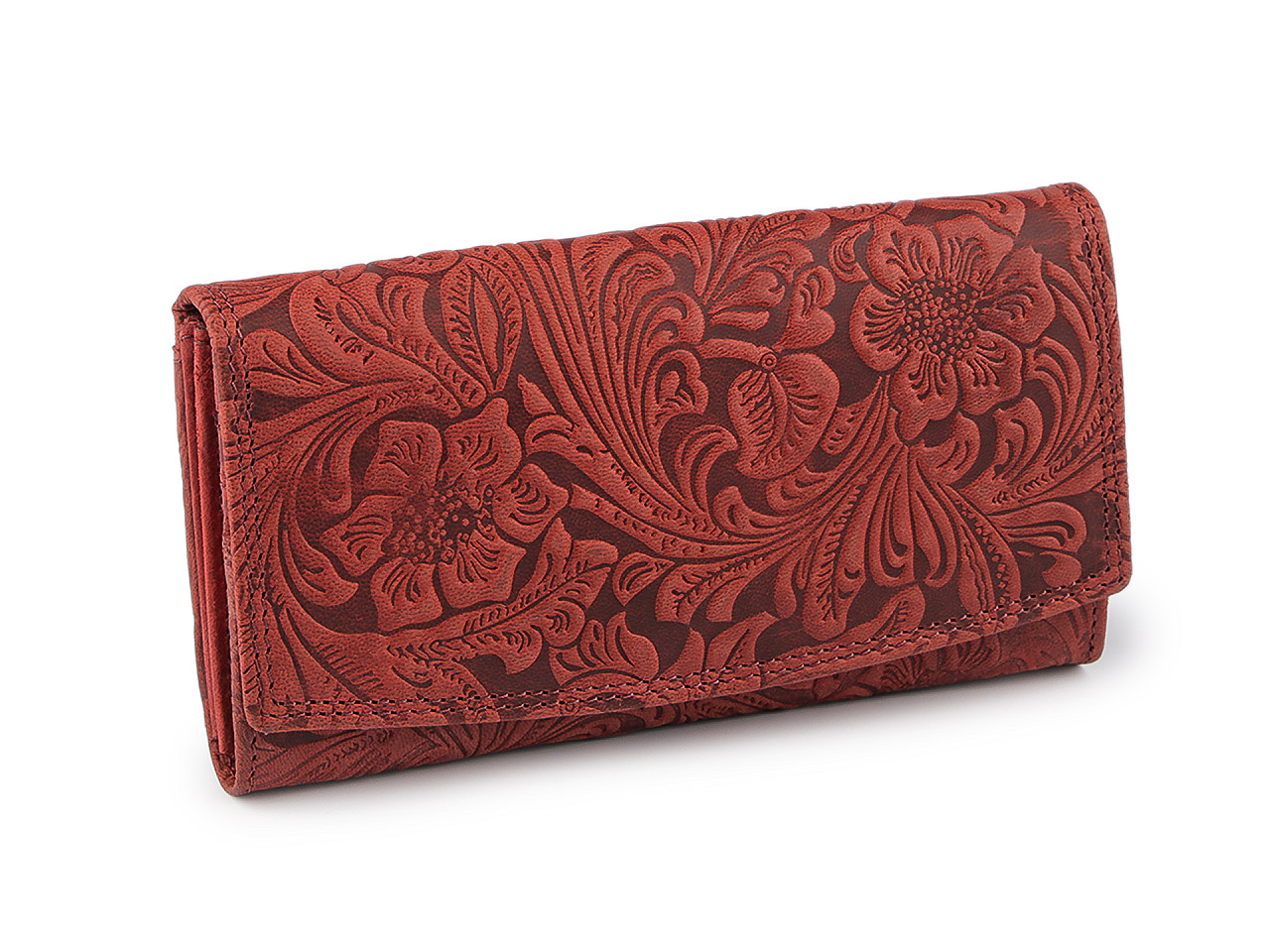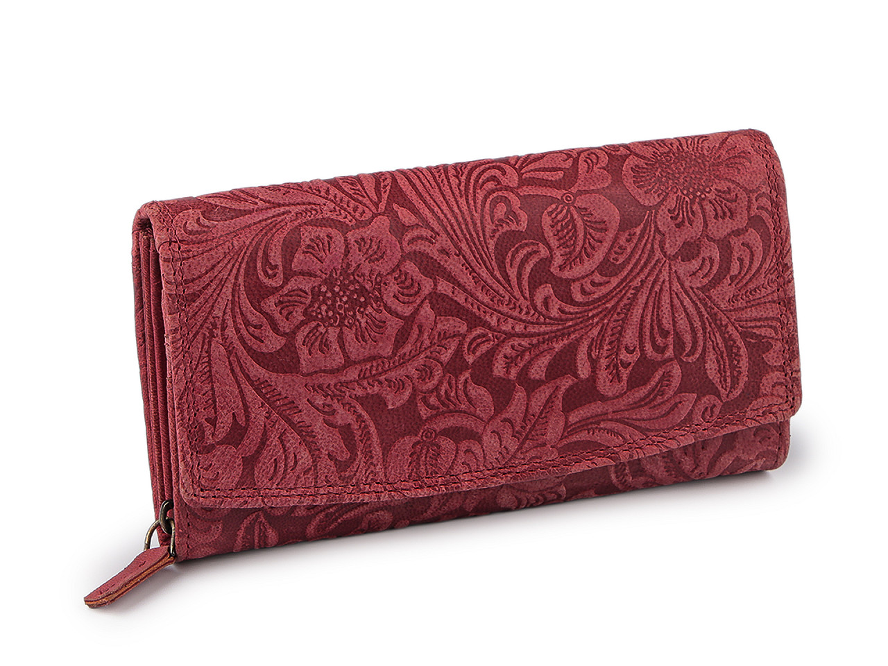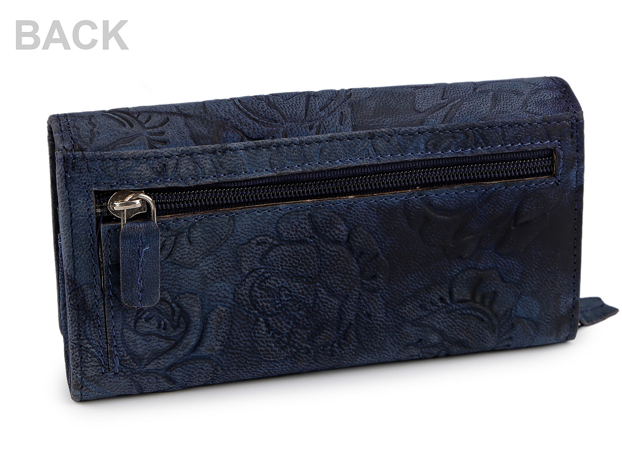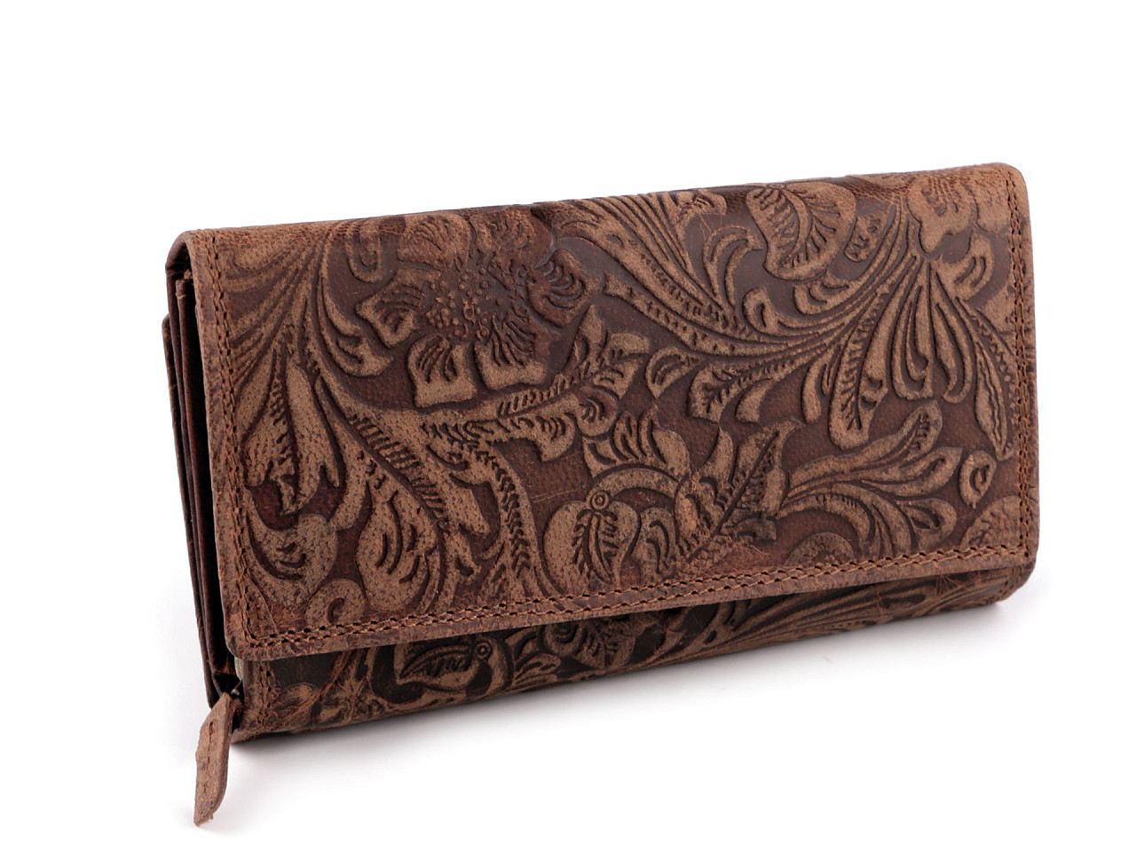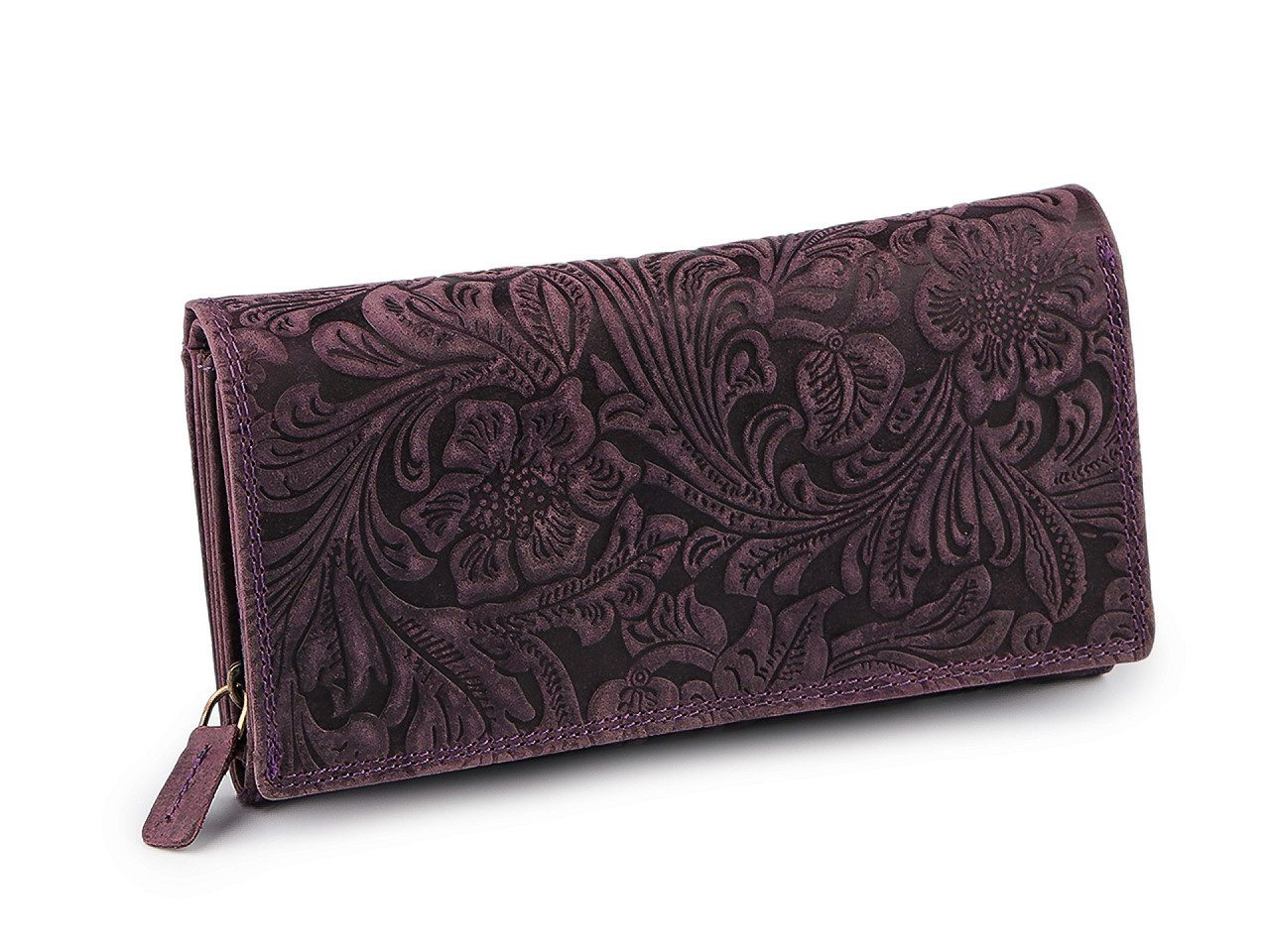 Luxusná dámska peňaženka z pravej kože má veľmi kvalitné prevedenie a šikovný dizajn. Má elegantný povrch s veľkými razenými kvetmi. Peňaženka č.1 - 9 má prednú stranu na klopu s 2 patentami. Ponúkne svojej majiteľke veľké množstvo vreciek a priehradiek. Okrem veľkého úložného priestoru na bankovky, má aj uzatvárateľné vrecko na mince, vrecko na doklady, miesto na uloženie 10 platobných alebo vernostných kariet a mnoho ďalších vreciek pre vaše použitie. Peňaženky č.10 - 18 sú dlhé 17 cm. Klopu na patent majú z prednej aj zadnej strany. Ponúknu svojej majiteľke veľké množstvo vreciek a priehradiek. Okrem veľkého úložného priestoru na bankovky, majú aj uzatvárateľné vrecko na mince, vrecko na doklady, miesto na uloženie 21 platobných alebo vernostných kariet a mnoho ďalších vreciek. Upozorňujeme zákazníkov, že odtiene peňaženiek sa môžu mierne líšiť. Niektoré peňaženky môžu mať zips zo zadnej strany alebo môžu mať zapínanie na pracku.