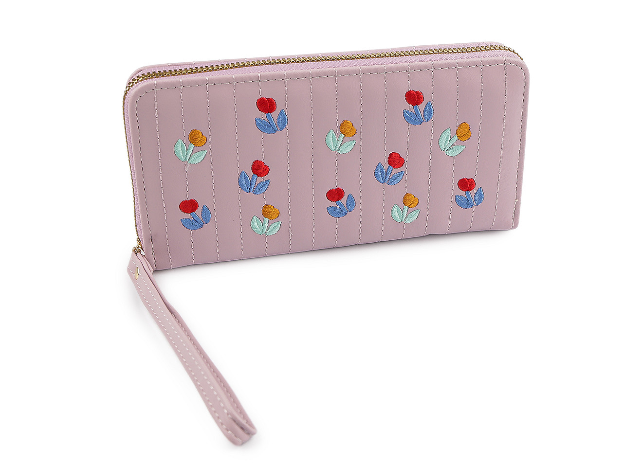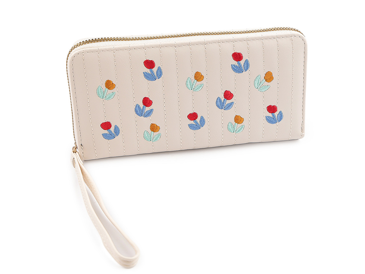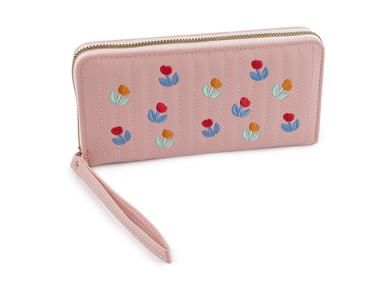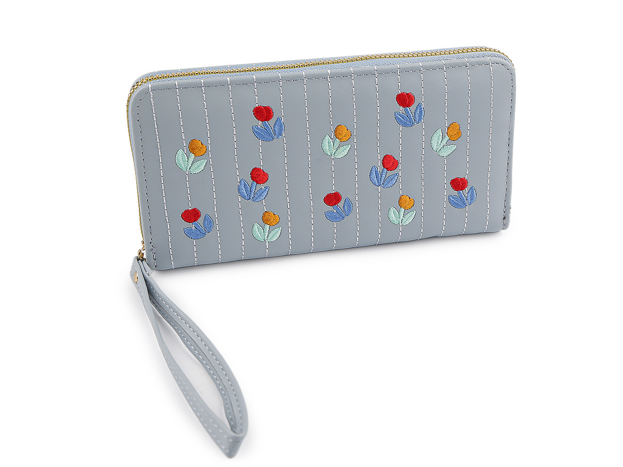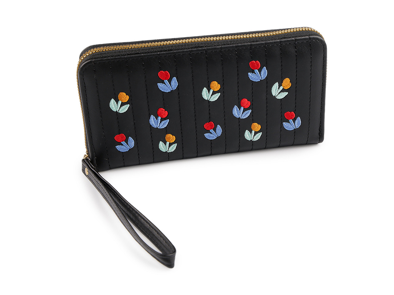 Dámska peňaženka s výšivkou malých kvetov zaujme na prvý pohľad. Kvety má na prednej strane, prešívané pruhy sú aj na zadnej strane peňaženky. Je vybavená dlhým pútkom na nosenie na zápästí . Peňaženka obsahuje jedno hlavné vrecko, ktoré sa zapína na kovový zips. Vnútri je peňaženka členená do troch veľkých priehradiek na papierové bankovky a jedného uzatvárateľného vrecka na zips , vhodného na ukladanie mincí a rôznych drobností. Po vnútorných stranách peňaženky sú priehradky na karty a dve väčšie na doklady, účtenky a pod.