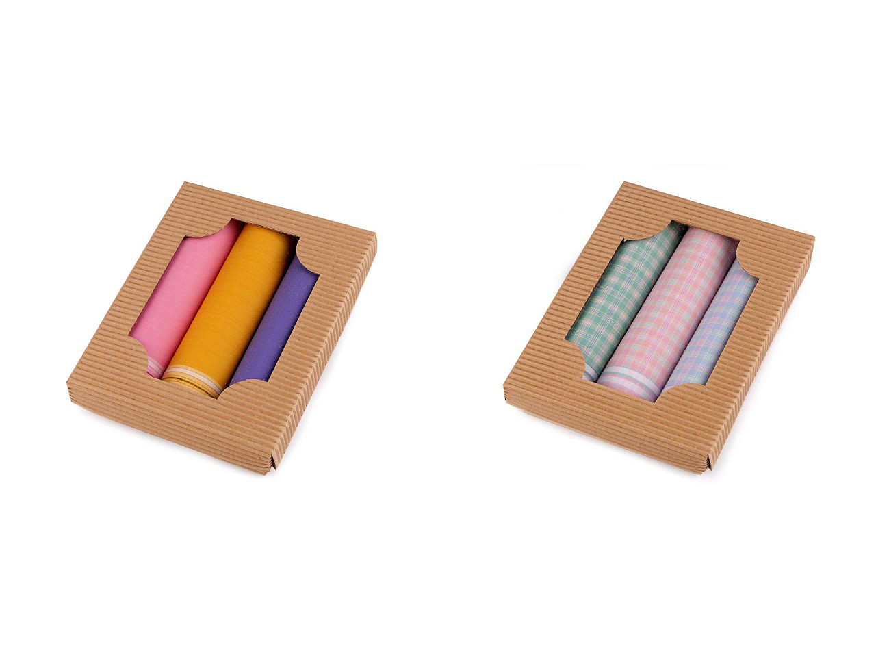 Luxusná sada dámskych vreckoviek je vhodná pre všetky ženy. Kvalitné bavlnené vreckovky majú klasické dezény prúžkov a kára. Vreckovky sú zabalené v darčekovej krabičke z vlnitej lepenky prírodného vzhľadu s priehľadom. Môžu vám poslúžiť ako hodnotný darček. V krabičke nájdete 3 štvorcové vreckovky. Variant "mix" obsahuje druhy vreckoviek, ktoré máme práve skladom. Skladba vreckoviek pri jednotlivých variantoch sa môže mierne líšiť.