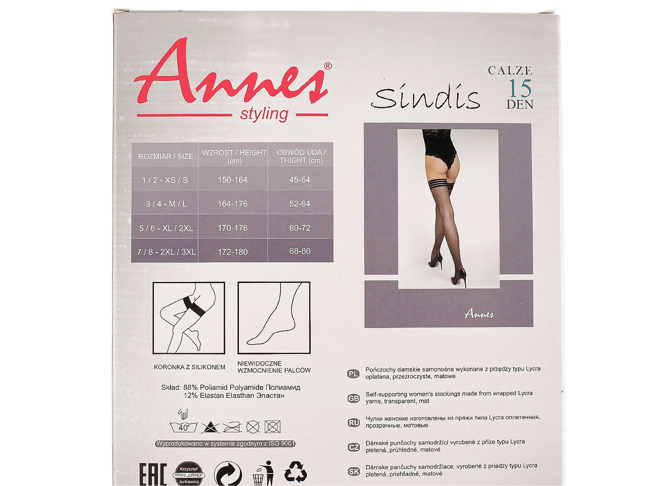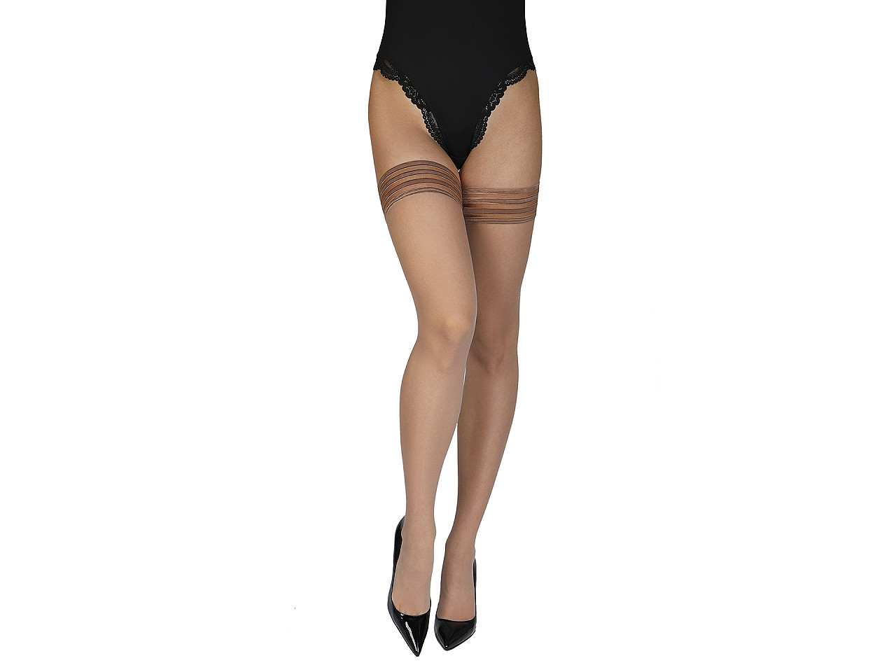 Samodržiace pančuchy s jemnosťou 15 den skvele zdôrazňujú ženskú krásu. Majú jemnú matnú textúru, ktorá dodáva nohám prirodzený a upokojujúci vzhľad. Hore sú ozdobené 4 pruhmi . Pod ozdobou majú 2 silikónové pásiky , vďaka ktorým perfektne priliehajú k nohe, nekĺzajú a zvyšujú slobodu pohybu. Špičku prstov majú bezšvovú , ochránia vaše nohy pred odreninami a poskytnú vám pohodlie. Sú ideálne na nosenie k šatám alebo sukniam, vhodné na rôzne príležitosti, od každodenného nosenia až po špeciálne udalosti. Veľkosť: 1 / 2 - XS / S ( výška postavy 152 / 164 cm, obvod stehna 45 - 54 cm ), 3/4 – M/L (výška postavy 164/176 cm, obvod stehna 52 – 64 cm).