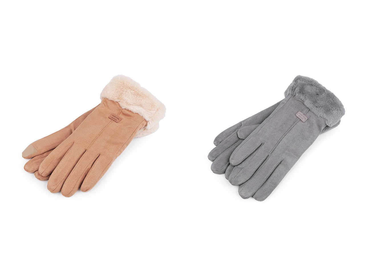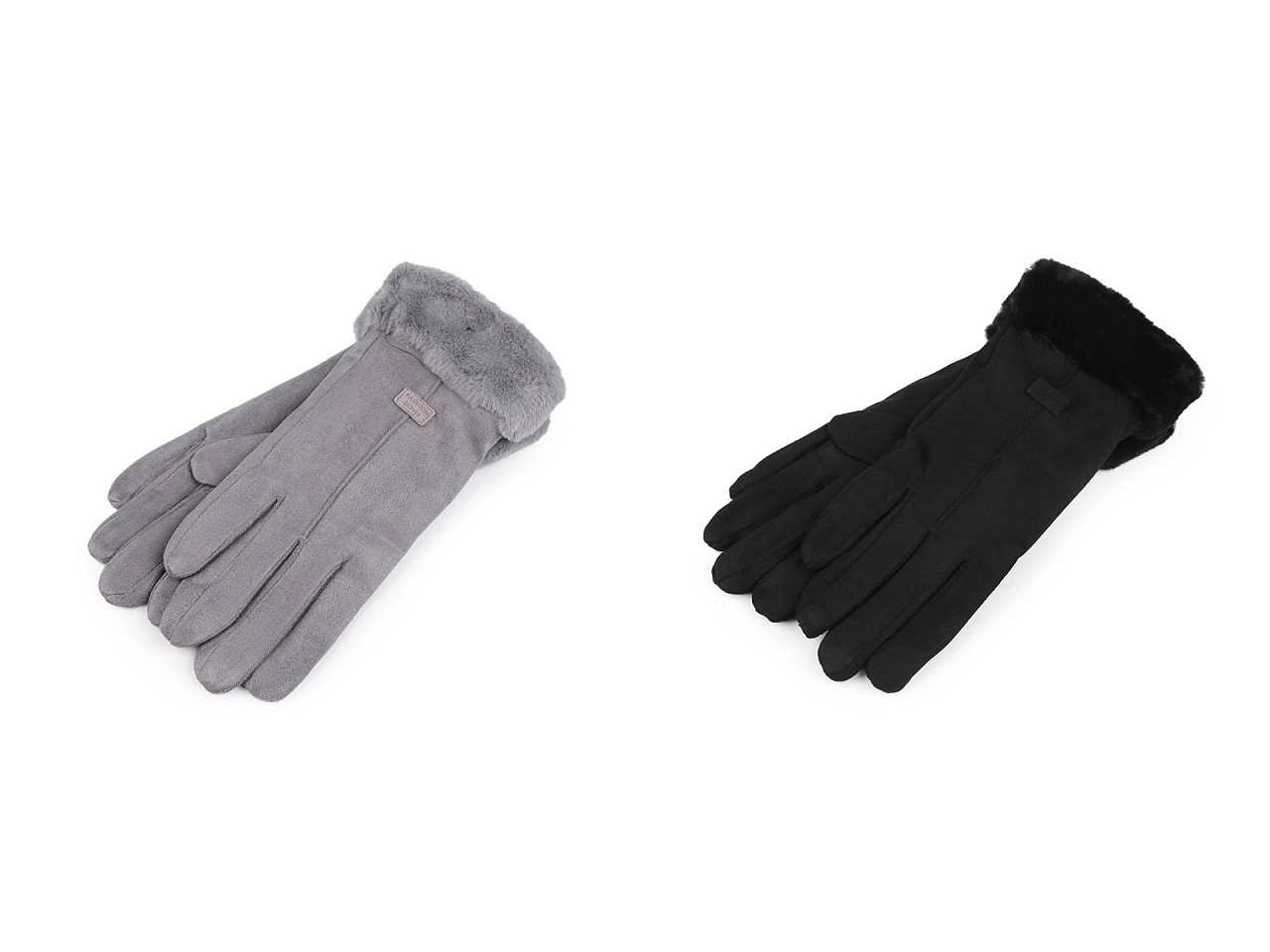 Elegantné dámske rukavice zdobí lem z umelej kožušiny a štítok s nápisom Fashion gloves. Rukavice jemne pružia , ich povrch pripomína brúsenú kožu. Vo vnútri majú príjemný plyšový kožúšok. Hodia sa do zimy aj do chladnejšieho jesenného počasia. Na ukazováku pravej ruky je špeciálna tkanina, vďaka ktorej môžete ovládať dotykové prístroje - mobil, tablet, bankomat a pod. Šírka je meraná na voľne položených rukaviciach uprostred (bez palca).