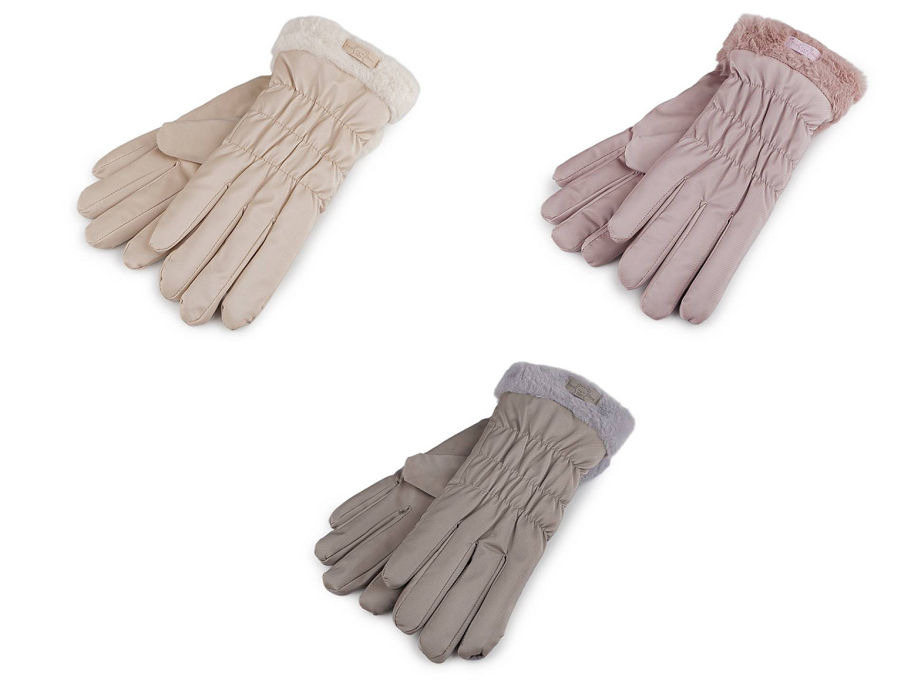 Elegantné šuštiakové rukavice sú ozdobené lemom z umelej kožušiny a štítkom z eko kože s motívom medvedíka. Využijete ich k športovým bundám a vestám, ale hodia sa aj na bežné nosenie ku kabátom. Na ukazováku pravej ruky je špeciálna tkanina, vďaka ktorej môžete ovládať dotykové prístroje - mobil, tablet, bankomat a pod. Vnútri majú plyšový kožúšok , ktorý vás príjemne zahreje. Sú vhodné do zimy alebo do chladnejšieho jesenného počasia. Šírka je meraná na voľne položených rukaviciach uprostred (bez palca).