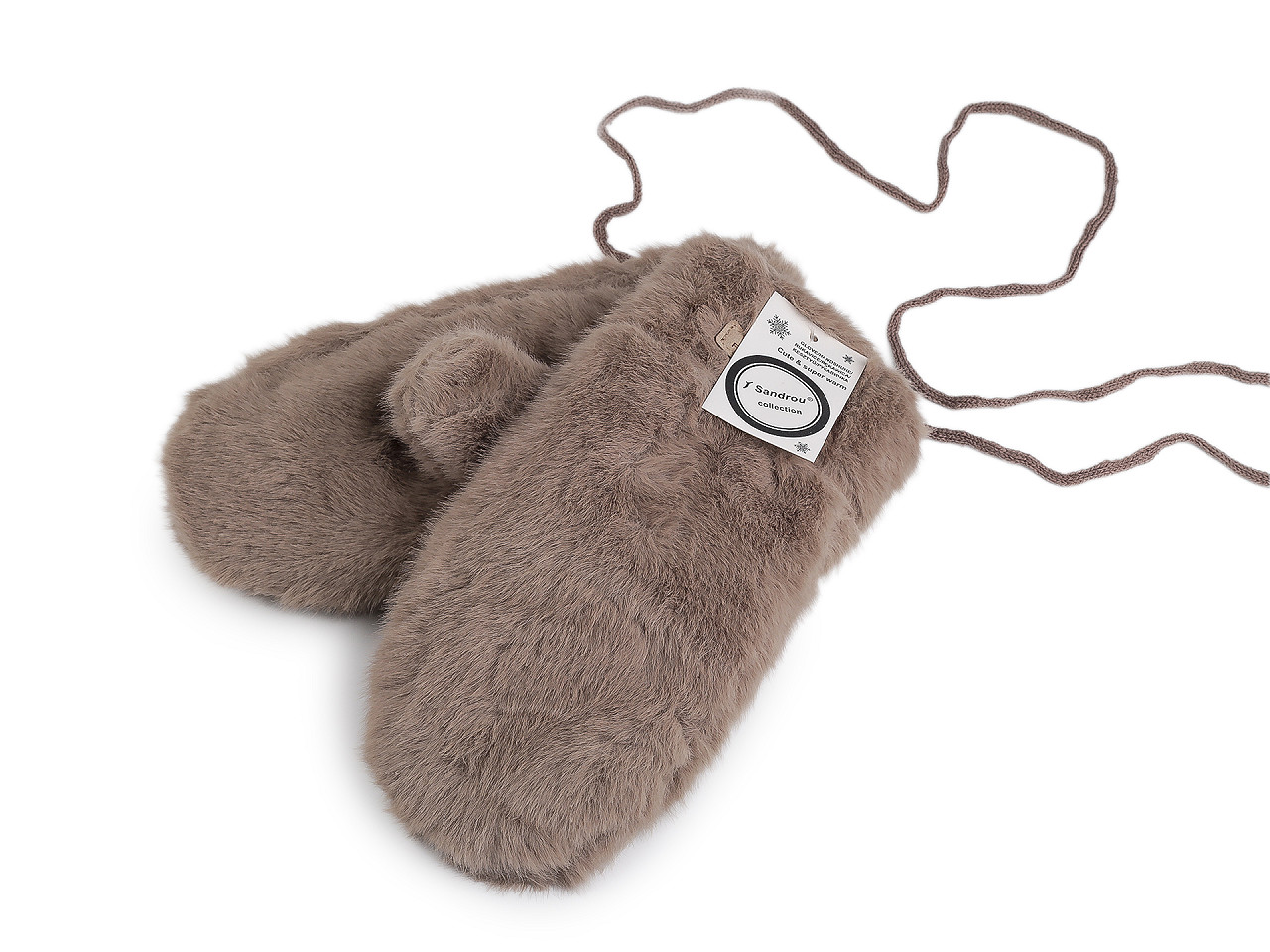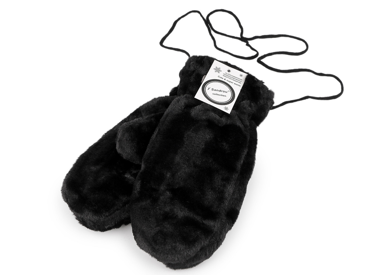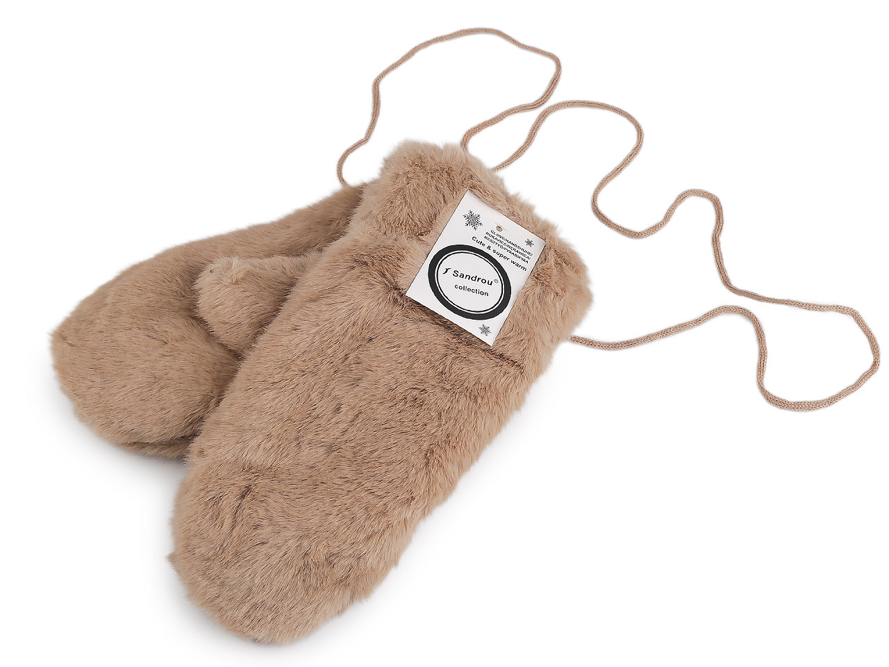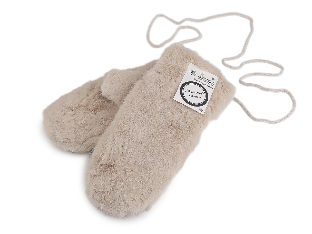 Dámske rukavice palčiaky z umelej kožušiny sú vo vnútri zateplené príjemným plyšovým kožúškom . Sú ozdobené štítkom z umelej kože. Hodia sa do zimy, ruky perfektne zahrejú . Dajú sa navzájom spojiť priloženou šnúrou dlhou 1,1 metra, ktorá sa priviaže k pútkam pri okraji rukavíc. Slúži na prevlečenie rukávmi, aby sa rukavice nestratili. Šírka je meraná na voľne položených rukaviciach uprostred (bez palca). Rukavice môžu mať zlé štítky, skutočné zloženie je polyester.