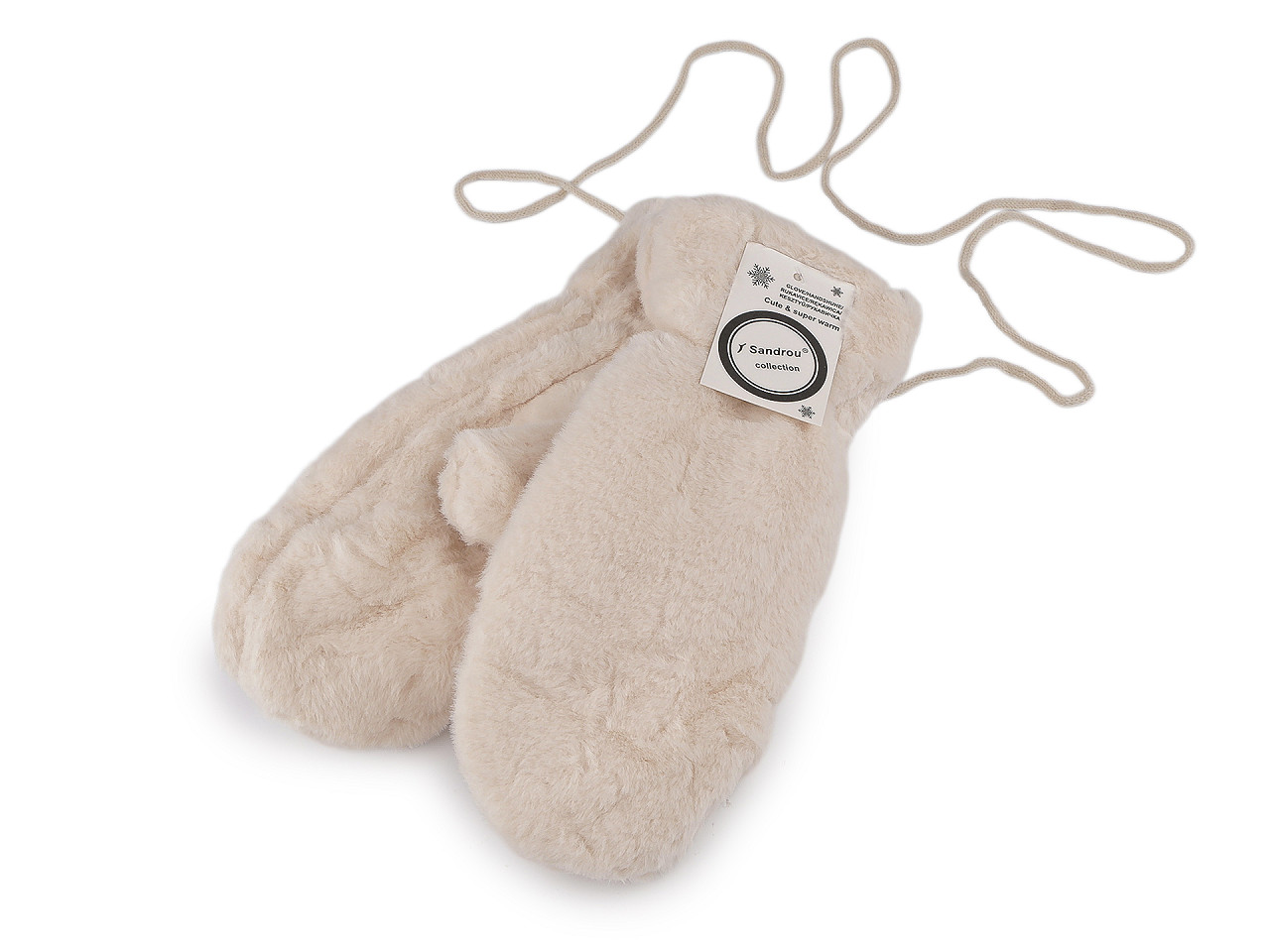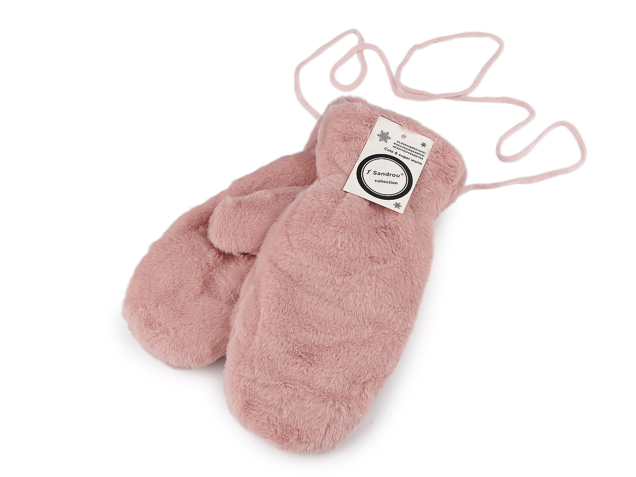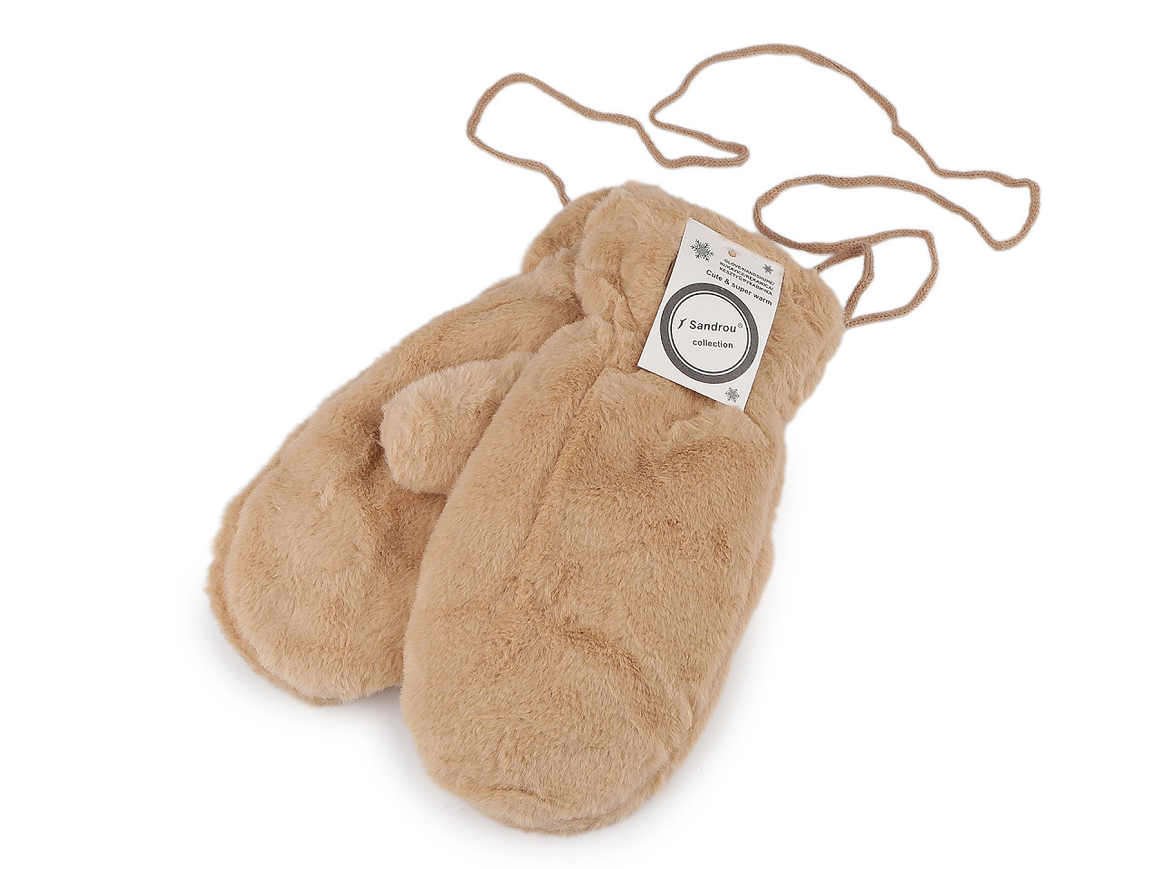 Dámske rukavice palčiaky z umelej kožušiny sú vo vnútri zateplené príjemným plyšovým kožúškom . Sú ozdobené štítkom z umelej kože. Hodia sa do zimy, ruky perfektne zahrejú . Dajú sa navzájom spojiť priloženou šnúrou dlhou 1,1 metra, ktorá sa priviaže k pútkam pri okraji rukavíc. Slúži na prevlečenie rukávmi, aby sa rukavice nestratili. Šírka je meraná na voľne položených rukaviciach uprostred (bez palca). Rukavice môžu mať zlé štítky, skutočné zloženie je polyester.