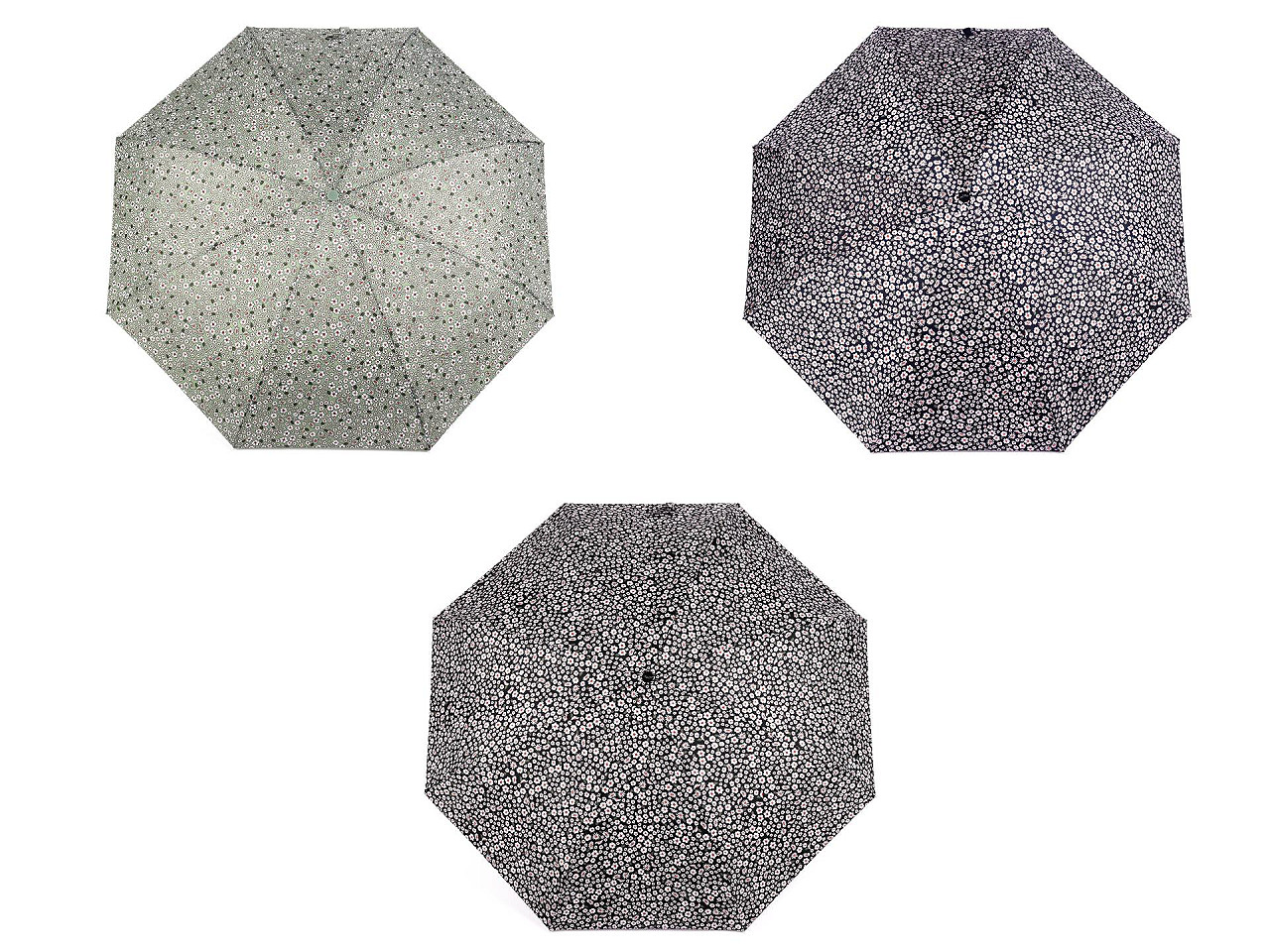 Dámsky skladací dáždnik s potlačou kvetov . Dáždnik je veľmi skladný - zložený meria iba 18-19 cm, pohodlne sa zmestí do kabelky. Konštrukcia je tvorená ôsmimi poľami. Obstojí aj v silnom vetre , pružné lamely zaisťujú vysokú pevnosť a stabilitu . UV filter vás ochráni pred slnečným žiarením. Rukoväť dáždnika je plastová, opatrená pútkom. Súčasťou dáždnika je ochranný obal . Hĺbka dáždnika je 20 cm. Celková dĺžka je 55 cm. Dĺžka zloženého dáždnika je 18-19 cm.