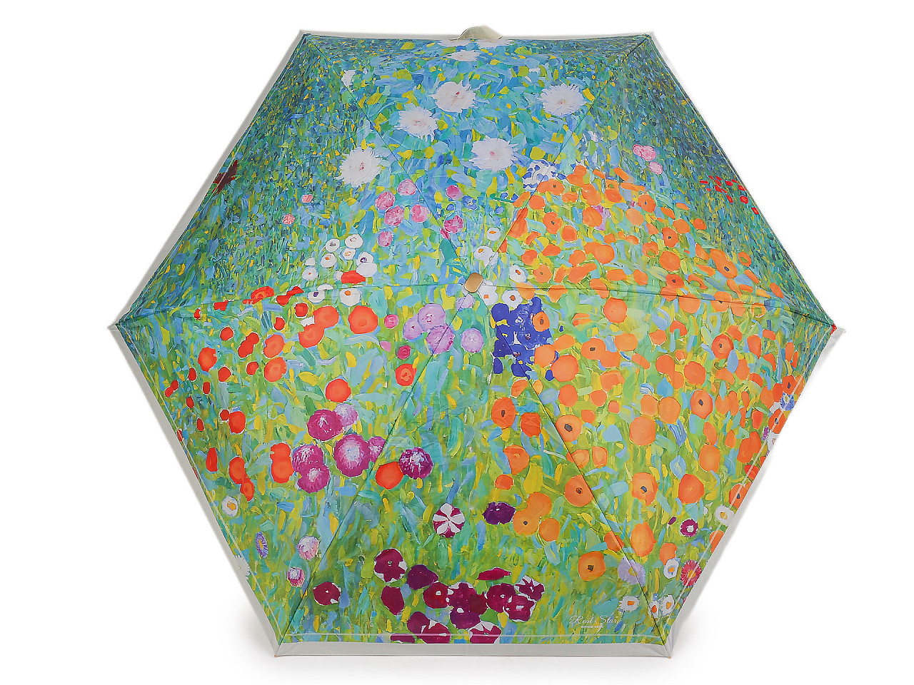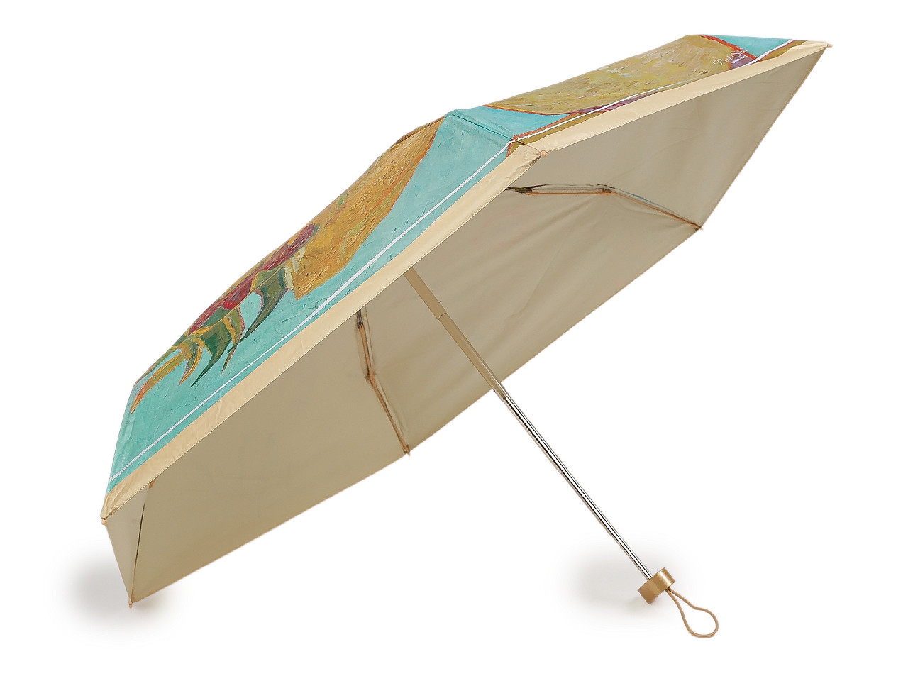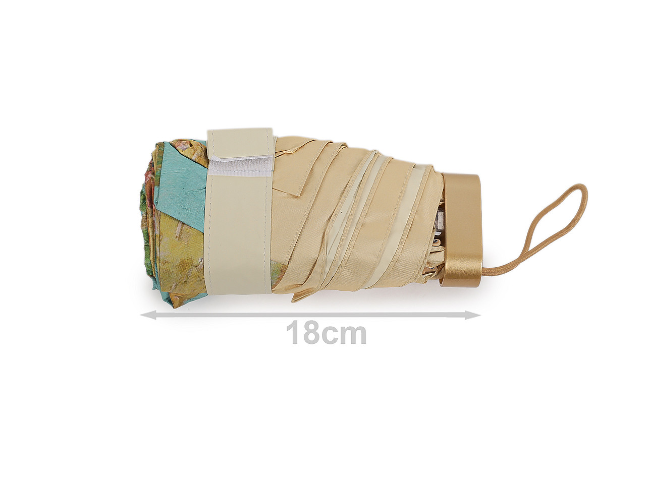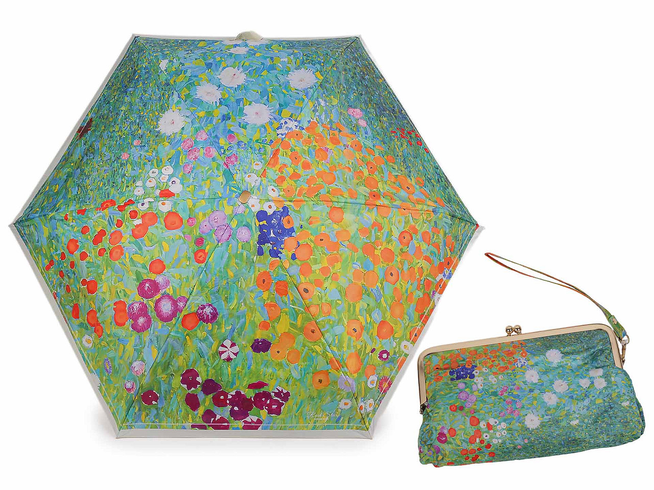 Skladací mini dáždnik má poťah s motívmi obrazov slávnych umeleckých diel . Dáždnik je ľahký a skladný , po zložení ho môžete schovať do puzdra v tvare malej kabelky s kovovým rámčekom a odnímateľným pútkom na ruku. Kabelku môžete používať aj samostatne, čo oceníte predovšetkým na cestách. Konštrukcia dáždnika je tvorená 6 poľami, rukoväť dáždnika je plastová, opatrená pružným pútkom. UV filter vás ochráni pred slnečným žiarením. Hĺbka dáždnika je 18 cm. Celková dĺžka je 49 cm. Dĺžka zloženého dáždnika je 18 cm. Rozmery kabelky sú 21 x 12 x 6,5 cm.