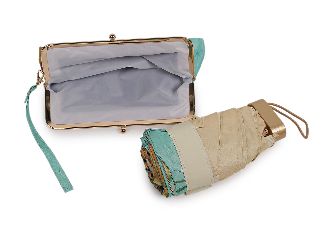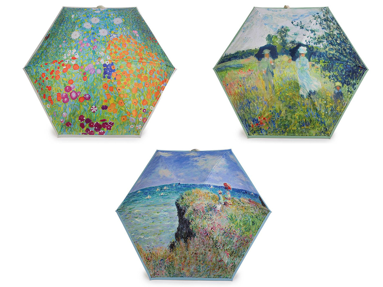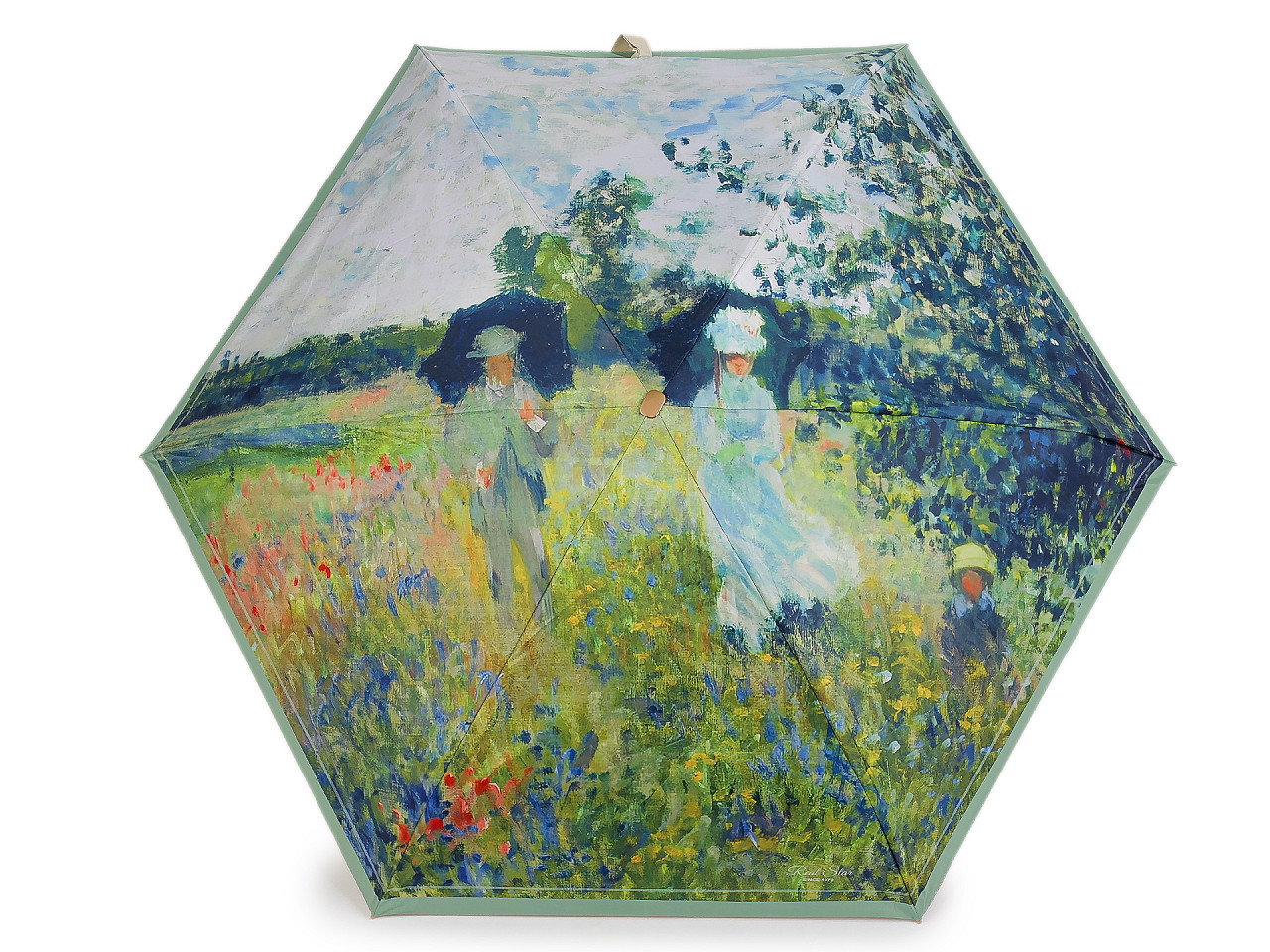 Skladací mini dáždnik má poťah s motívmi obrazov slávnych umeleckých diel . Dáždnik je ľahký a skladný , po zložení ho môžete schovať do puzdra v tvare malej kabelky s kovovým rámčekom a odnímateľným pútkom na ruku. Kabelku môžete používať aj samostatne, čo oceníte predovšetkým na cestách. Konštrukcia dáždnika je tvorená 6 poľami, rukoväť dáždnika je plastová, opatrená pružným pútkom. UV filter vás ochráni pred slnečným žiarením. Hĺbka dáždnika je 18 cm. Celková dĺžka je 49 cm. Dĺžka zloženého dáždnika je 18 cm. Rozmery kabelky sú 21 x 12 x 6,5 cm.