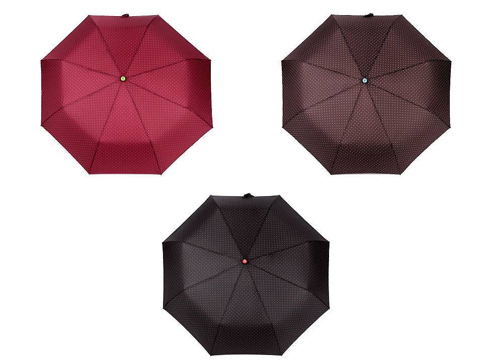 Dámsky skladací dáždnik zdobia drobné bodky. Dáždnik má vystrelovací mechanizmus - roztvorí sa stlačením tlačidla, zaviera sa manuálne. Konštrukcia je vytvorená pomocou osem poli. Stredová tyč je vyrobená z magnetizujúceho kovu. Dáždnik má plastovú rukoväť s bodkami zapínanie je na suchý zips. Súčasťou dáždnika je ochranný obal.