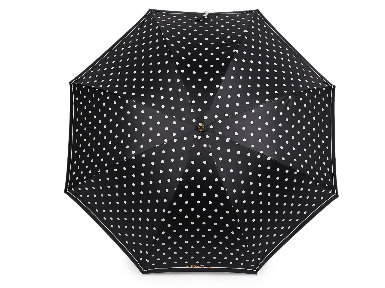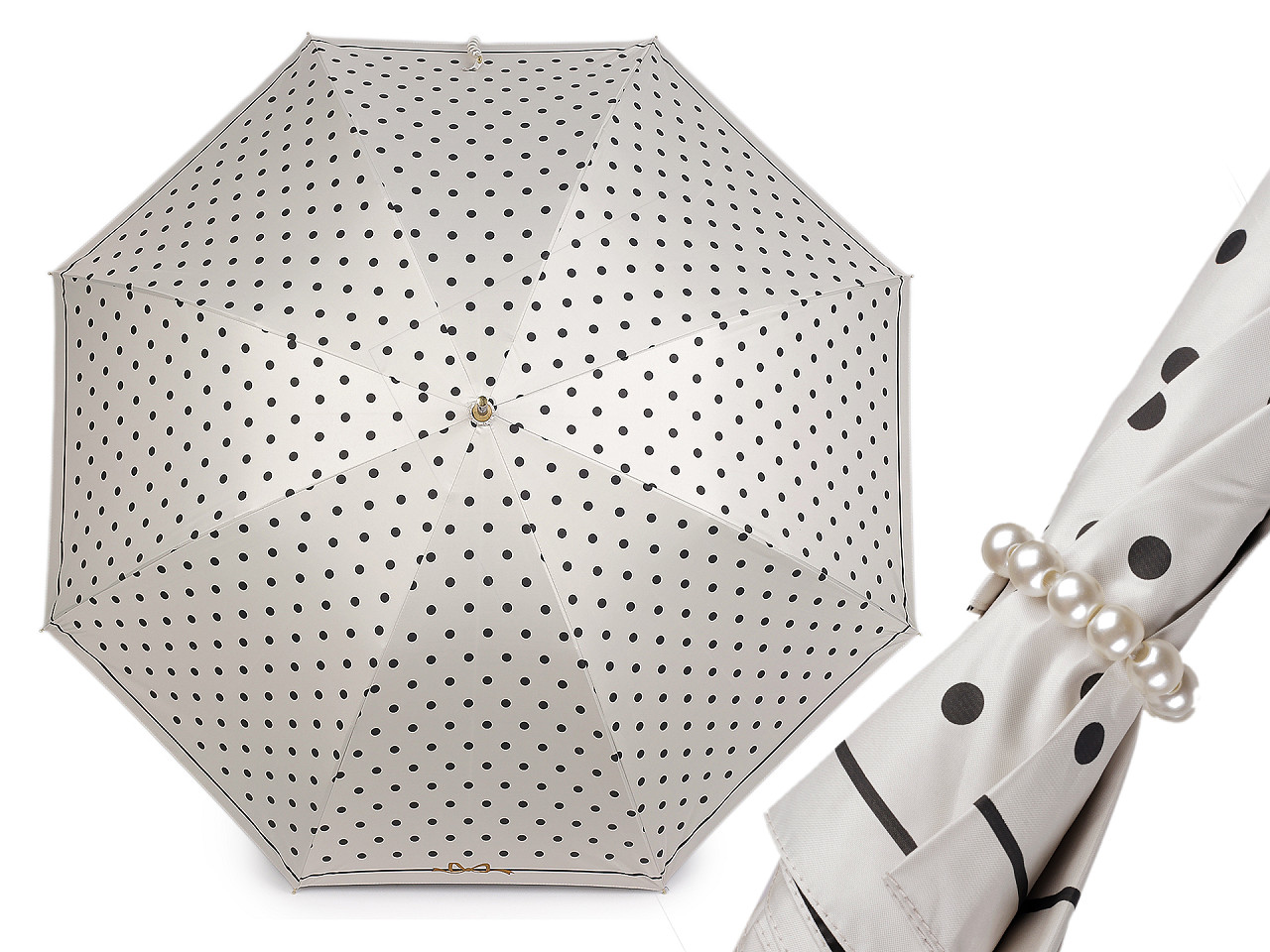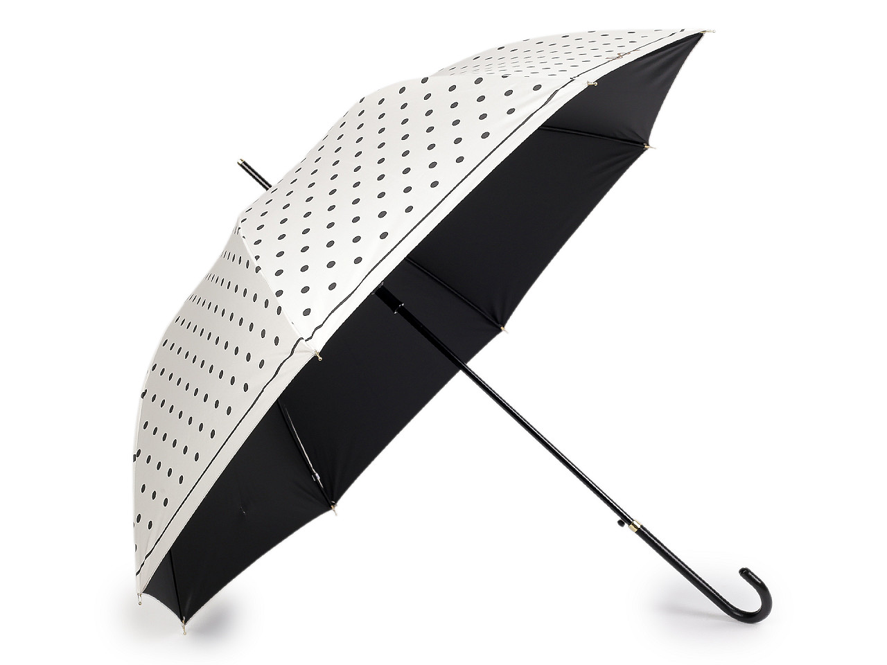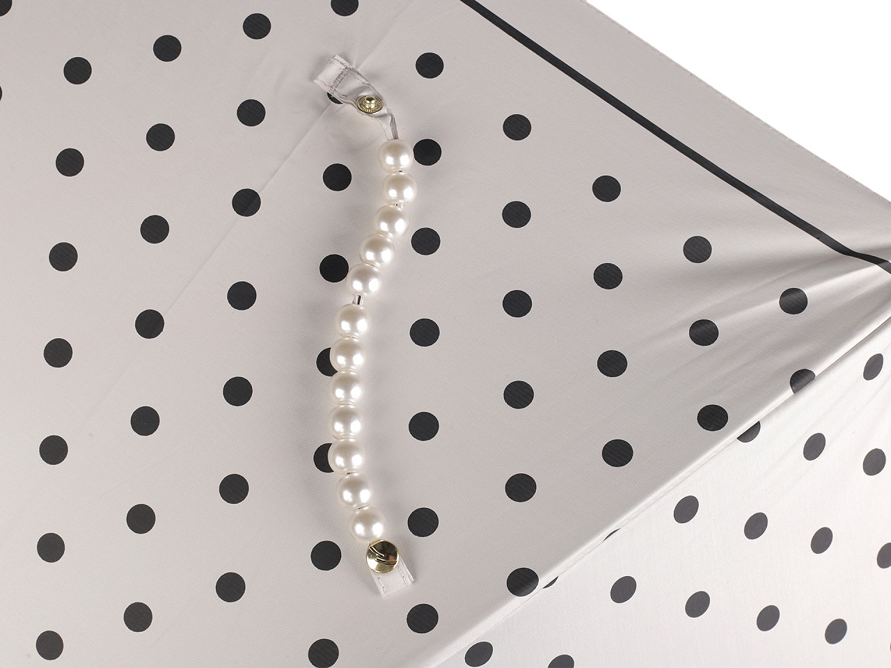 Veľký dámsky bodkovaný dáždnik je ozdobený perlovým zapínaním . Dáždnik je vystreľovací, konštrukciu má z kovového drôtu a pružných lamiel, ktoré tvoria osem polí. Vďaka nim je veľmi pevný, neohne sa ani za najväčšieho nečasu. UV filter vás ochráni pred slnečným žiarením. Klasická tyč je zakončená pevnou rukoväťou z eko kože . Dolná strana poťahu je čierna. Hĺbka dáždnika je 25 cm.