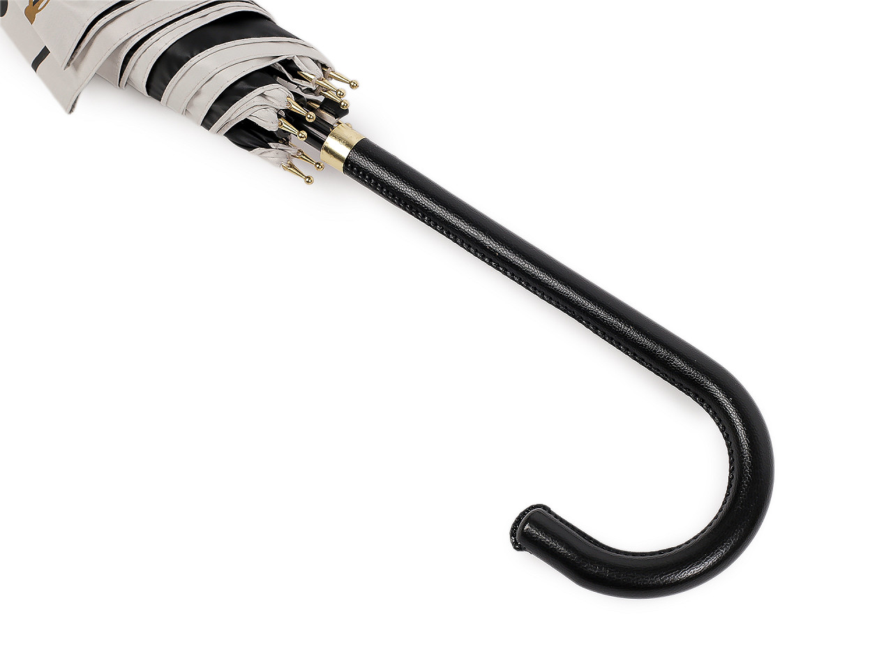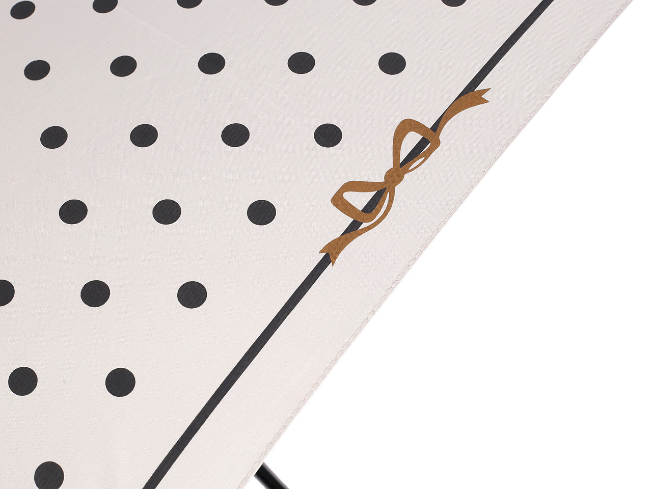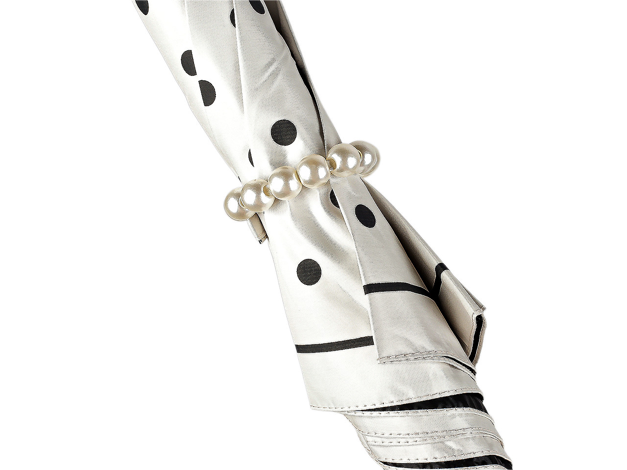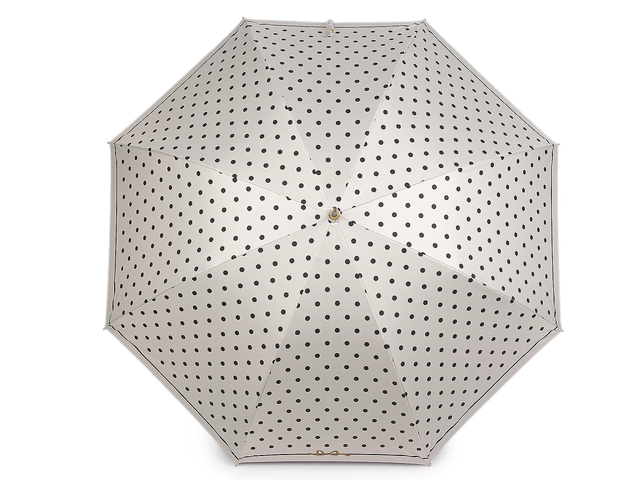 Veľký dámsky bodkovaný dáždnik je ozdobený perlovým zapínaním . Dáždnik je vystreľovací, konštrukciu má z kovového drôtu a pružných lamiel, ktoré tvoria osem polí. Vďaka nim je veľmi pevný, neohne sa ani za najväčšieho nečasu. UV filter vás ochráni pred slnečným žiarením. Klasická tyč je zakončená pevnou rukoväťou z eko kože . Dolná strana poťahu je čierna. Hĺbka dáždnika je 25 cm.