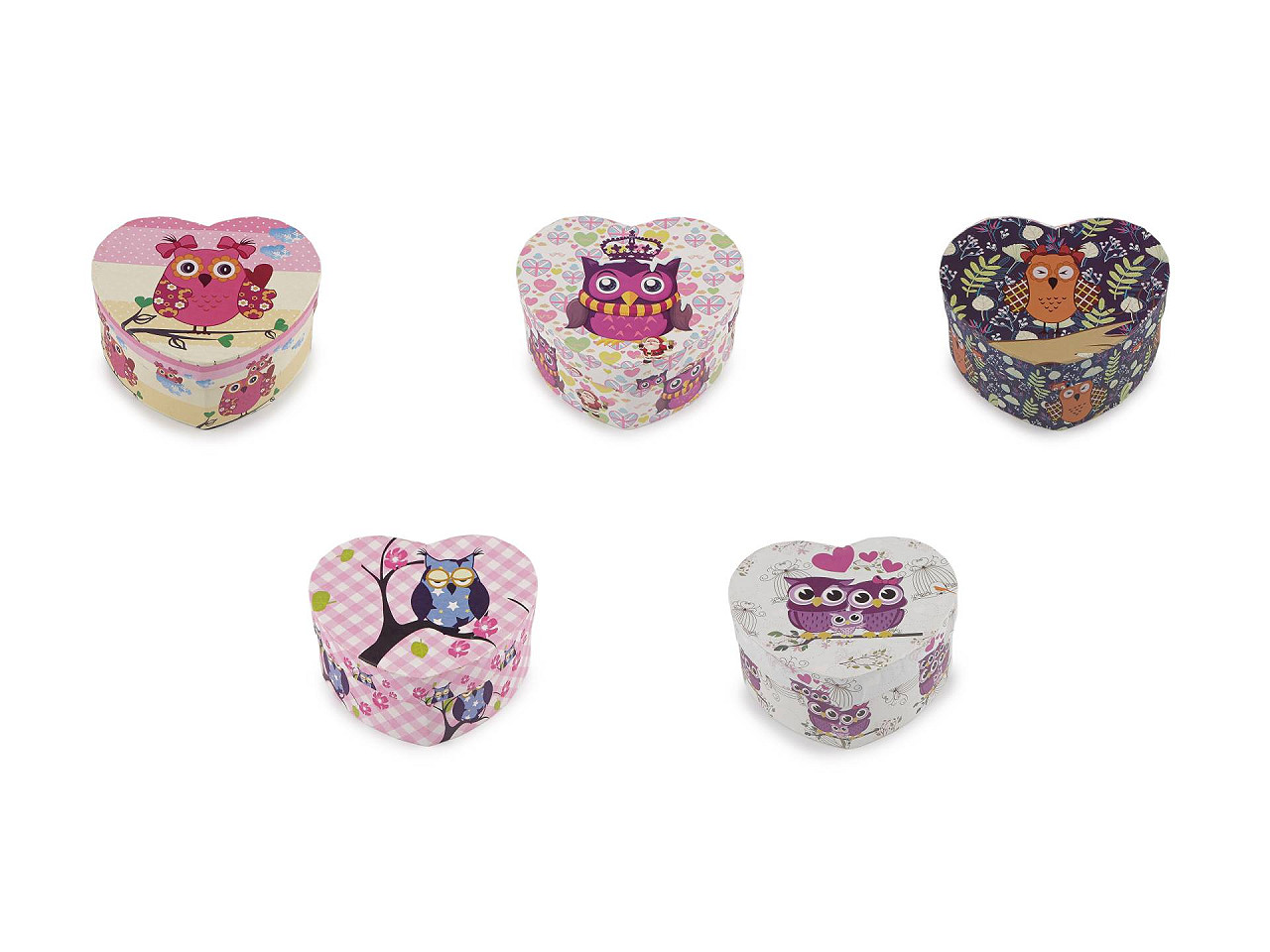 Papierová krabička v tvare srdca je ozdobená potlačou roztomilých sovičiek . Je určená na malé darčeky , vo vnútri má odnímateľný vankúšik vhodný na darovanie hodiniek alebo náramku. Krabička je veľmi pevná .