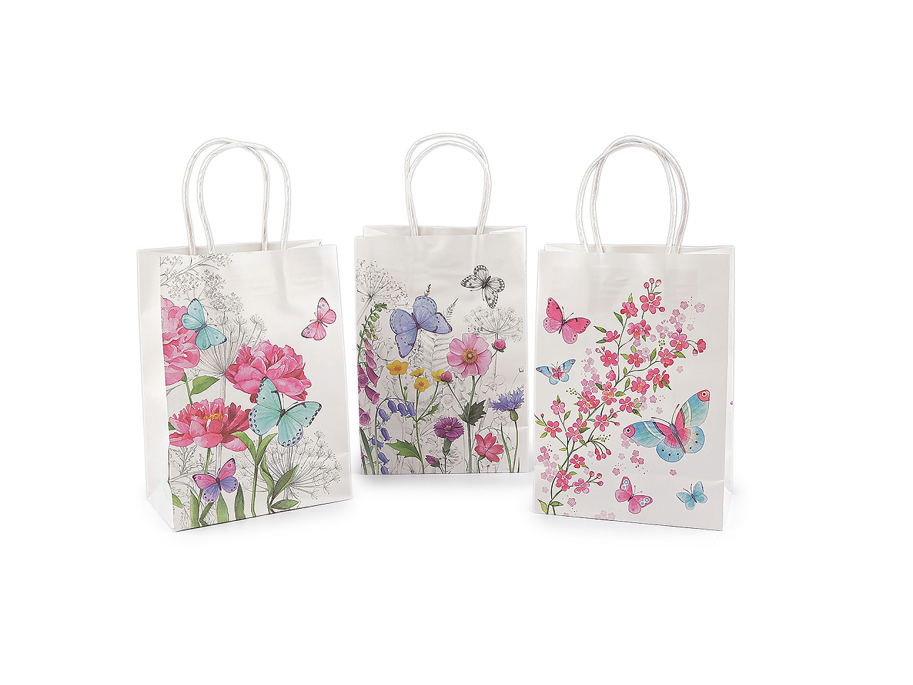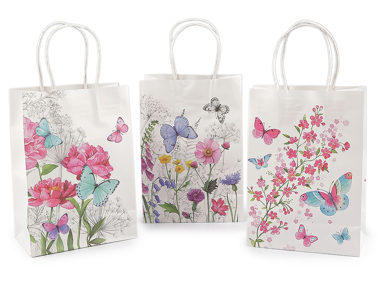 Papierová darčeková taška je z oboch strán ozdobená obrázkami s kvetmi a motýľmi . Je ideálna pre rôzne príležitosti, či už sa jedná o narodeniny, svadby alebo iné slávnostné udalosti. Jej uchá sú krútené a tiež vyrobené z papiera. Taška je vhodná na darovanie darčekov aj na balenie tovaru v predajniach.
