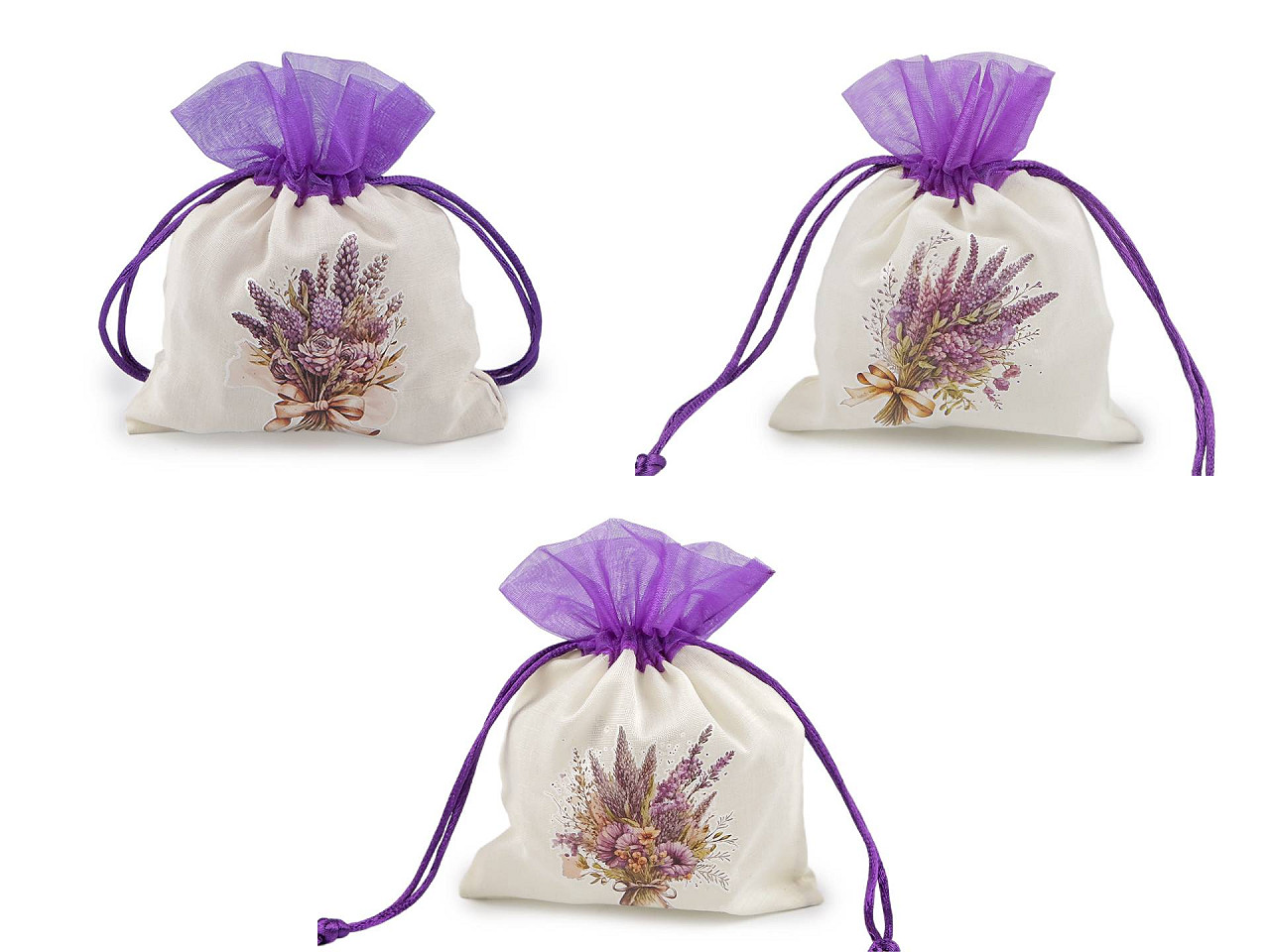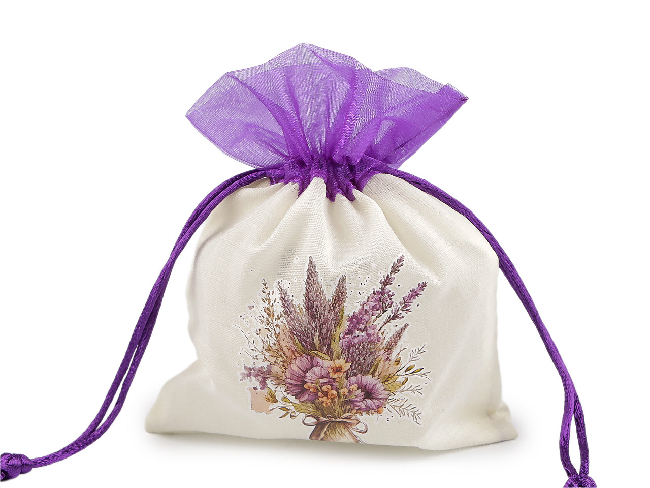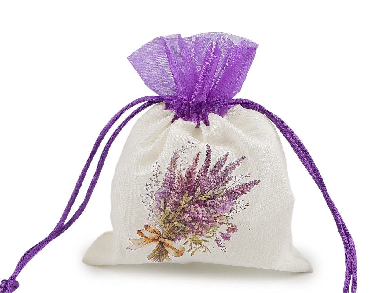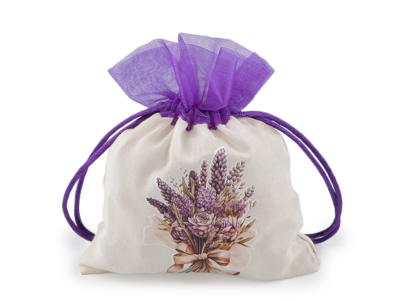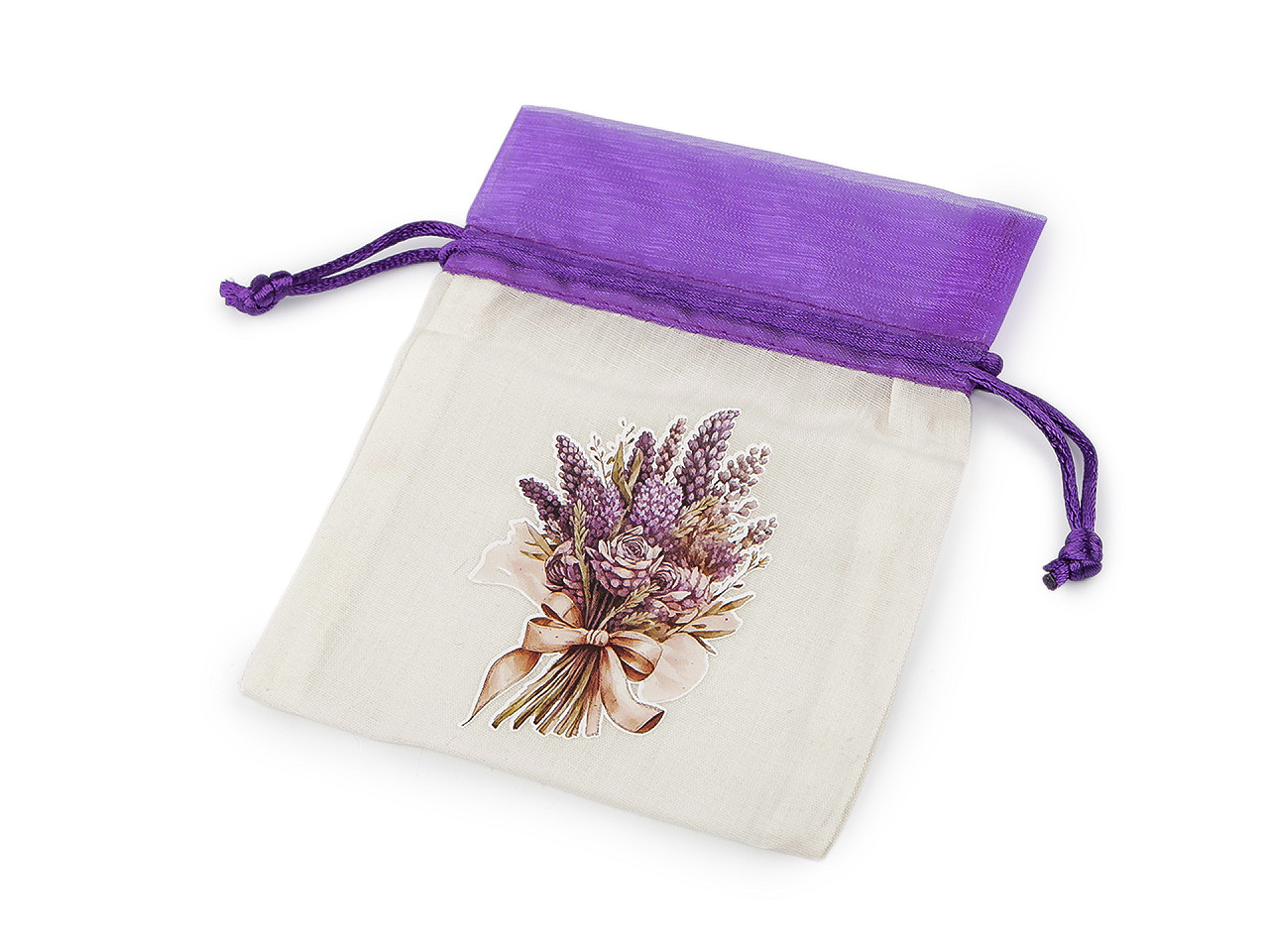Plátené darčekové vrecúško je ozdobené pogumovanou potlačou kytice s levanduľou . Hore je olemované organzou. Ľahko sa uzatvára pomocou dvoch sťahovacích saténových šnúrok. Vrecko pôsobí luxusne , môžete do neho zabaliť darčeky, uschovať vaše osobné poklady alebo naaranžovať voňavé sušené kvety.