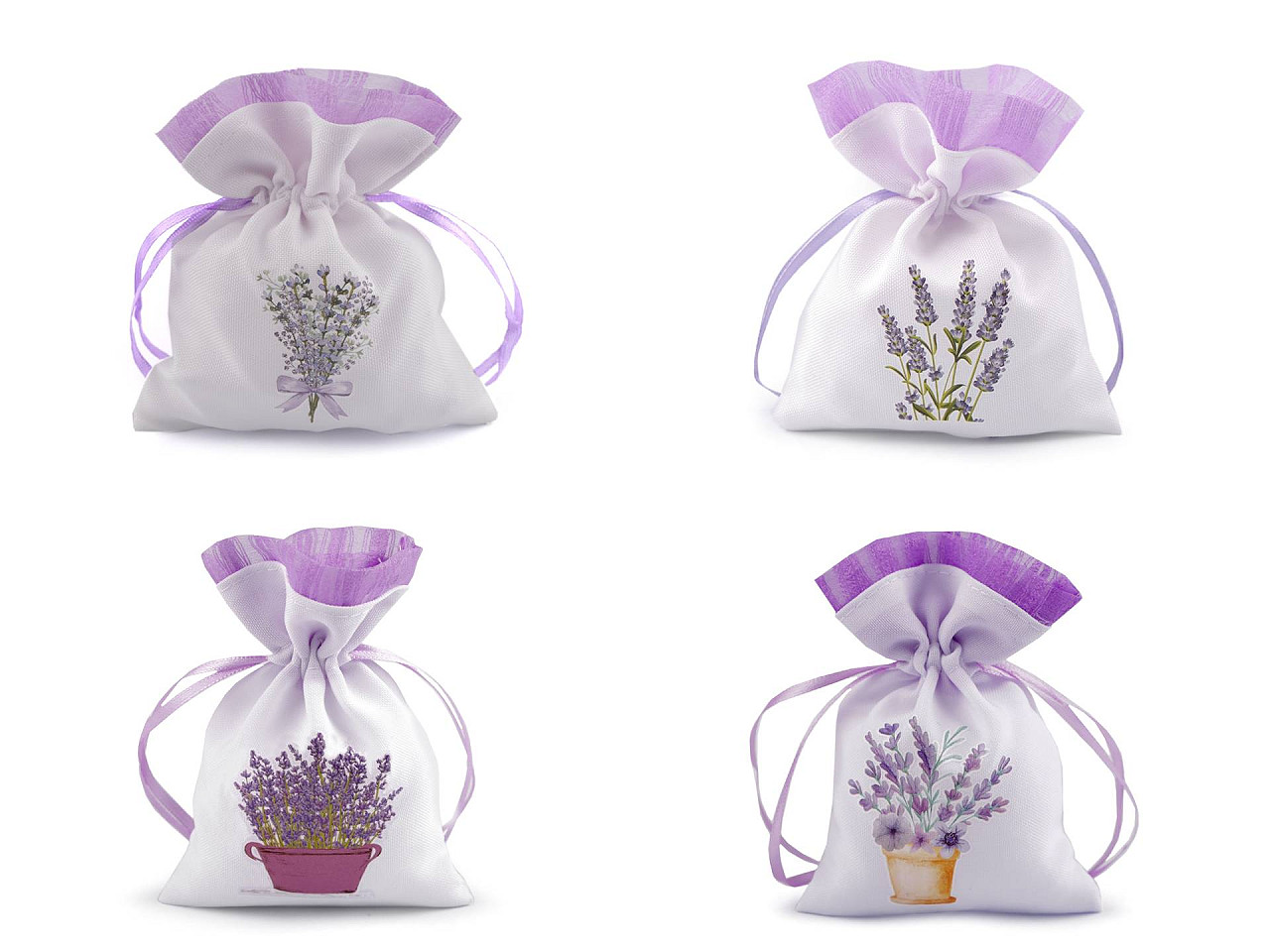 Plátenné darčekové vrecúško je ozdobené potlačou kvetov levandule. Hore je olemované organzou. Ľahko sa uzatvára pomocou dvoch sťahovacích saténových šnúriek. Vrecúško pôsobí luxusne, môžete do neho zabaliť darčeky, uschovať vaše osobné poklady alebo naaranžovať voňavé sušené kvety.