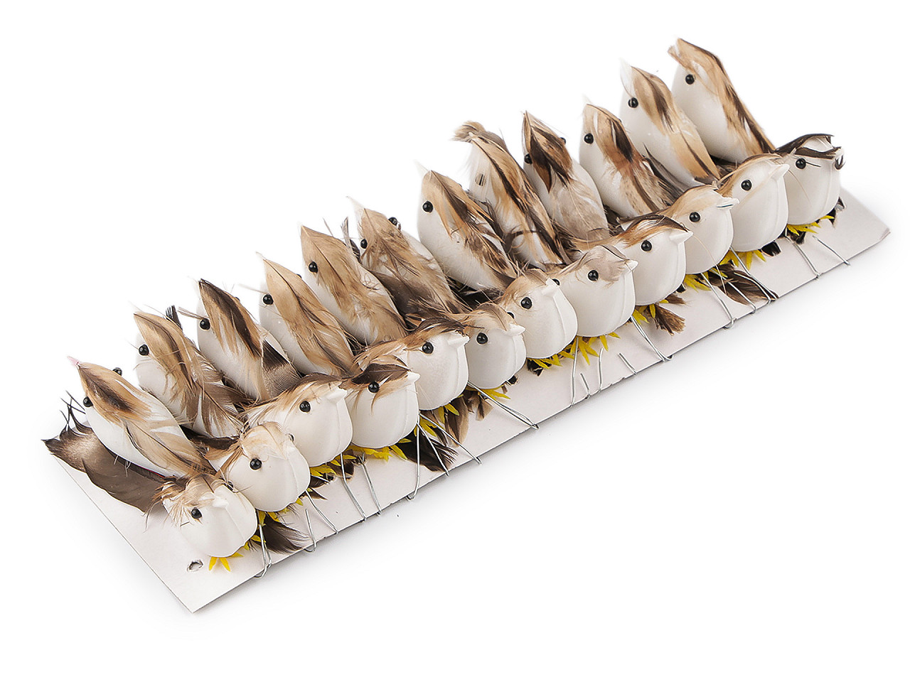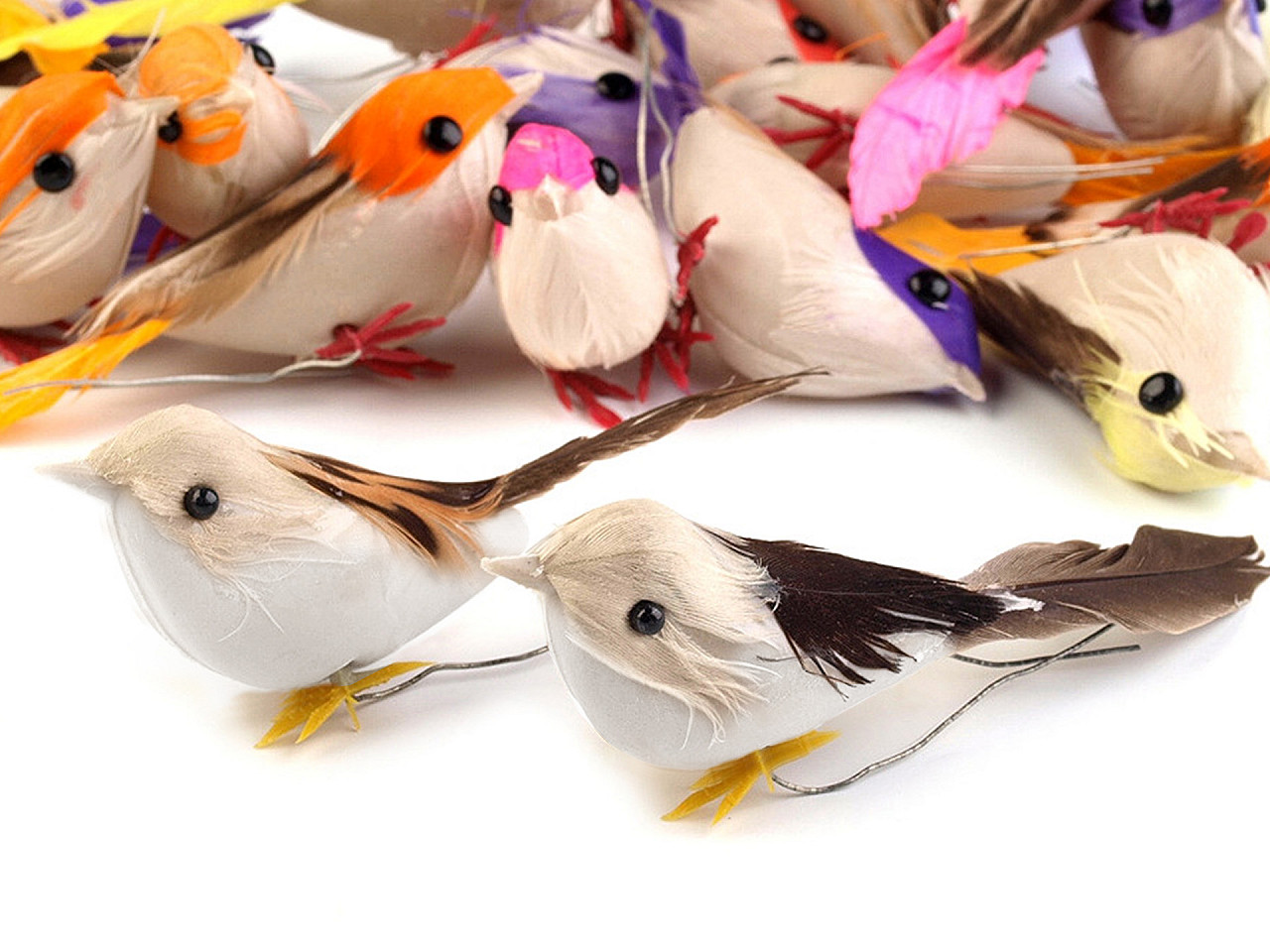 Dekoračný vtáčik je vyrobený z plastu a jeho telo pokrýva farebné perie. Na jeho nohách má pripevnené dva kovové drôtiky, vďaka ktorým môžete vtáčika pripevniť napríklad na veniec, vetvičku, záclonu či ho naaranžovať do kvetinových väzieb.