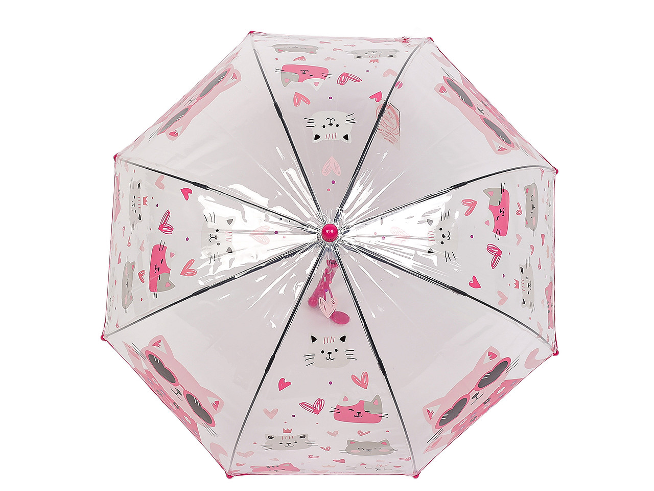 Detský vystreľovací dáždnik s motívom mačiek je ideálnym spoločníkom pre malých dobrodruhov počas daždivých dní. Priehľadný materiál nielenže zaisťuje skvelú viditeľnosť , ale tiež dodáva veselý a hravý vzhľad, ktorý si vaše dieťa okamžite obľúbi. Vďaka hlbokej konštrukcii poskytuje zvýšenú ochranu proti vetru a dažďu , zatiaľ čo vystreľovací mechanizmus umožňuje ľahké a rýchle otvorenie . Dáždnik má klasickú tyč zakončenú pevnou rukoväťou s visačkou, na ktorú môžete napísať meno dieťaťa. Konštrukcia dáždnika je z pružných lamiel a tvorí osem polí. Hĺbka dáždnika je 30 cm.