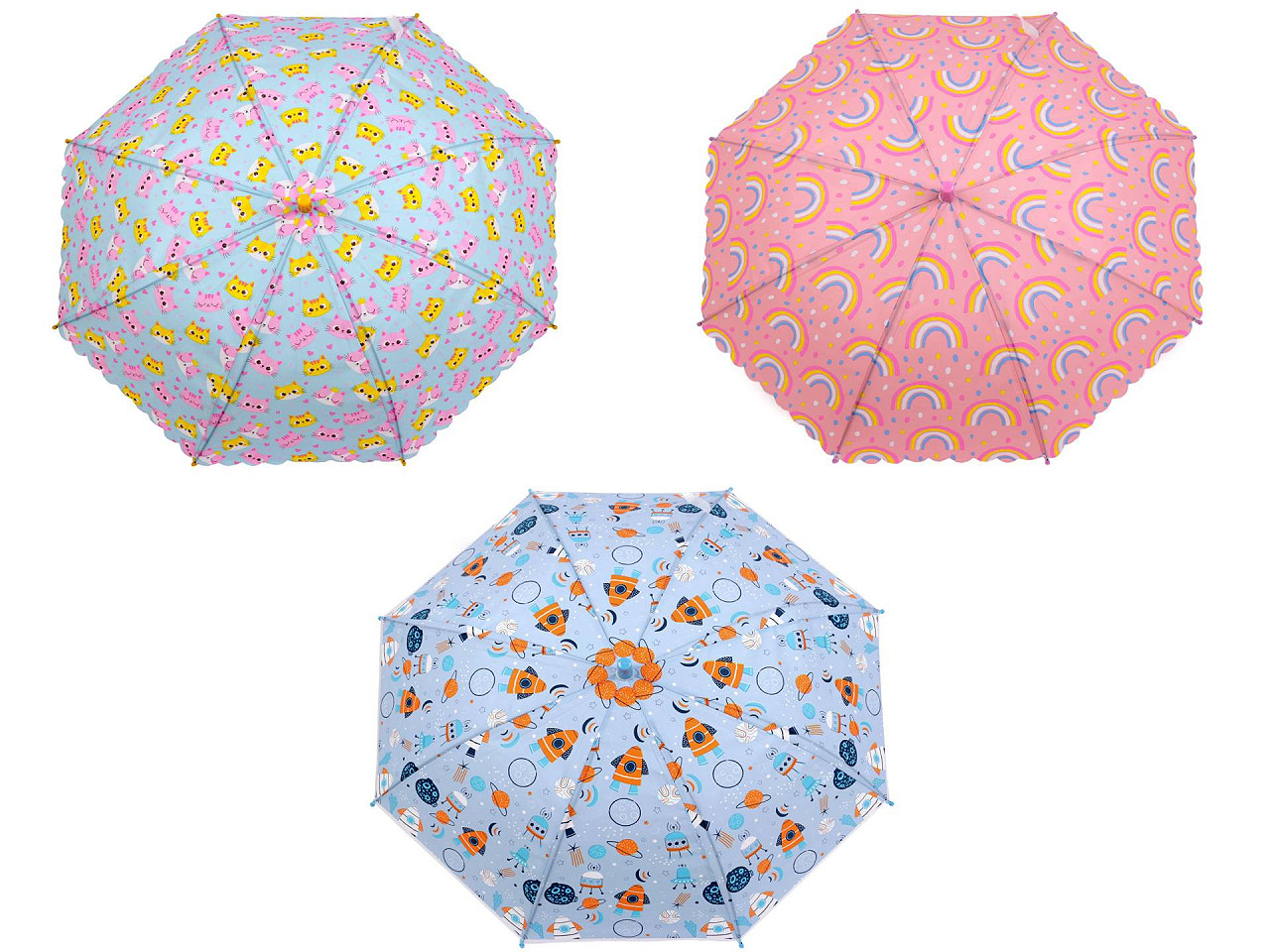 Detský vystreľovací dáždnik je veľmi obľúbený pre svoj zaujímavý priesvitný materiál a hravý dizajn. Na rukoväti má visačku, na ktorú môžete napísať meno dieťaťa. Má klasickú tyč zakončenú pevnou rukoväťou. Konštrukcia dáždnika je z pružných lamiel a tvorí osem polí. Hĺbka dáždnika je 22 cm. Dáždniky č. 1 a 2 majú okraje ozdobené vlnkami. Dáždniky č. 3 a 4 majú okraje rovné.