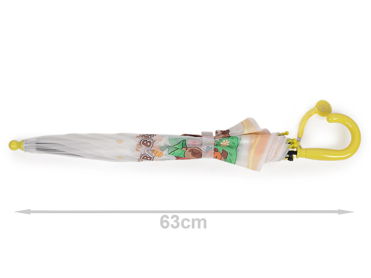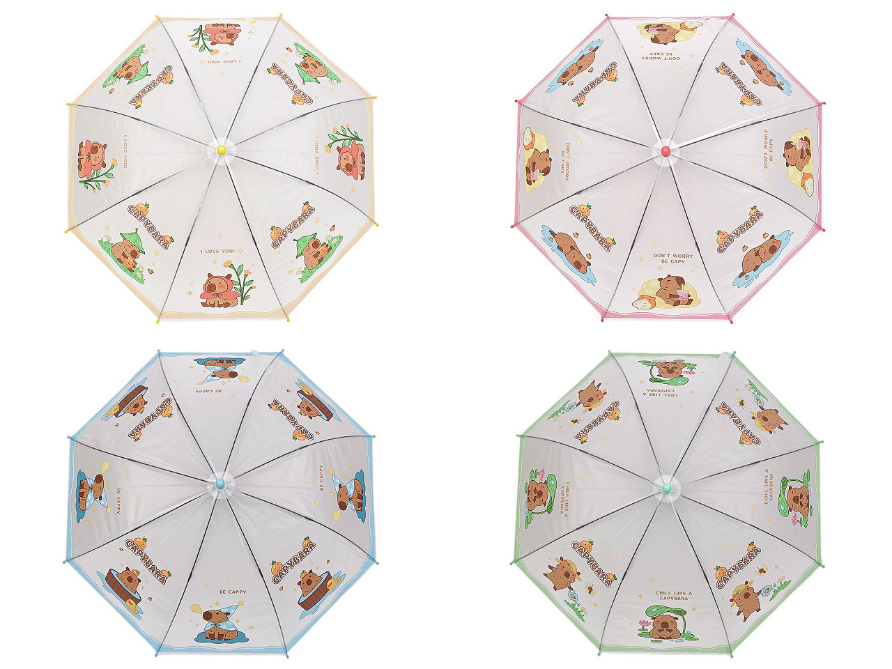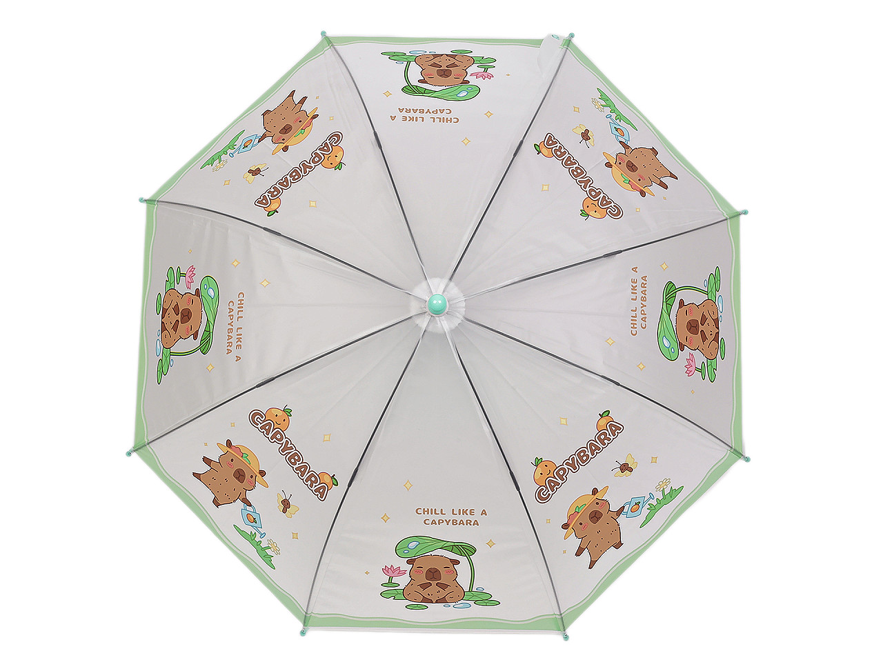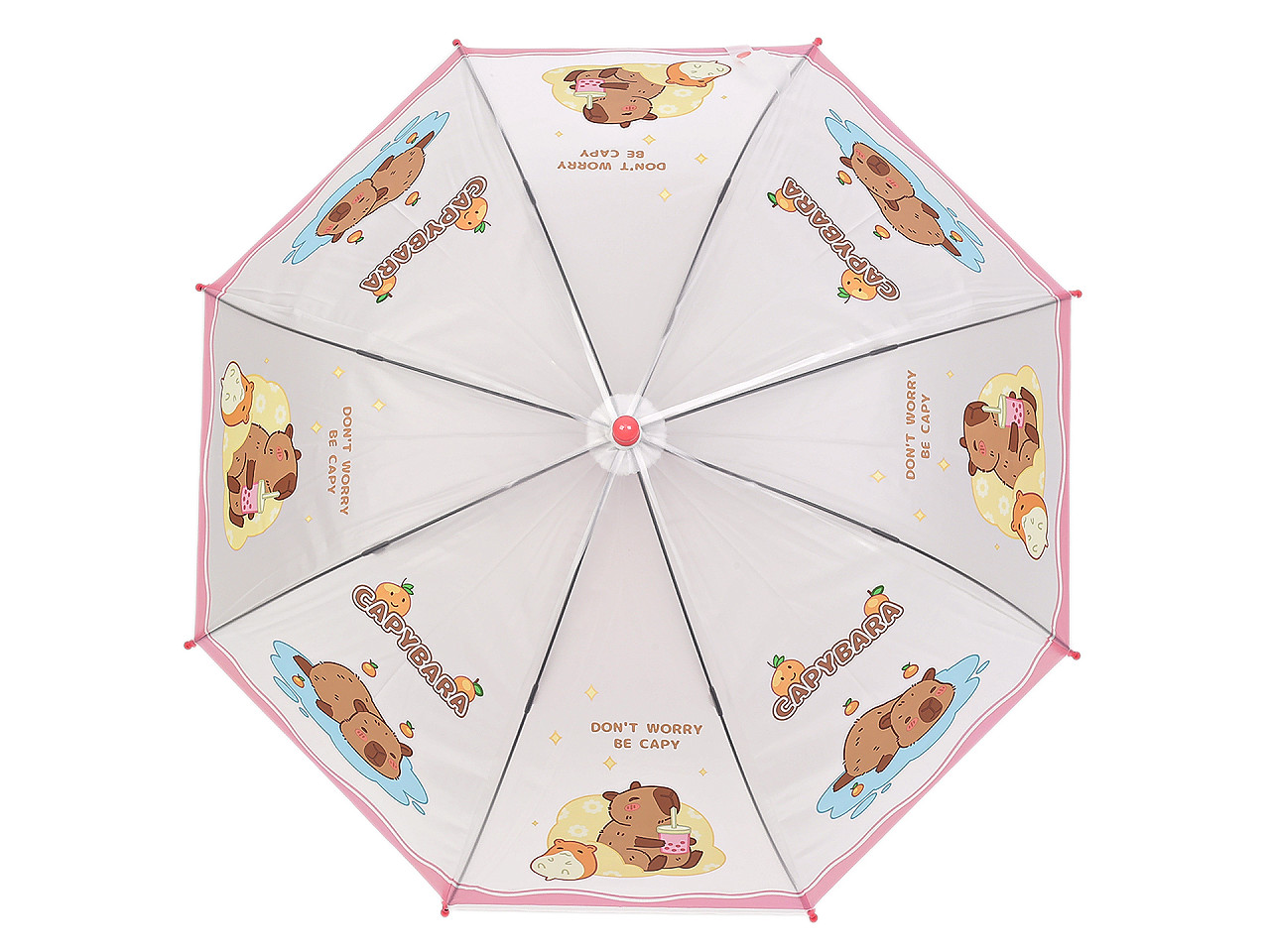 Detský vystreľovací dáždnik s motívom kapybary je ideálnym spoločníkom pre daždivé dni. Tento dáždnik je navrhnutý s ohľadom na potreby detí, kombinuje štýlový vzhľad s praktickosťou. Poťah je priesvitný, na rukoväti má dáždnik visačku, na ktorú môžete napísať meno dieťaťa. Má klasickú tyč zakončenú pevnou rukoväťou. Konštrukcia dáždnika je z pružných lamiel a tvorí osem polí. Hĺbka dáždnika je 23 cm.