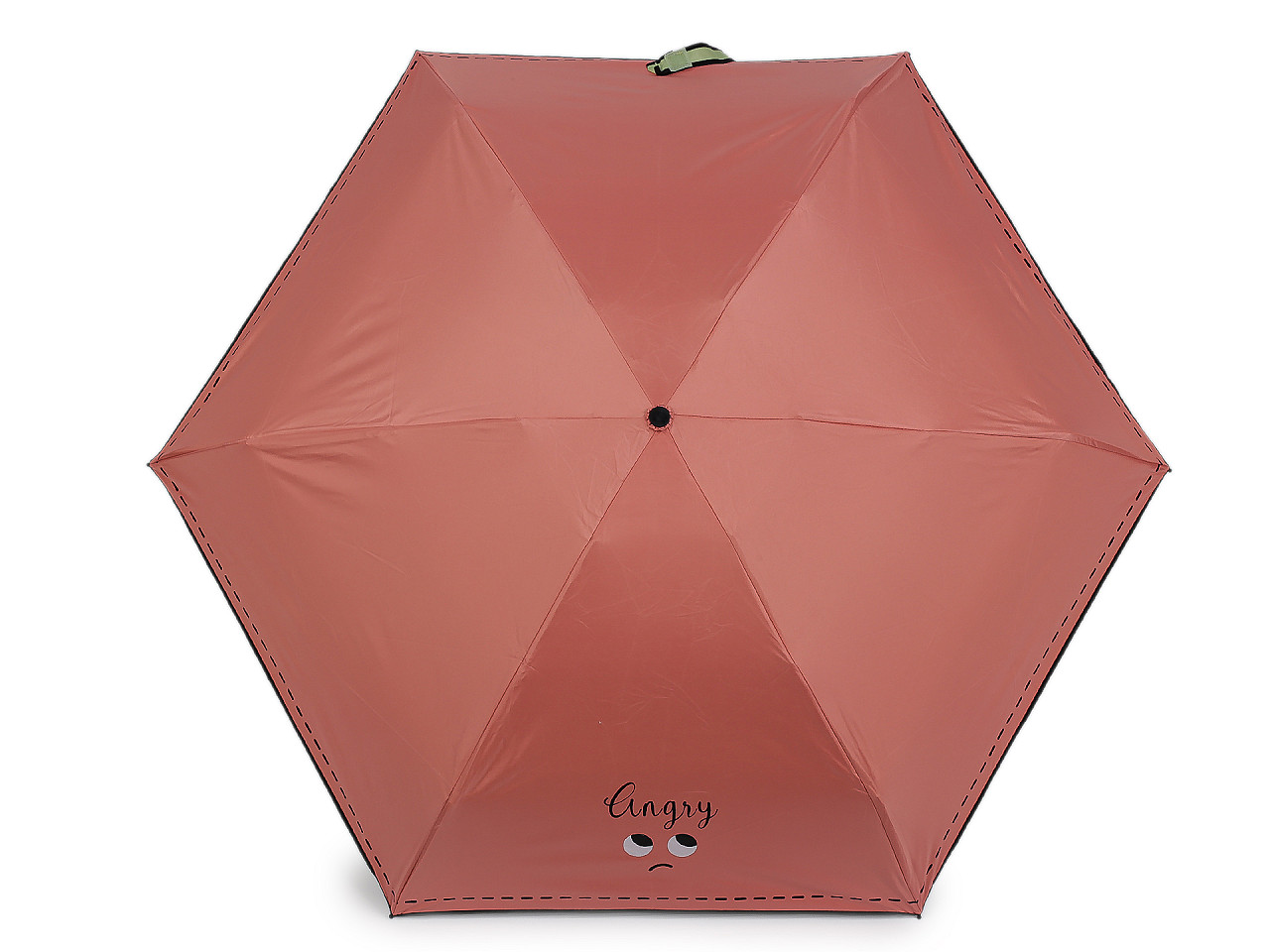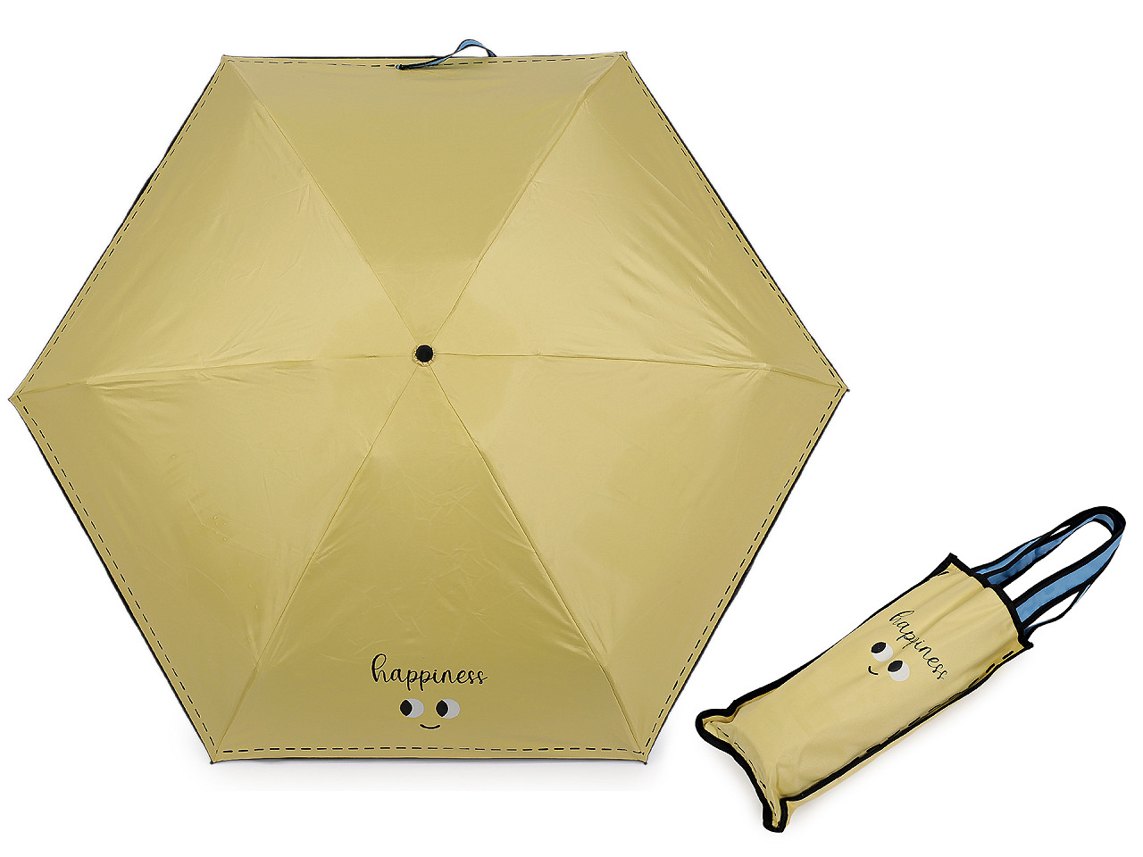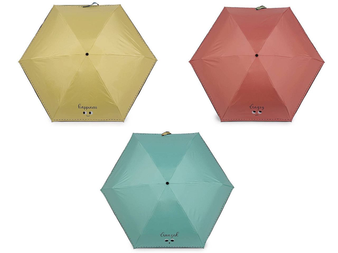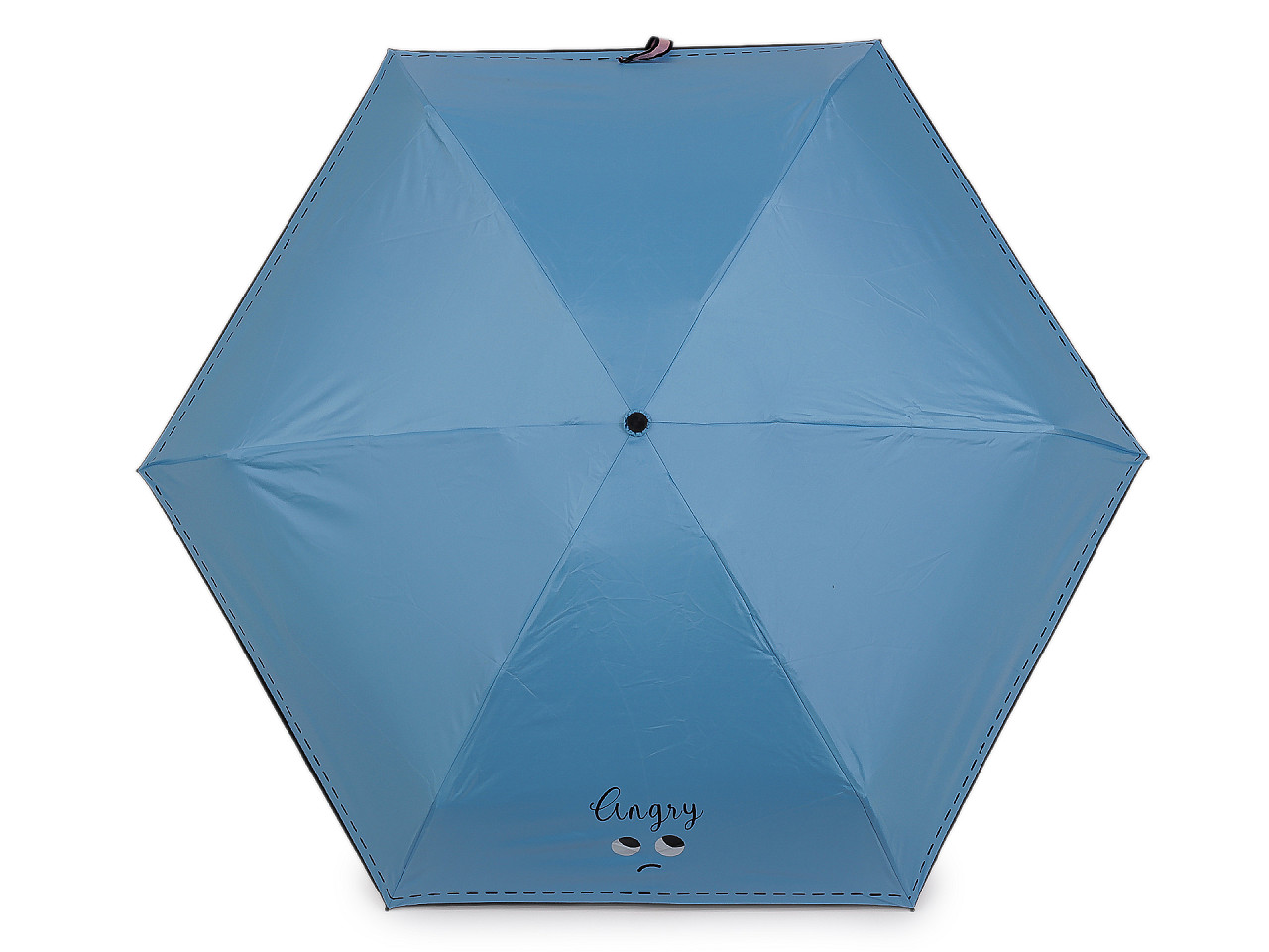Skladací mini dáždnik je vďaka malej veľkosti ľahký a skladný , pohodlne sa vám zmestí do kabelky. Na poťahu má výraz tváre s nápisom, ktorým dáte okoliu najavo, ako sa cítite. Potlačou je naznačené aj štepovanie poťahu na okraji. Iste oceníte i jeho praktické puzdro s uchami na nosenie v ruke , v tvare taštičky. Taštička má rovnakú potlač ako je na dáždniku. Konštrukcia je tvorená šiestimi poľami. Rukoväť dáždnika je plastová a opatrená pútkom. UV filter vás ochráni pred slnečným žiarením, dolná strana poťahu je čierna. Zapínanie je klasické na suchý zips. Hĺbka dáždnika je 18 cm. Celková dĺžka je 52 cm. Dĺžka zloženého dáždnika je 20 cm.