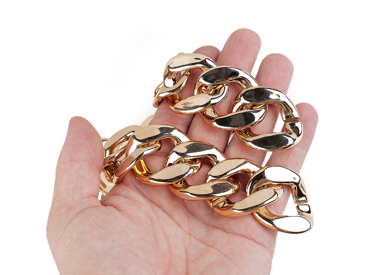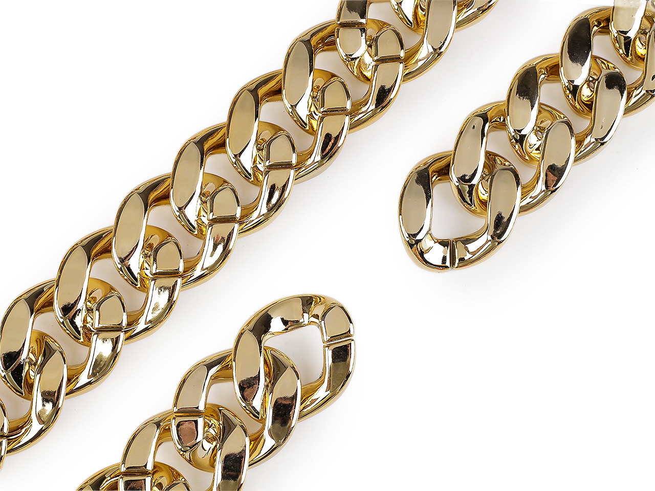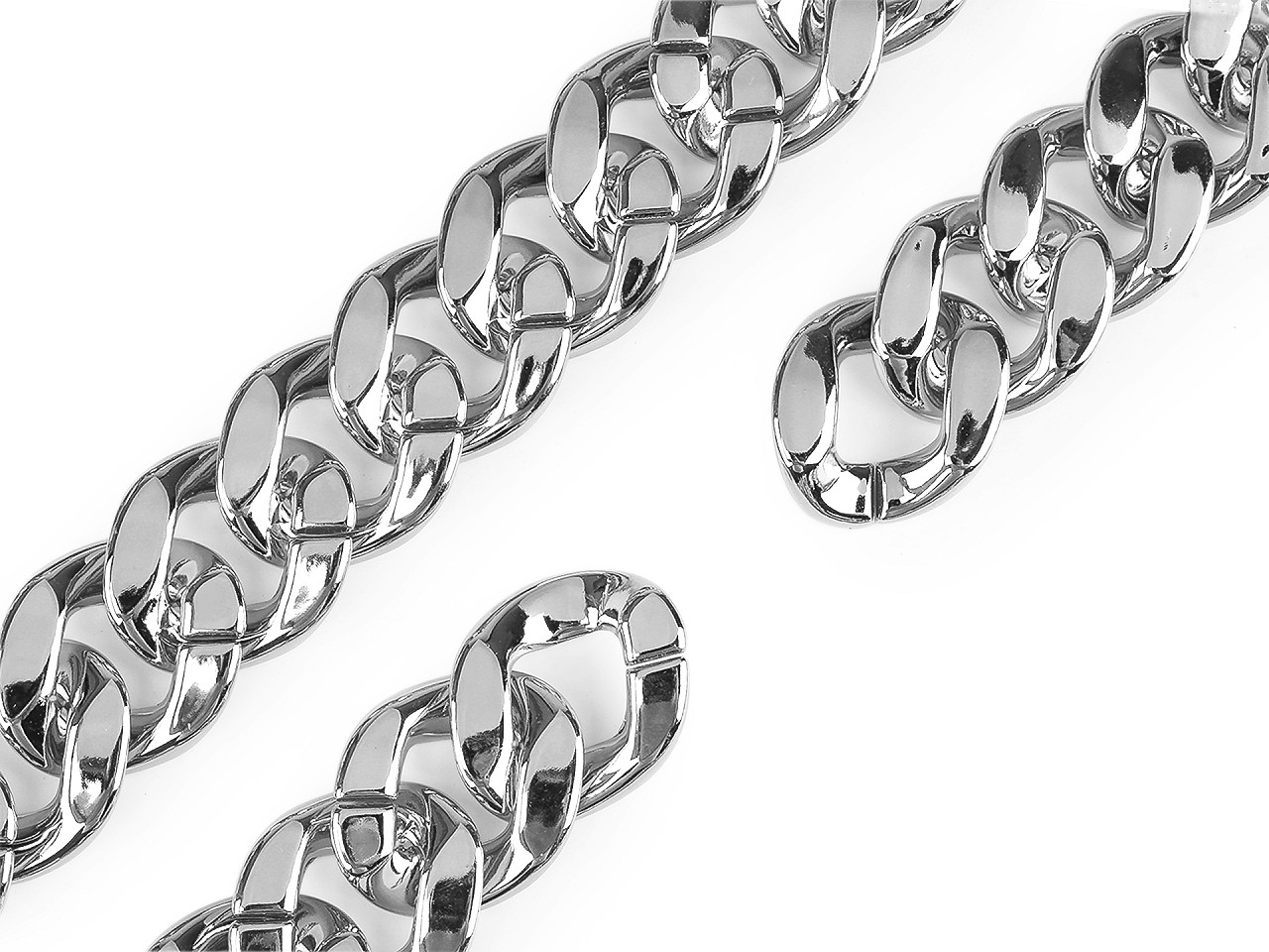 Dizajnová reťaz je vyrobená z plastu. Vďaka tomu má nízku hmotnosť . Využijete ju na zdobenie módnych doplnkov, na ozdobenie odevov, kabeliek, topánok a pod. Reťaz má lesklý metalický povrch, očká sú ploché . Je pevná, očká dobre držia, ale dajú sa aj roztvoriť. Vďaka tomu môžete reťaz skrátiť na potrebnú dĺžku. Rozmery jedného očka sú 34 x 40 mm. Odporúčame iba šetrné ručné pranie.