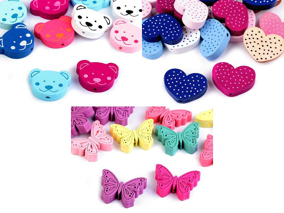 Farebný mix drevených korálikov poteší nie iba korálkárky, ale aj deti. Detaily majú zvýraznené potlačou. Ich veľkou výhodou je ľahký materiál. Dajú sa skvele kombinovať s ďalšími drevenými korálikmi, s okrúhlymi, s diskami a pod. Môžete ich navliekať na lanko alebo gumu či silón. Deti si môžu samé navliecť jednoduchý náramok z gumy.