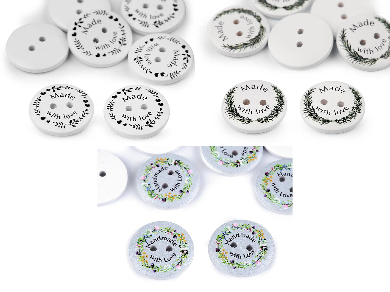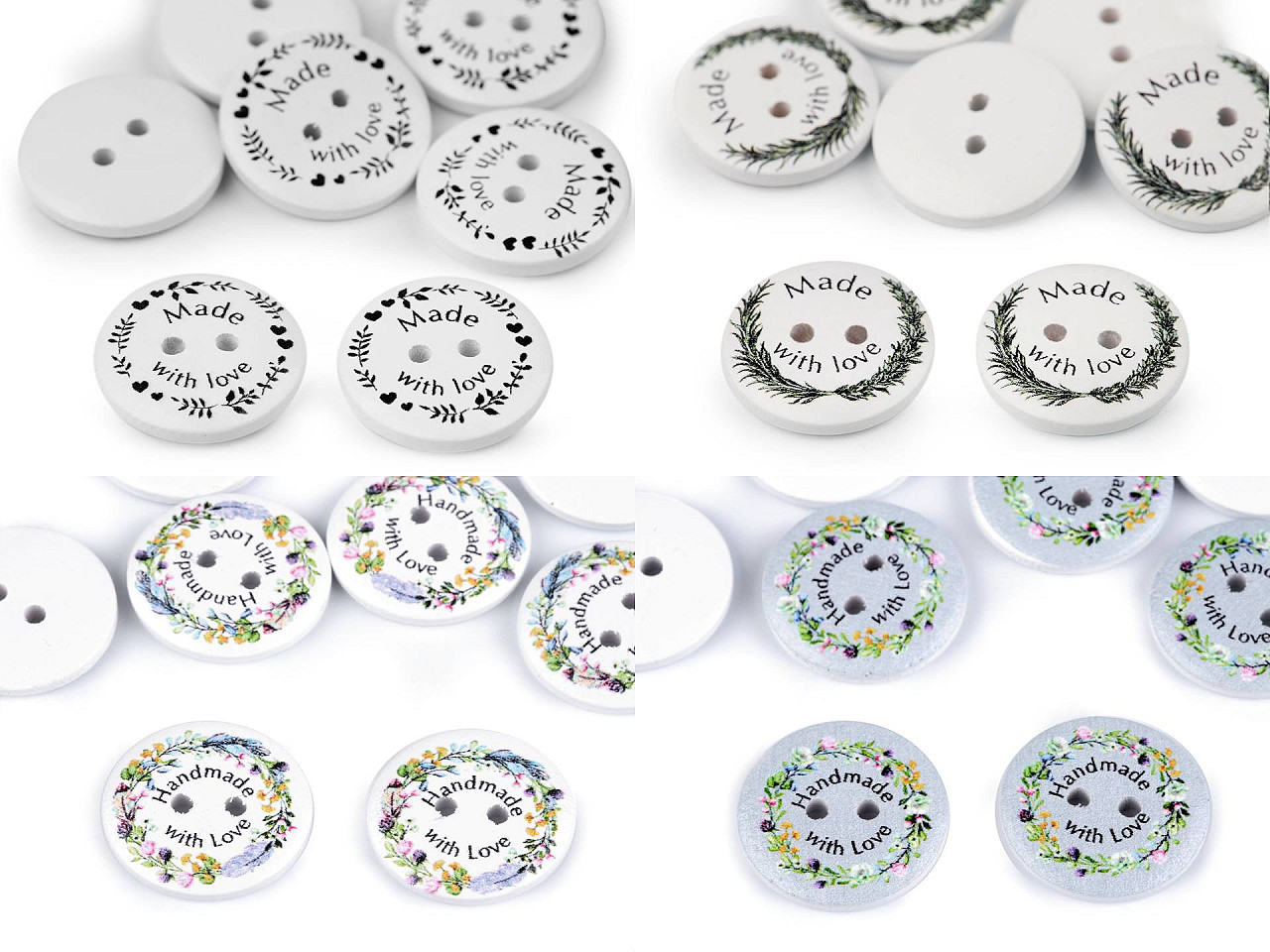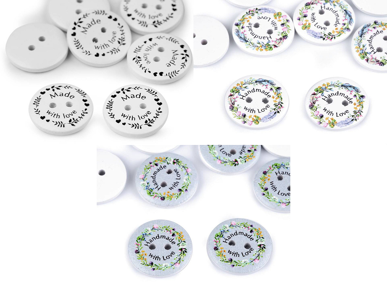 Drevené dekoračné gombíky zdobí nápis „Made with love“ a „Handmade with love“. Vyniknú na ručných výrobkoch, darčekoch a rôznych dekoráciách. Môžete ich použiť aj v scrapbookingu. Motív je jednostranný.