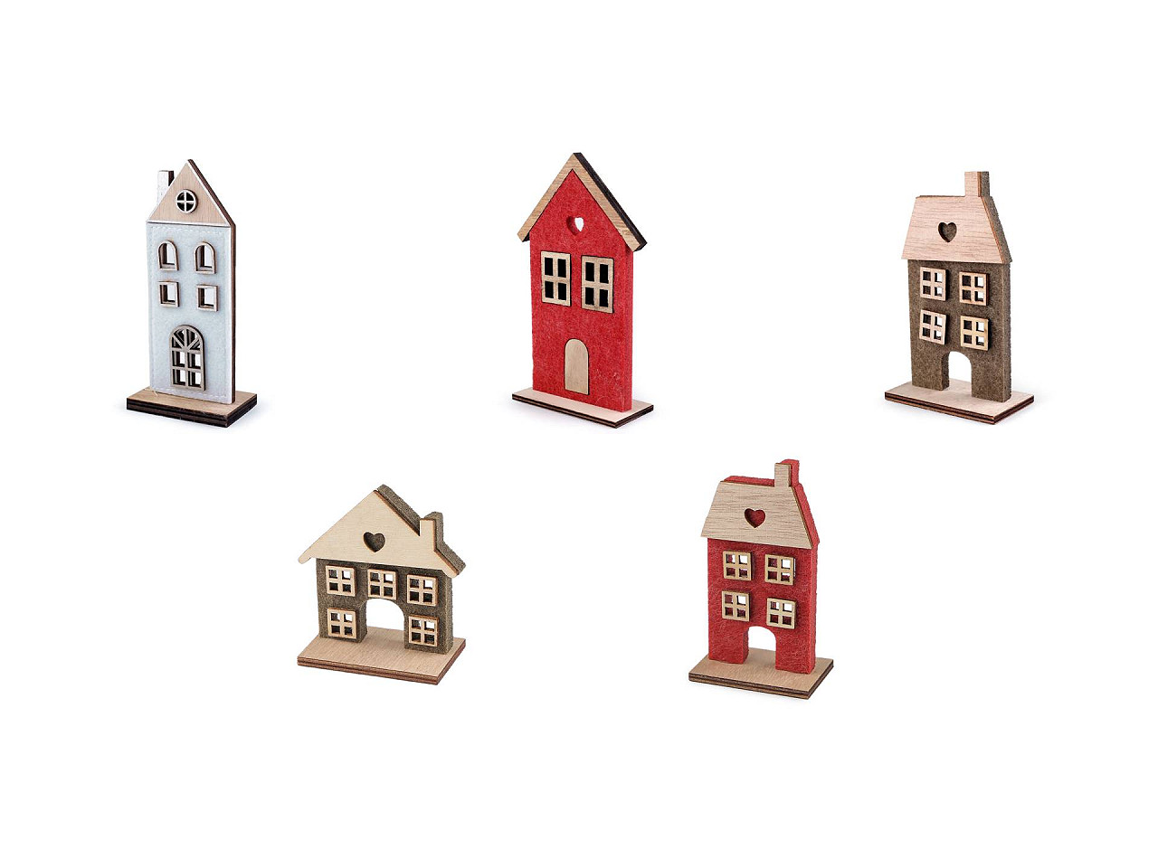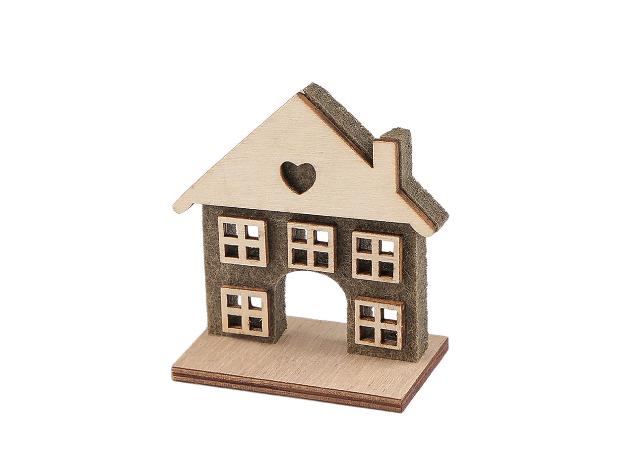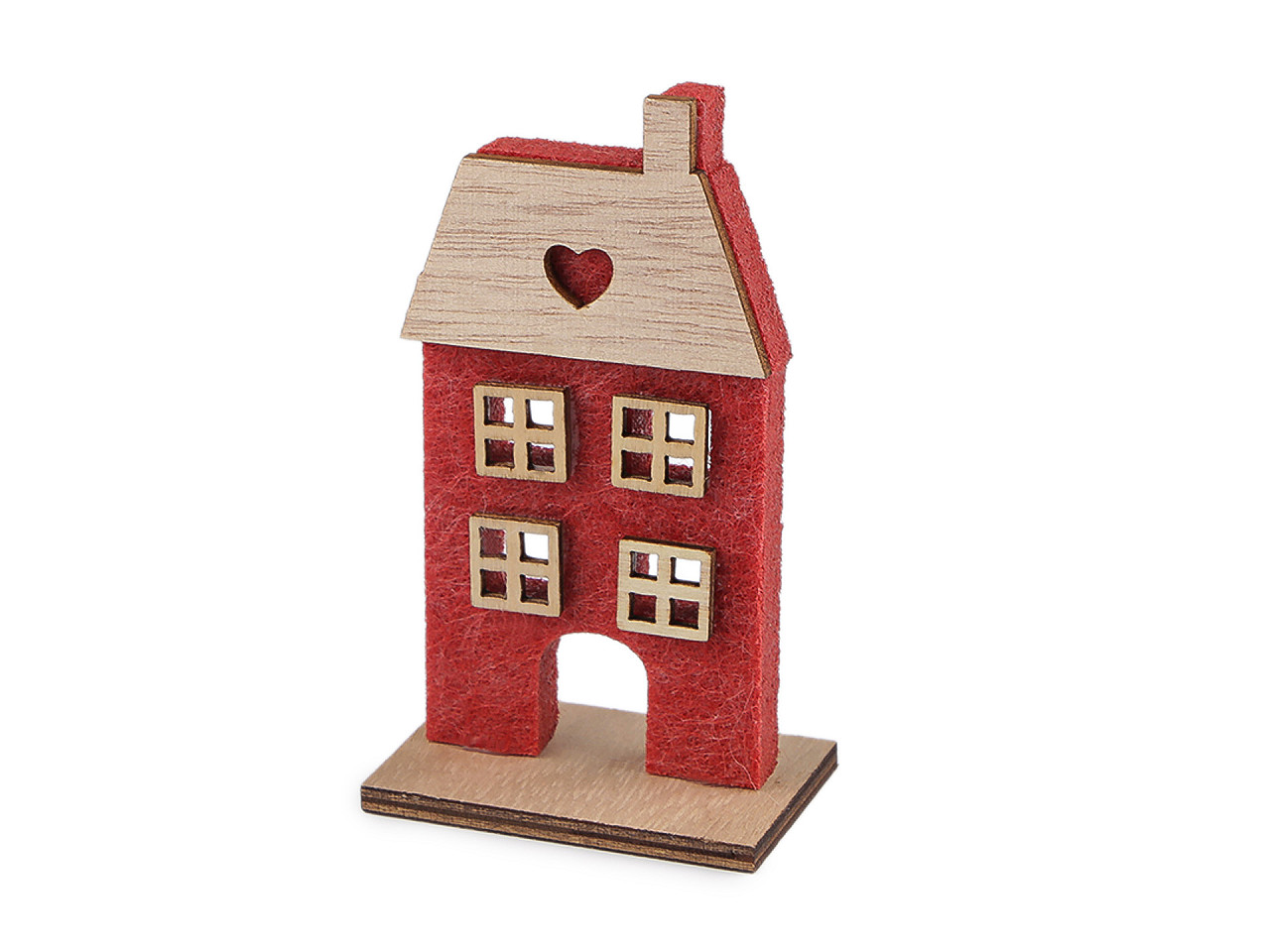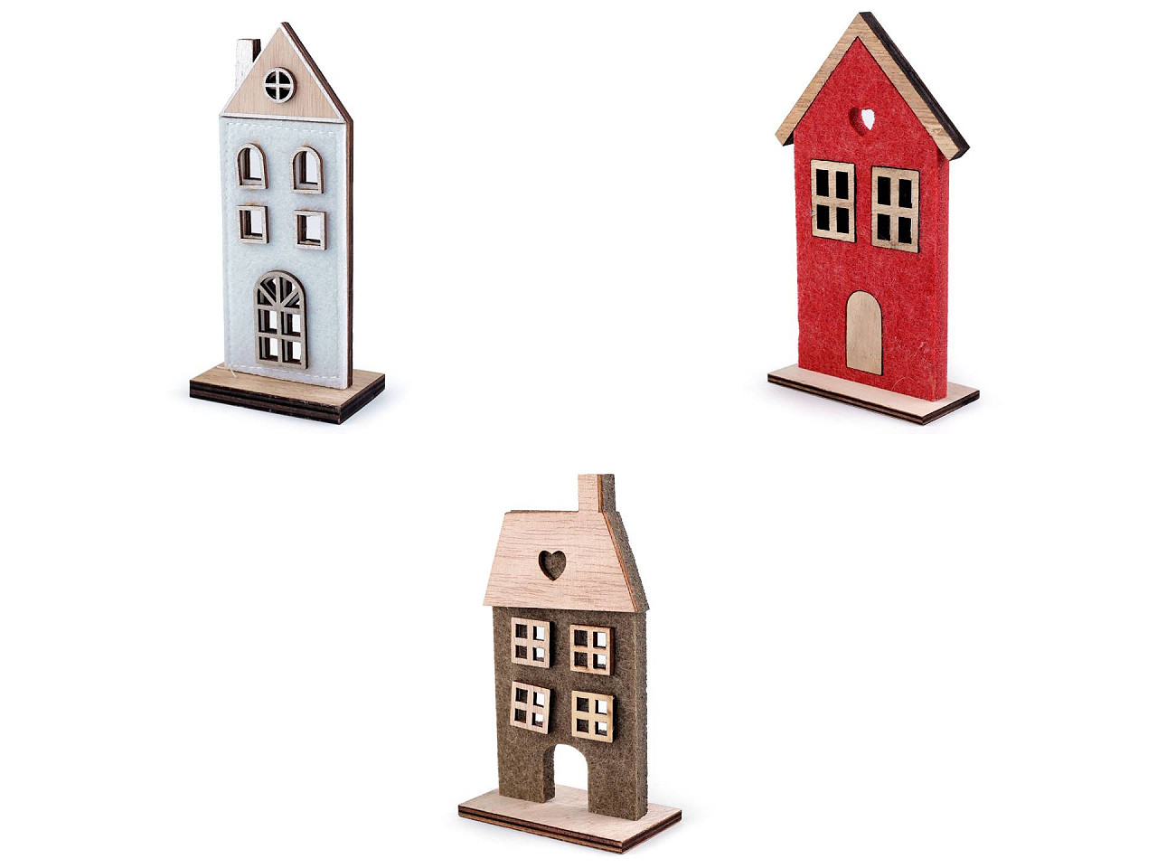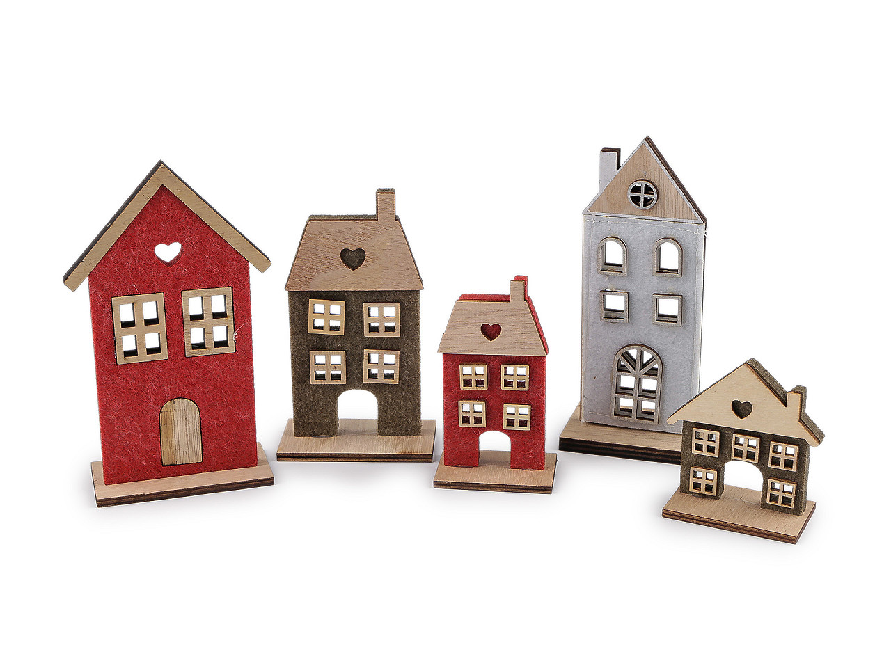Dekoračný domček môžete postaviť na parapet okna, policu alebo napríklad krbovú rímsu. Štýlovo doplní rôzne aranžmány. Materiál je v kombinácii dreva a filcu. Domčeky sú jednostranné, iba varianta č. 2 je obojstranná. Rozmery č. 1: 7 x 15,5 x 4,5 cm. Rozmery č. 2: 8 x 15 x 4 cm. Rozmery č. 3: 7,5 x 12,5 x 4 cm. Rozmery č. 4: 7,5 x 12,5 x 4 cm. Rozmery č. 5: 6 x 7,5 x 3,5 cm. Rozmery č. 6: 5,5 x 10 x 3,5 cm.