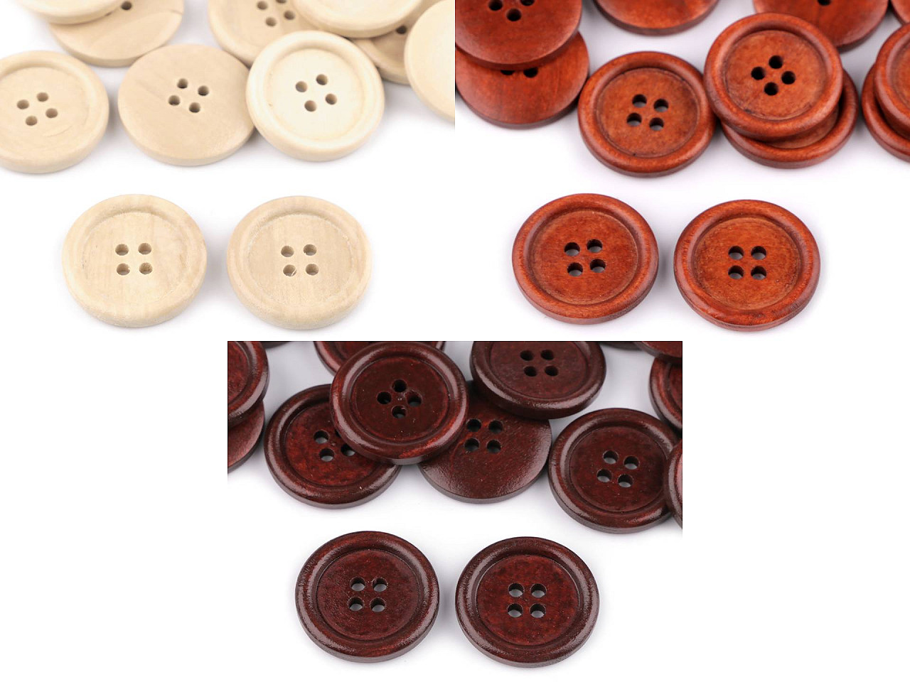 Drevené štvordierkové gombíky sú vhodné na dekoračné účely. Možno ich použiť aj na odevy, ale bez možnosti prania. Veľkosť gombíkov nájdete v tejto tabuľke .