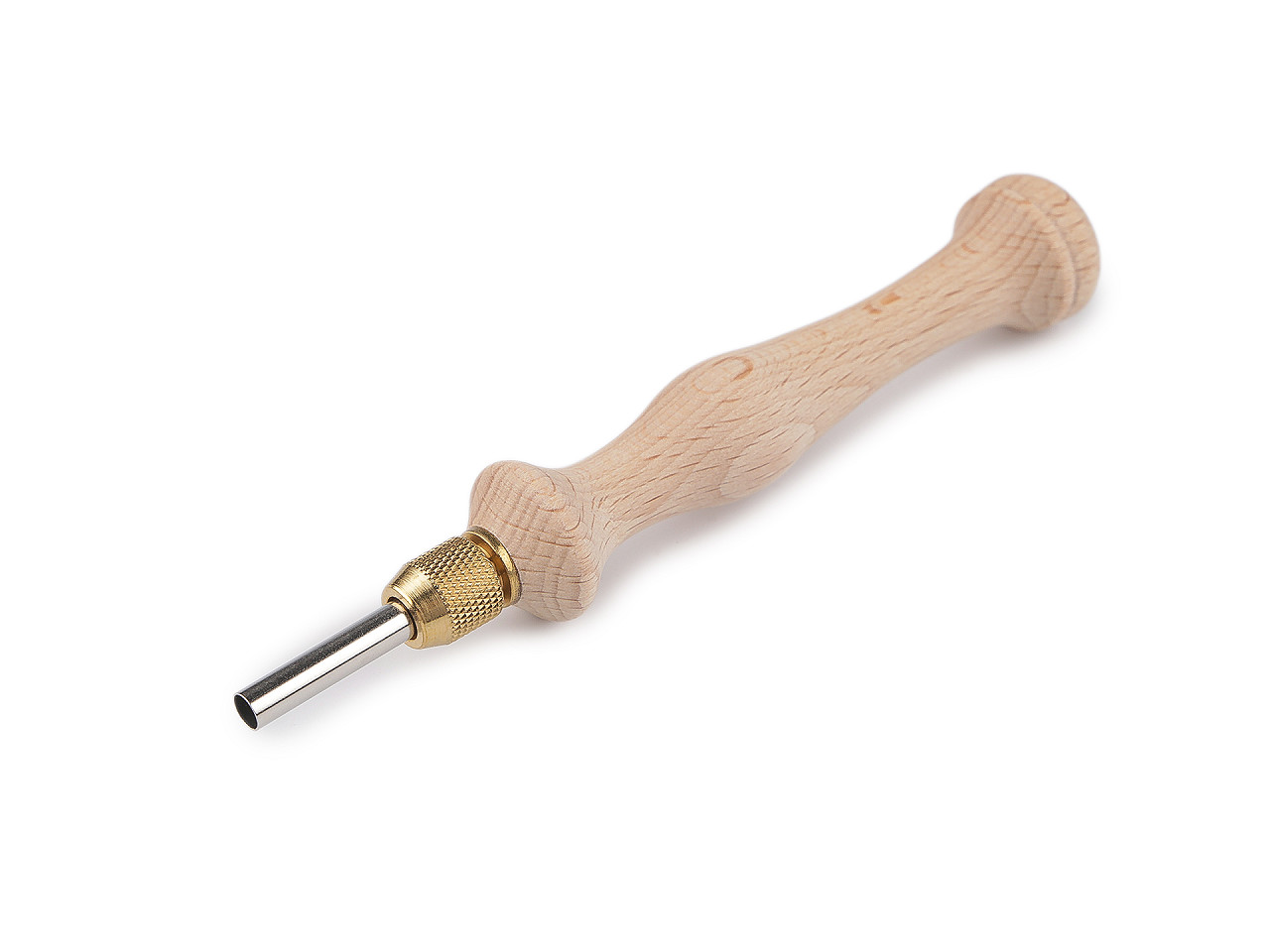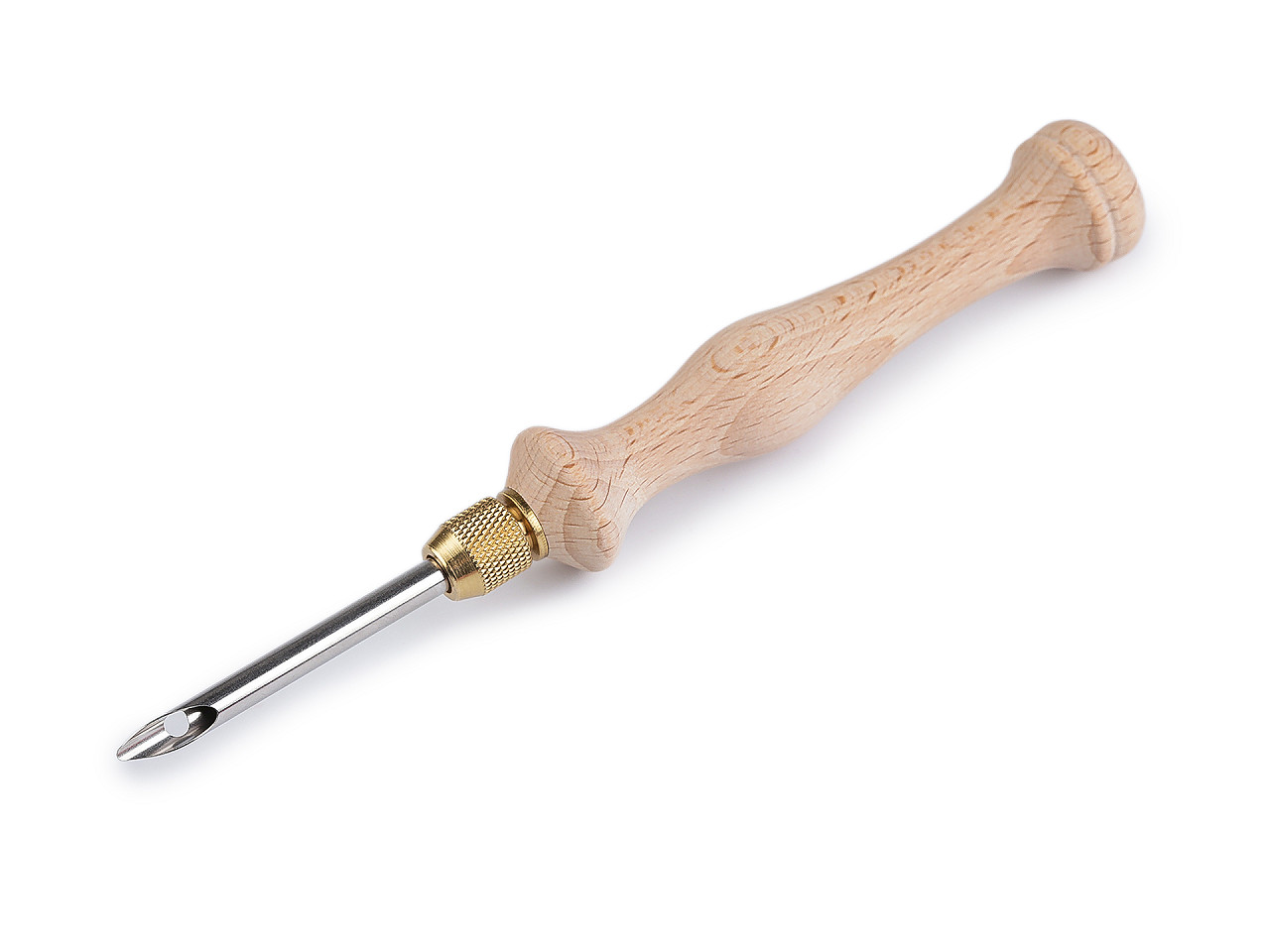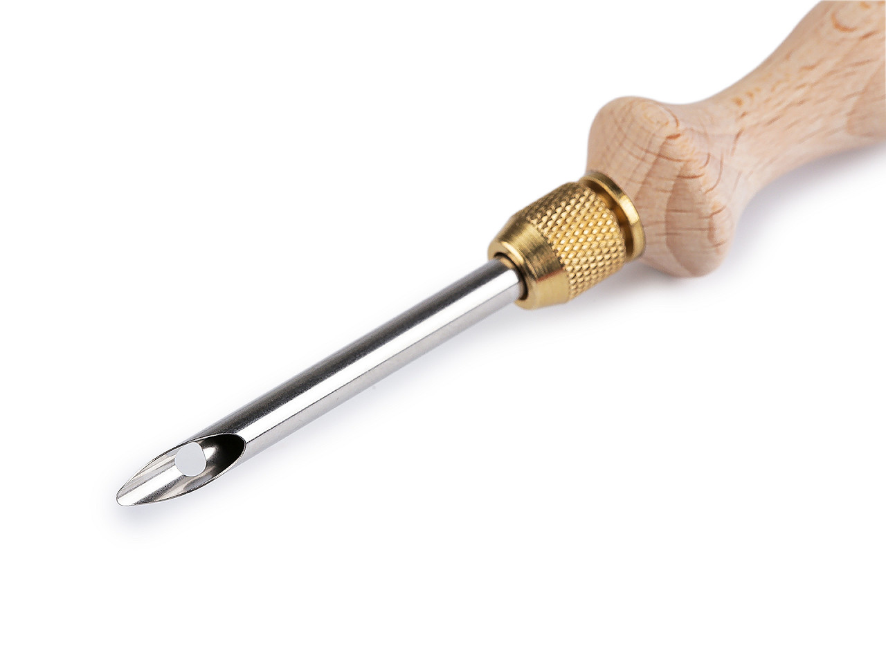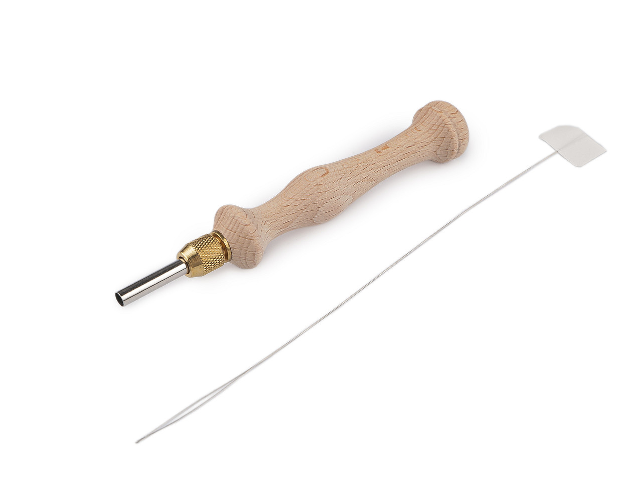 Vyšívanie s dutou ihlou je jednoduché a rýchle. Táto ihla má silnejší hrot , je preto vhodná na prácu s pletacou priadzou a zdobenie svetrov či iných pletených výrobkov . Je skrutkovacia. Ihla sa do materiálu iba vpichuje, neprevlieka sa cez. Pri vyšívaní by mala byť kolmo k látke. Priadza, ktorú budete vyšívať, sa ihlou prevlečie. Vyšíva sa tak, že materiál prepichnete a ihlu povytiahnete späť tesne nad ním, hrot posuniete kúsok v smere vyšívania a opakujete. Snažte sa za priadzu veľmi neťahať, inak sa stehy budú párať. Kým sa celý motív zozadu nepodlepí napríklad vlizelínom, môže sa celý naraz vypárať, nie je zozadu nijako zafixovaný. Rukoväť na ihle je z nelakovaného dreva.