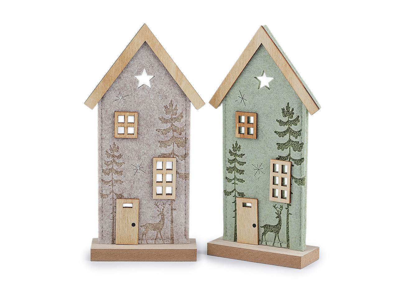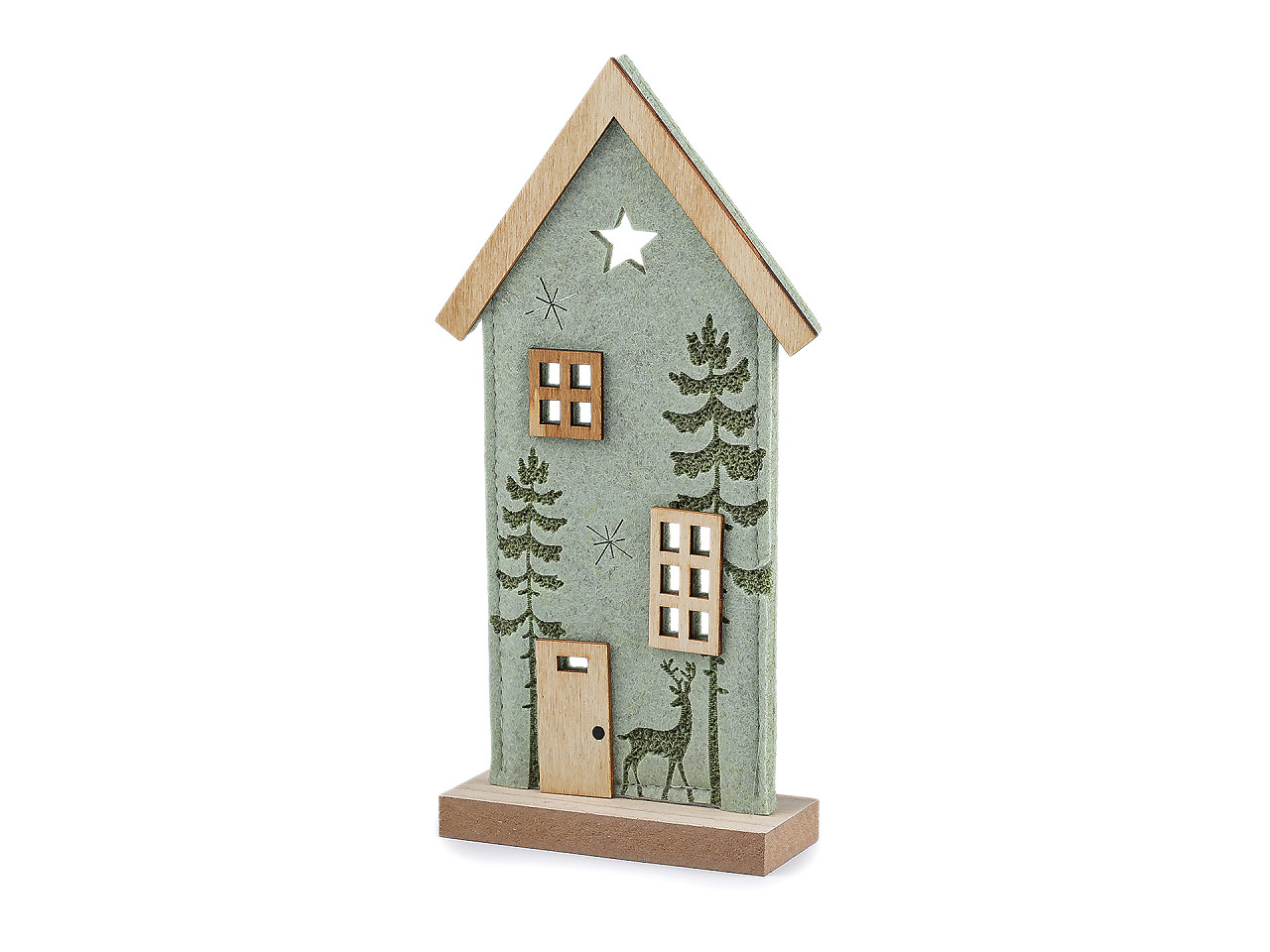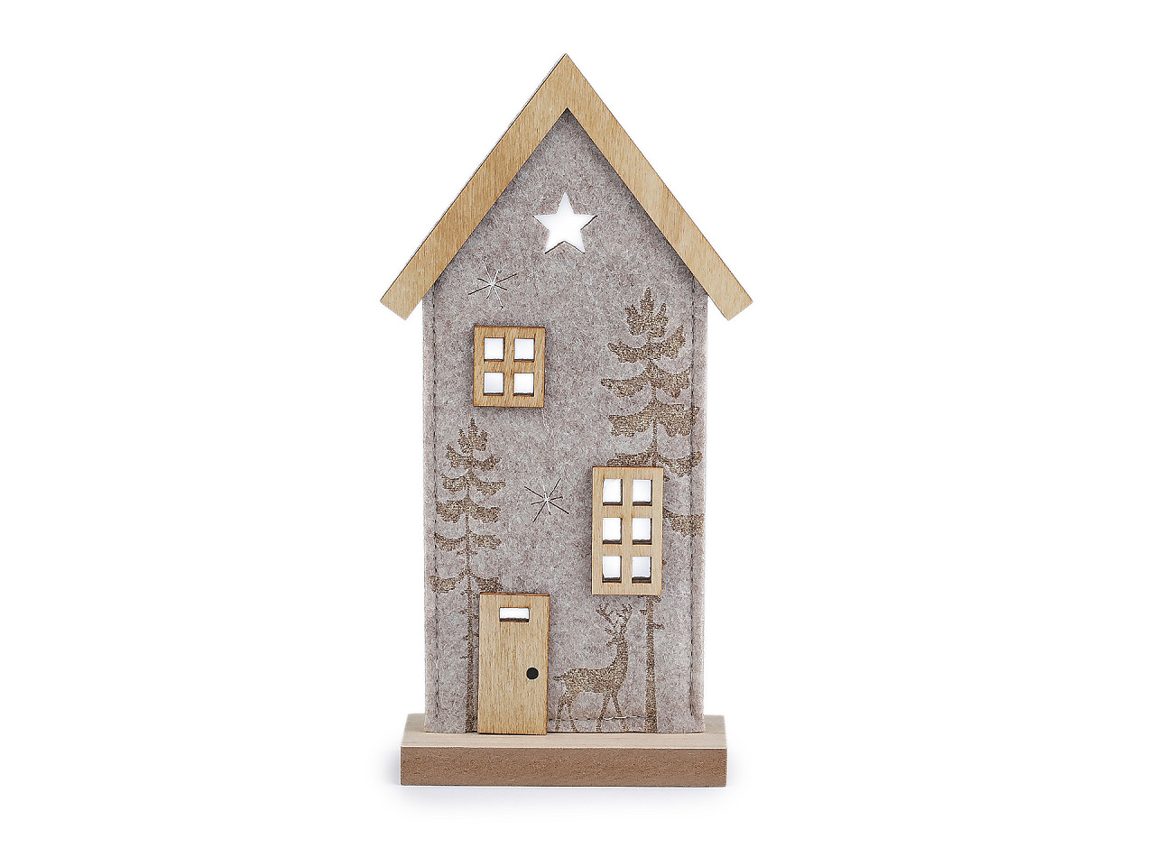 Dekoračný domček má základ z pevného filcu a strechu, podstavec a detaily z dreva. Prednú stranu zdobí motív lesa s jeleňom a výrezmi hviezd . Zútulní každý interiér. Domček je ideálny na rôzne sezónne a sviatočné obdobia, zvlášť ako štýlová vianočná dekorácia. Môžete ho umiestniť na krbovú rímsu, okenný parapet, poličku alebo vynikne ako súčasť väčšej dekoratívnej kompozície na stole.