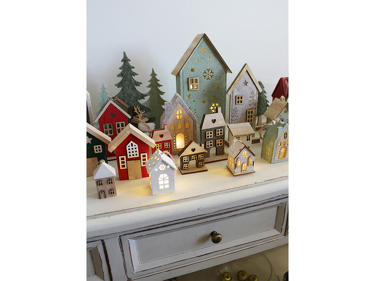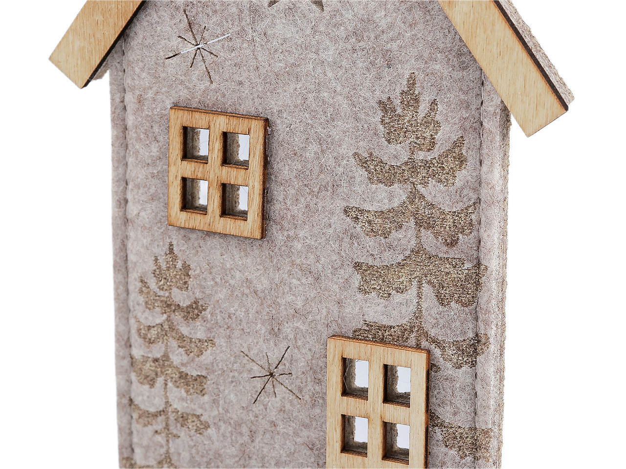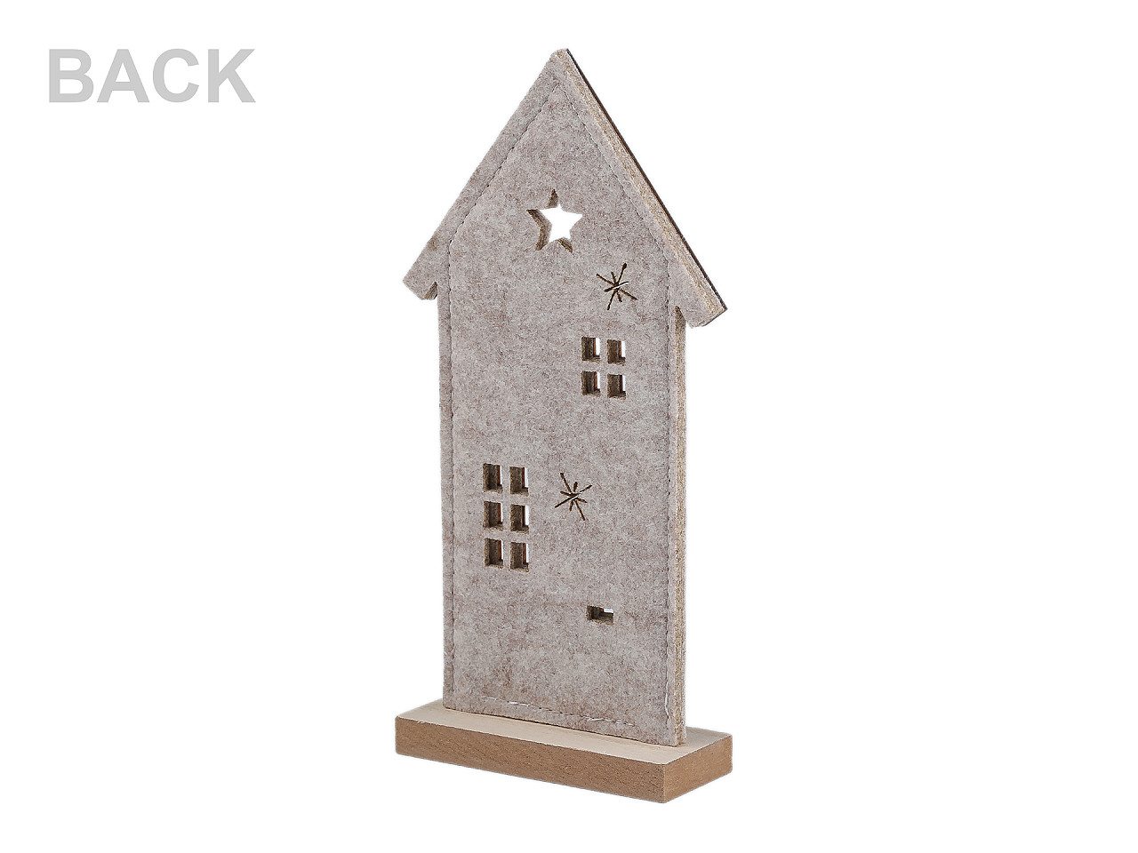 Dekoračný domček má základ z pevného filcu a strechu, podstavec a detaily z dreva. Prednú stranu zdobí motív lesa s jeleňom a výrezmi hviezd . Zútulní každý interiér. Domček je ideálny na rôzne sezónne a sviatočné obdobia, zvlášť ako štýlová vianočná dekorácia. Môžete ho umiestniť na krbovú rímsu, okenný parapet, poličku alebo vynikne ako súčasť väčšej dekoratívnej kompozície na stole.